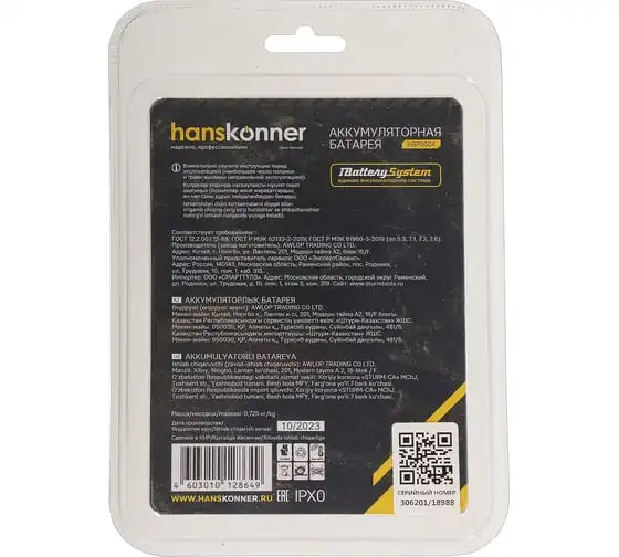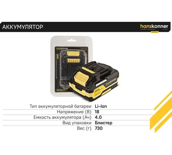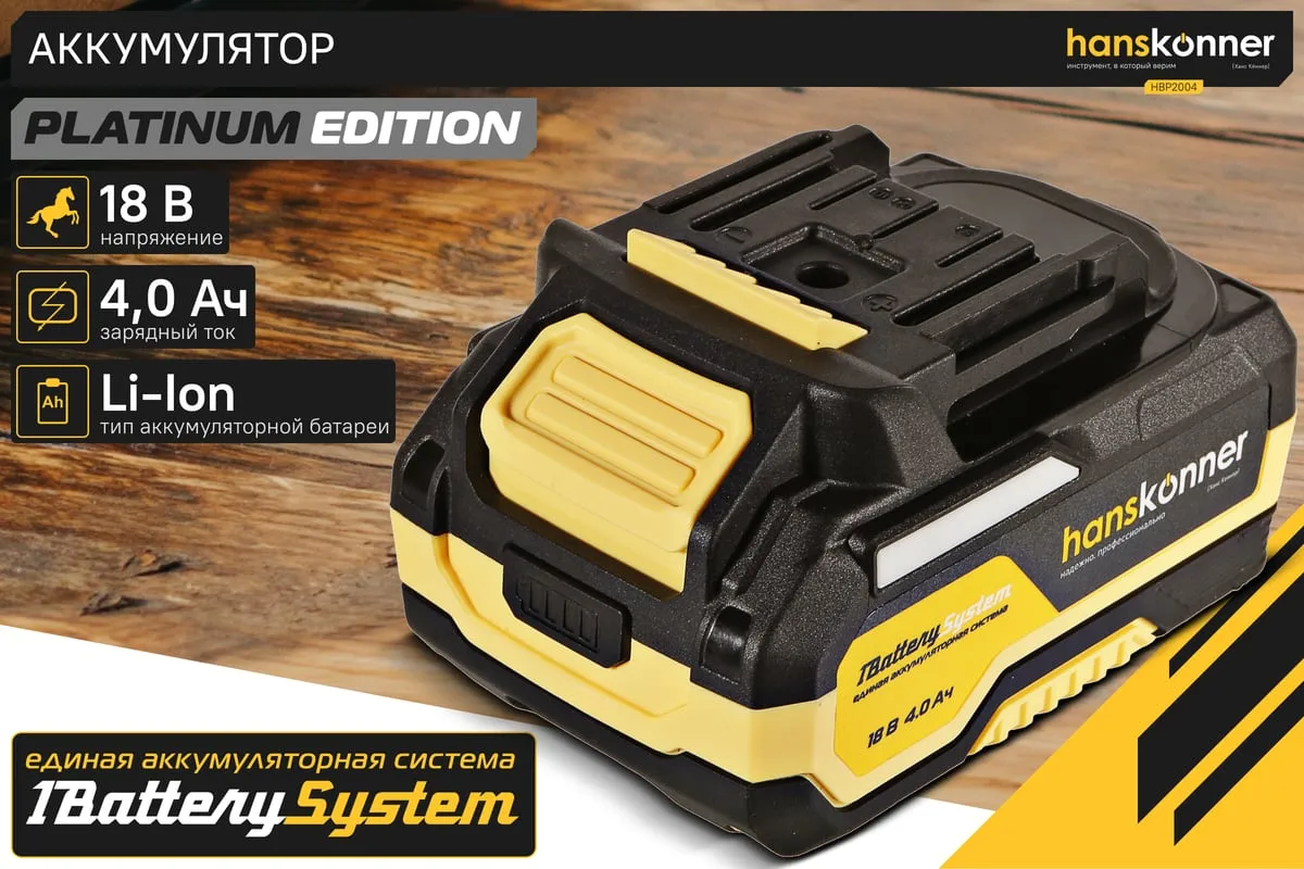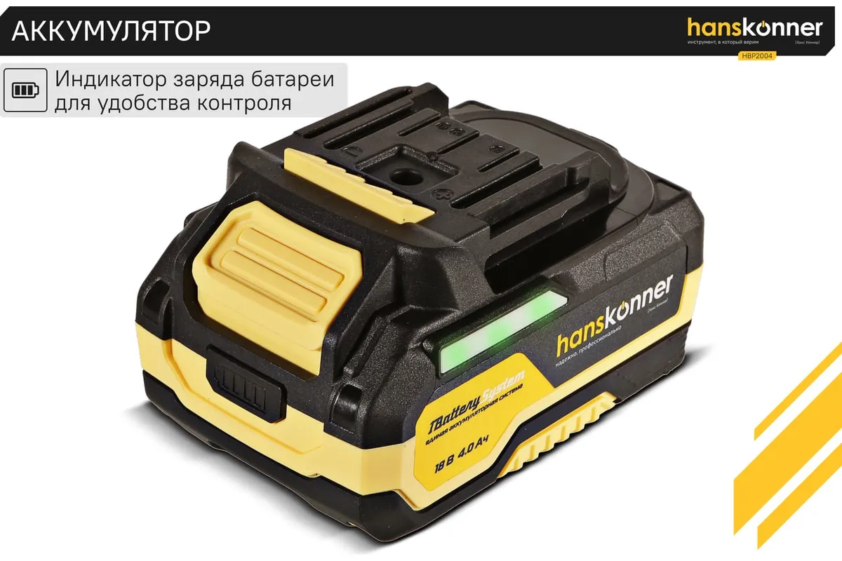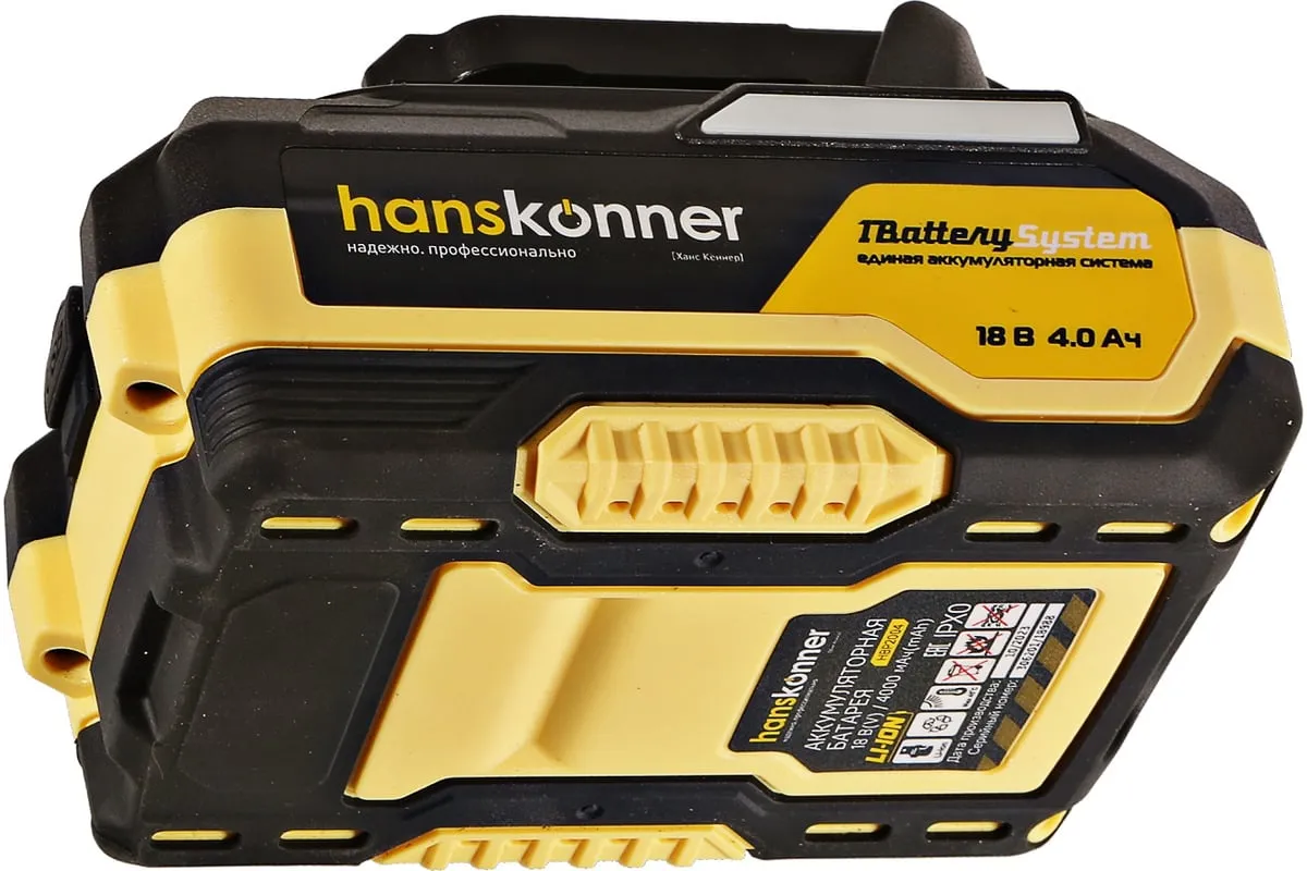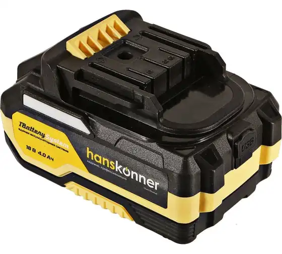 18-вольтовый аккумулятор HBP2004 Hanskonner емкостью 4.0 Ач обеспечивает впечатляющую мощность и совместим с любым инструментом единой аккумуляторной системы 1BatterySystem. Собственная система защиты от перегрузки, перегрева и глубокого разряда для полной непрерывности в работе. Эргономичный корпус из ударопрочного нейлона с резиновыми противоударными вставками обеспечивают защиту аккумулятора от повреждений. Понятный индикатор для удобства контроля заряда батареи. USB-разъем позволит использовать аккумулятор как пауэр-банк для зарядки ваших гаджетов.
