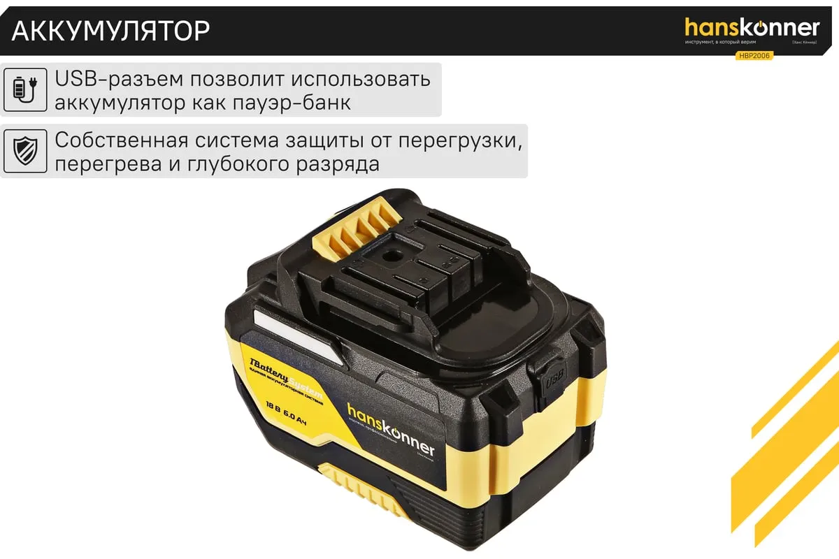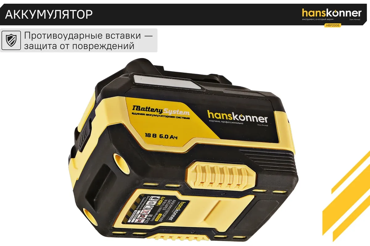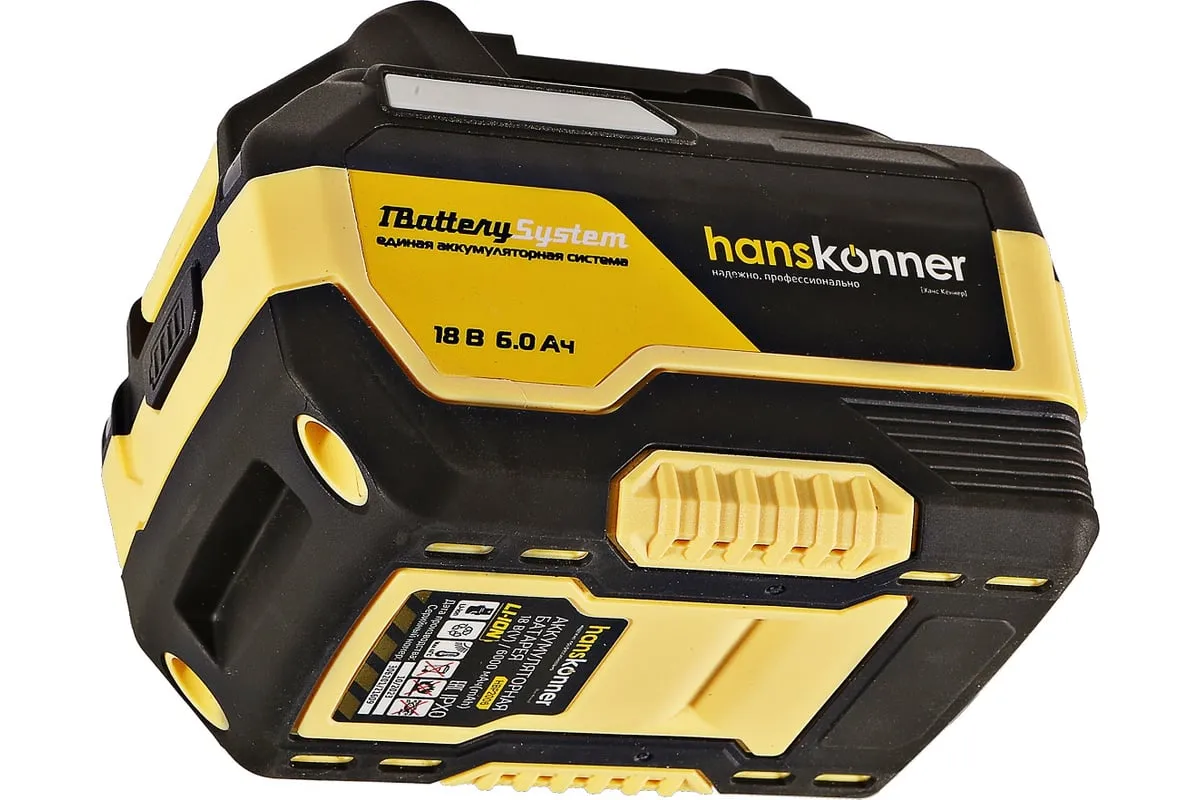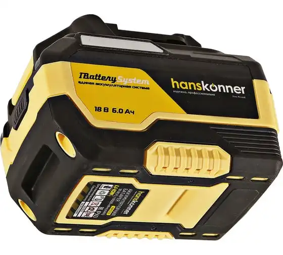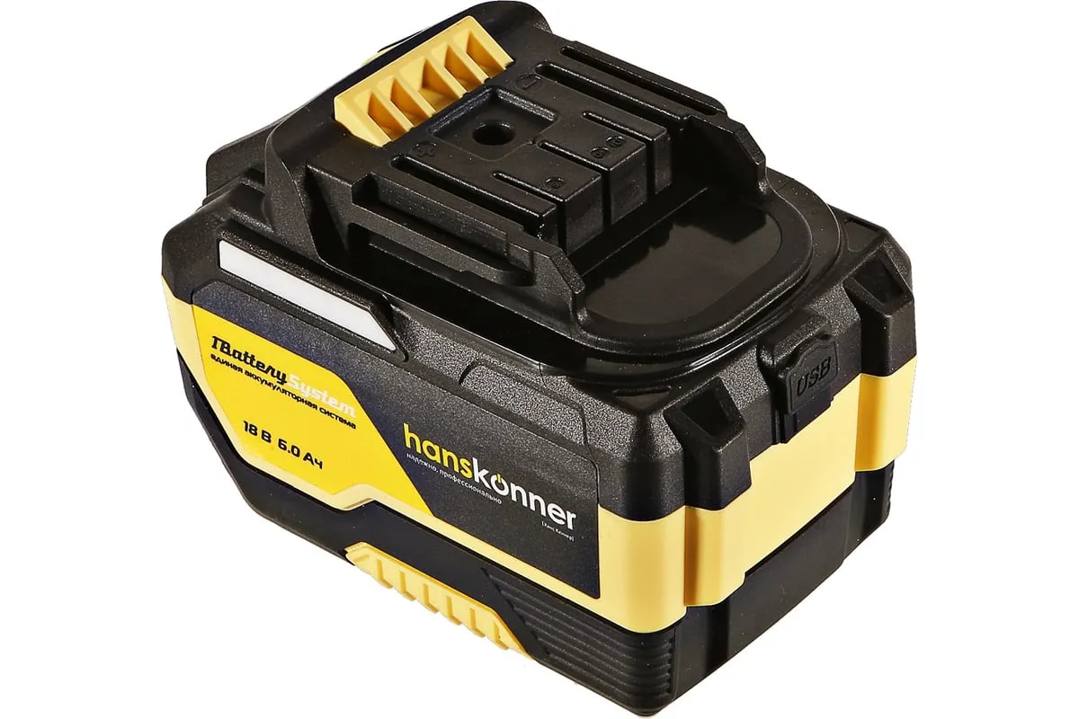 18-вольтовый аккумулятор HBP2006 Hanskonner емкостью 6.0 Ач обеспечивает впечатляющую мощность и совместим с любым инструментом единой аккумуляторной системы 1BatterySystem. Собственная система защиты от перегрузки, перегрева и глубокого разряда для полной непрерывности в работе. Эргономичный корпус из ударопрочного нейлона с резиновыми противоударными вставками обеспечивают защиту аккумулятора от повреждений. Понятный индикатор для удобства контроля заряда батареи. USB-разъем позволит использовать аккумулятор как пауэр-банк для зарядки ваших гаджетов.