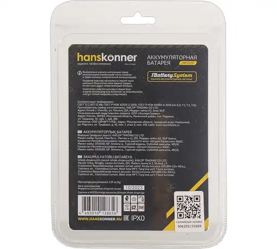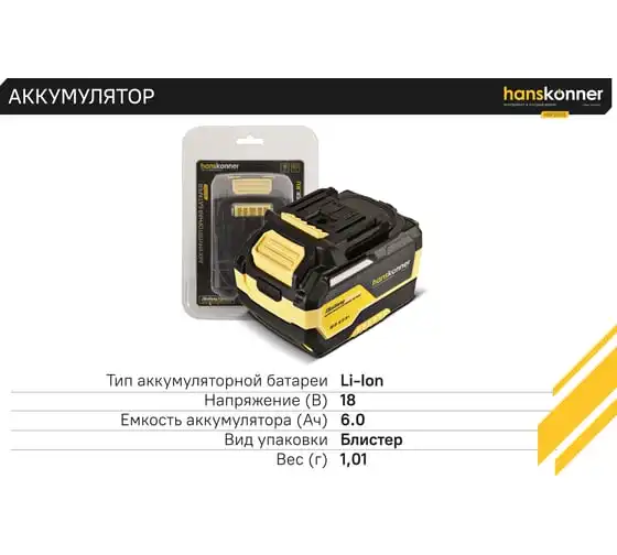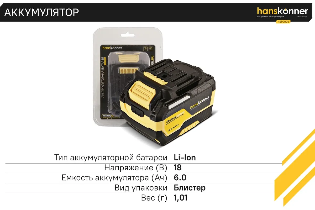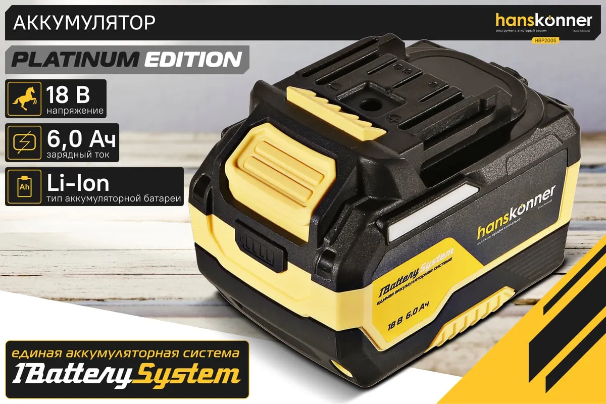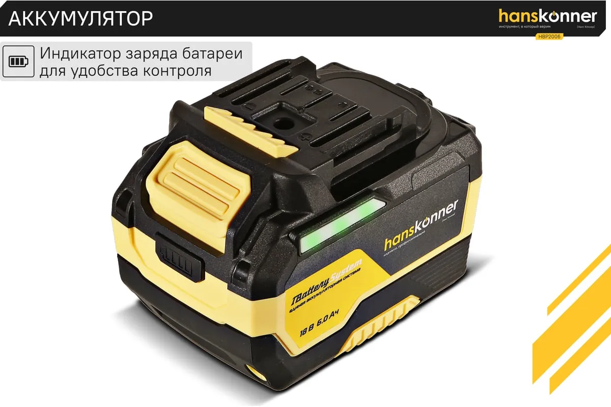 18-вольтовый аккумулятор HBP2006 Hanskonner емкостью 6.0 Ач обеспечивает впечатляющую мощность и совместим с любым инструментом единой аккумуляторной системы 1BatterySystem. Собственная система защиты от перегрузки, перегрева и глубокого разряда для полной непрерывности в работе. Эргономичный корпус из ударопрочного нейлона с резиновыми противоударными вставками обеспечивают защиту аккумулятора от повреждений. Понятный индикатор для удобства контроля заряда батареи. USB-разъем позволит использовать аккумулятор как пауэр-банк для зарядки ваших гаджетов.