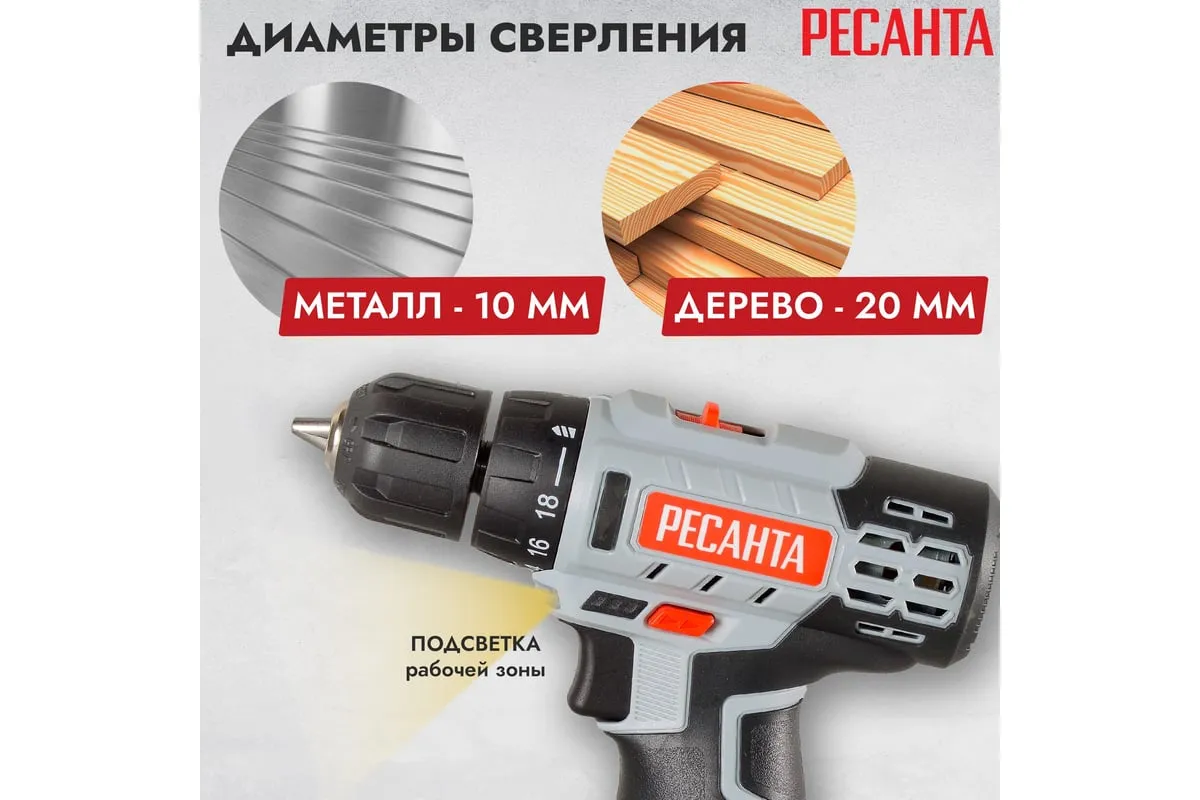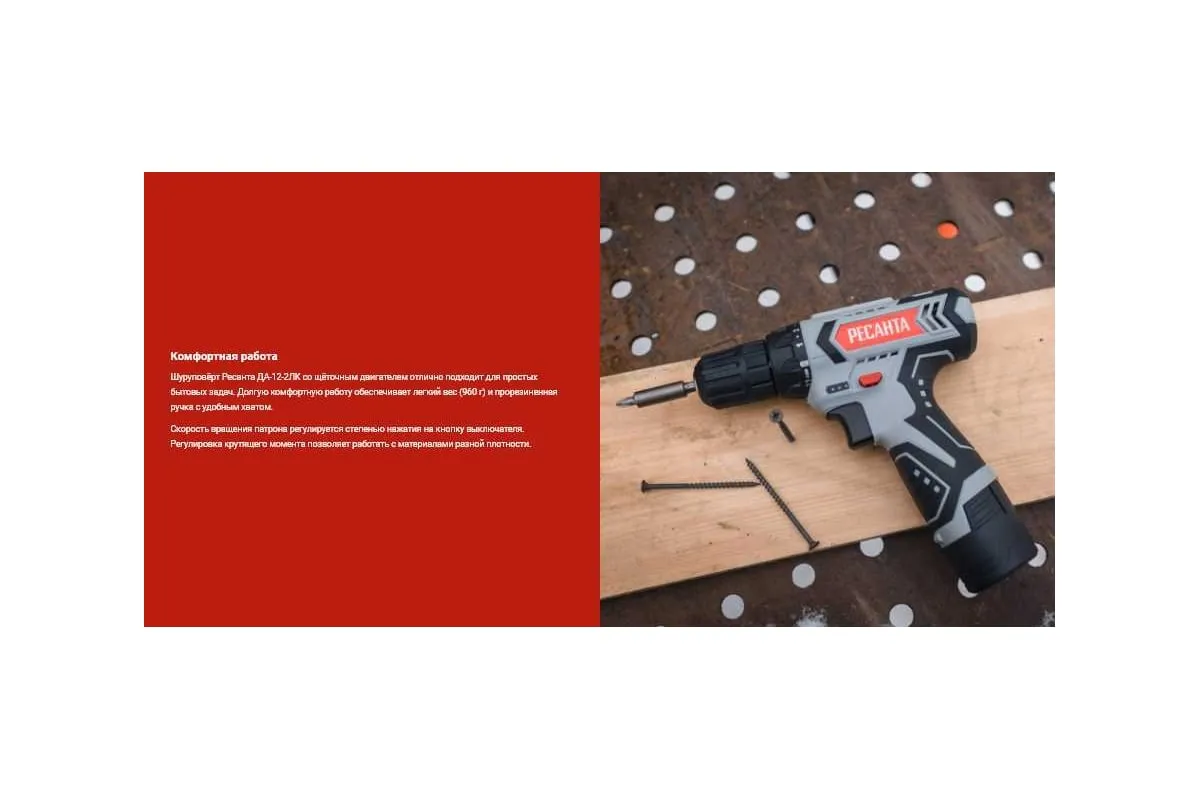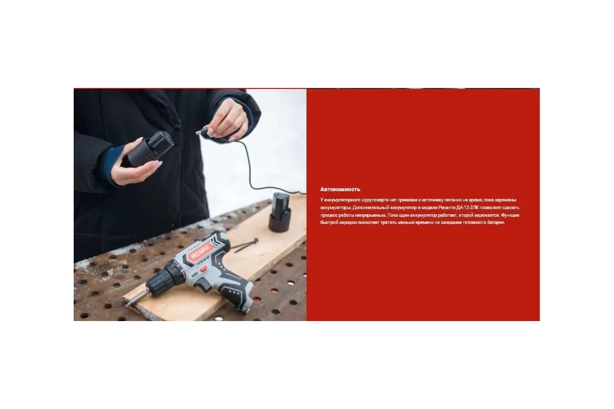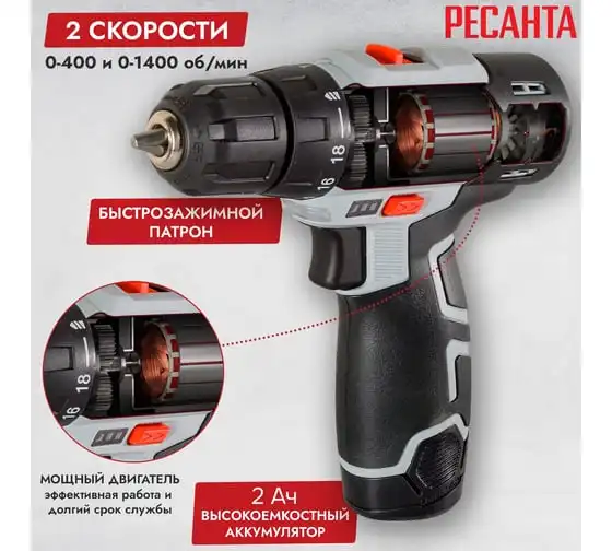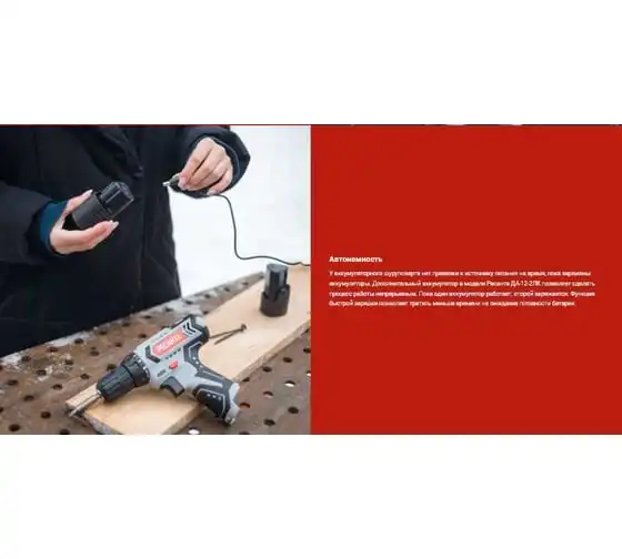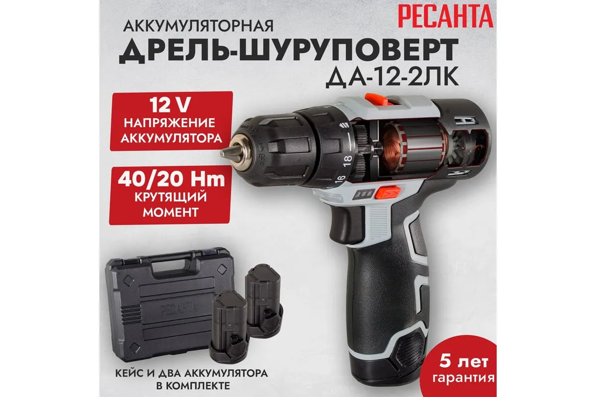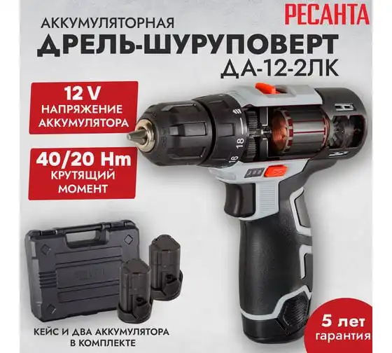 Дрель-шуруповерт Ресанта ДА-12-2ЛК используется в быту для сверления отверстий в деревянных, металлических и пластиковых поверхностях, а также для закручивания крепежных элементов. Наличие двух аккумуляторов типа Li-ion с напряжением 12 В обеспечивает удобство применения вне зависимости от электросети. Емкость 2 А*ч гарантирует длительность непрерывной работы. Время зарядки составляет 60 мин.