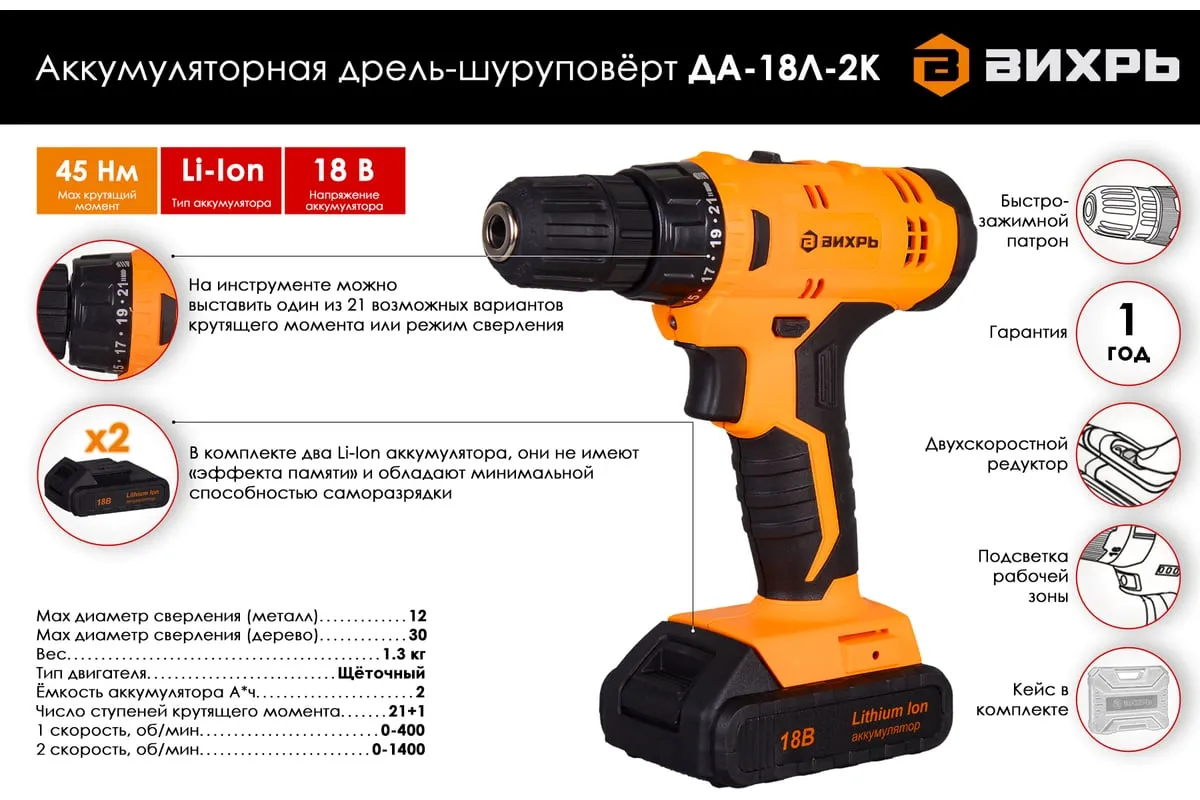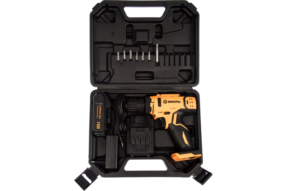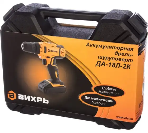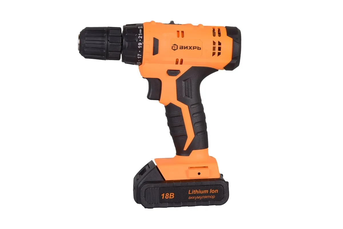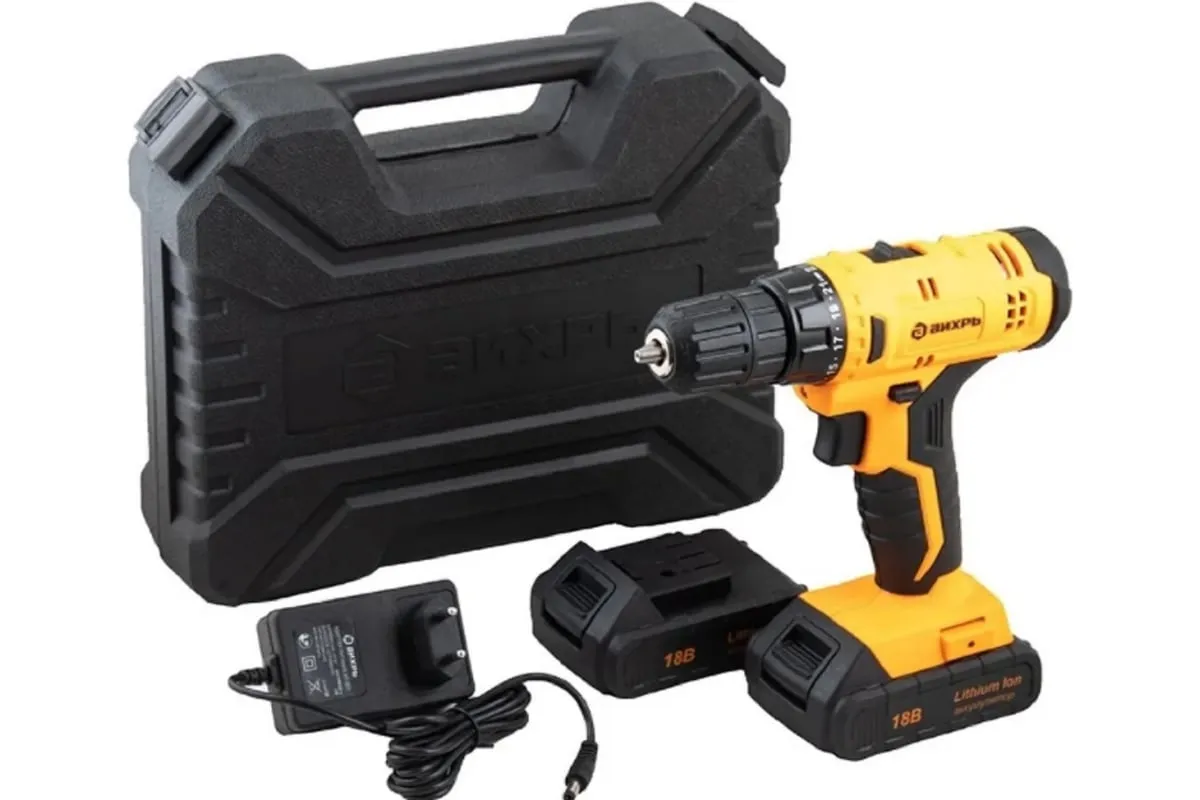 Дрель-шуруповерт ВИХРЬ ДА-18Л-2К упростит работы по сверлению отверстий и вкручиванию крепежа.