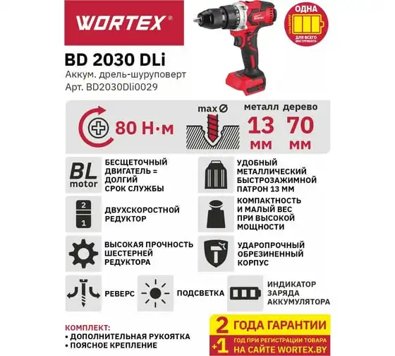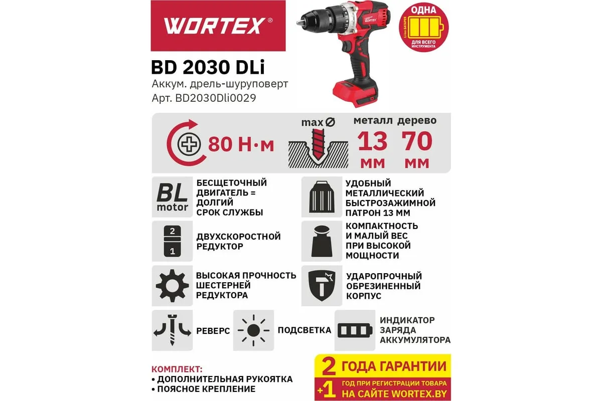 Аккумуляторная дрель-шуруповерт WORTEX BD 2030 Dli ALL1 BD2030Dli0029 подойдет для общестроительных работ.