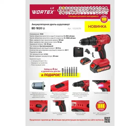 Аккумуляторная дрель-шуруповерт WORTEX LX BD 1820 Li 0329076 оснащена надежным двигателем с высоким крутящим моментом и двухскоростным редуктором. Имеет 10 мм быстрозажимной патрон.