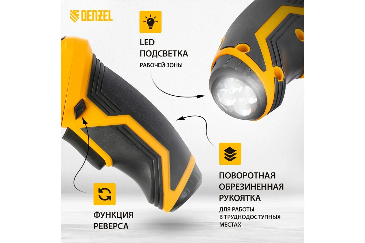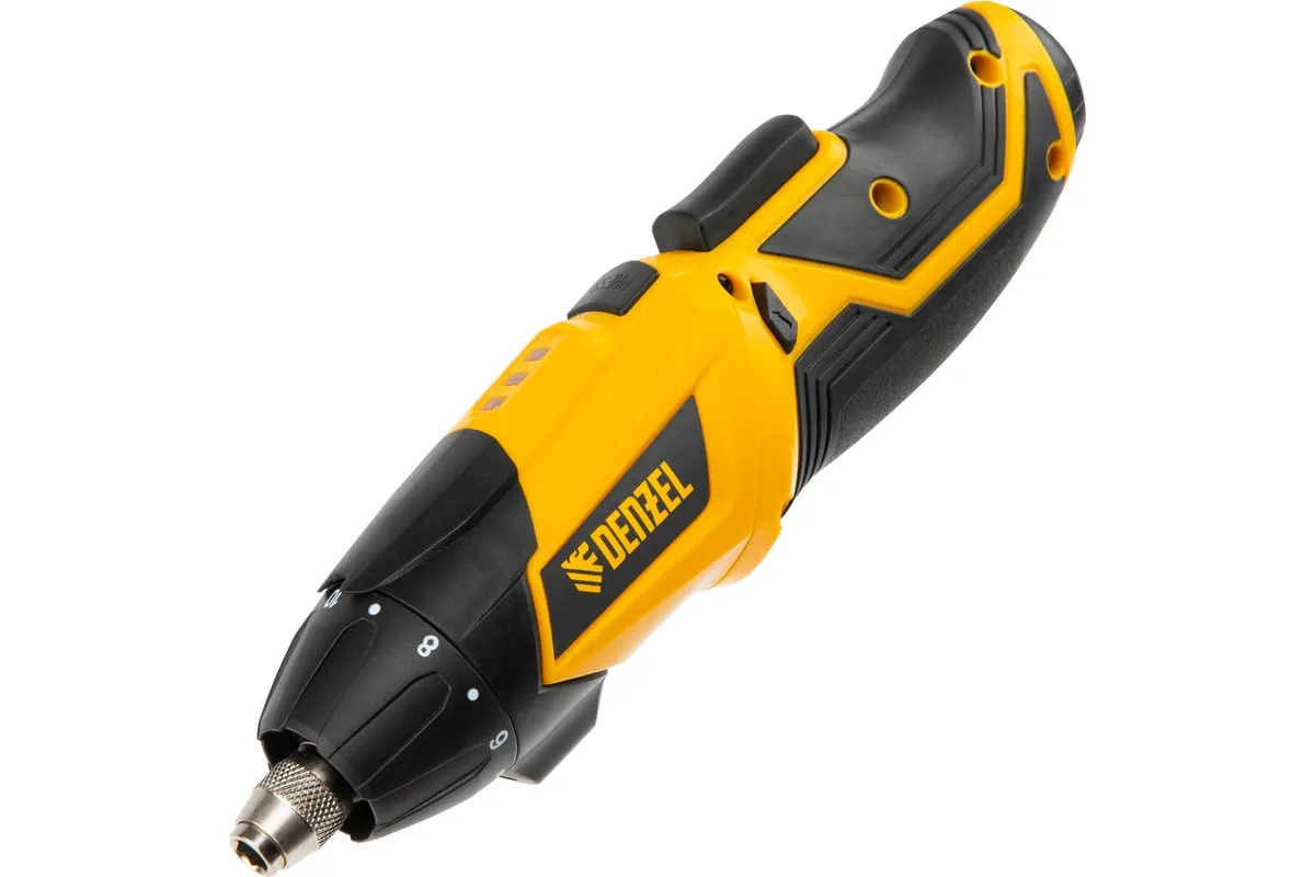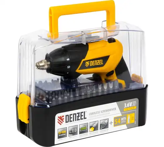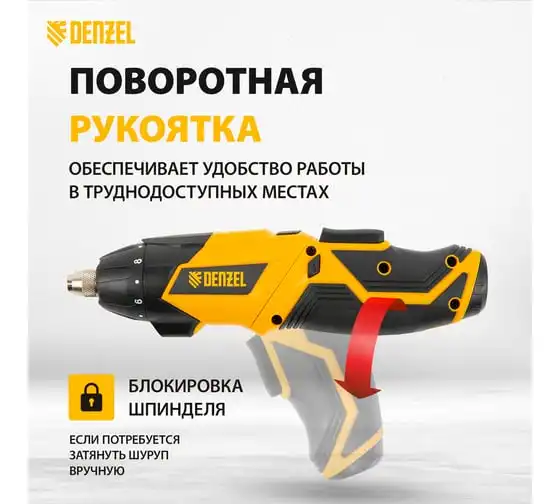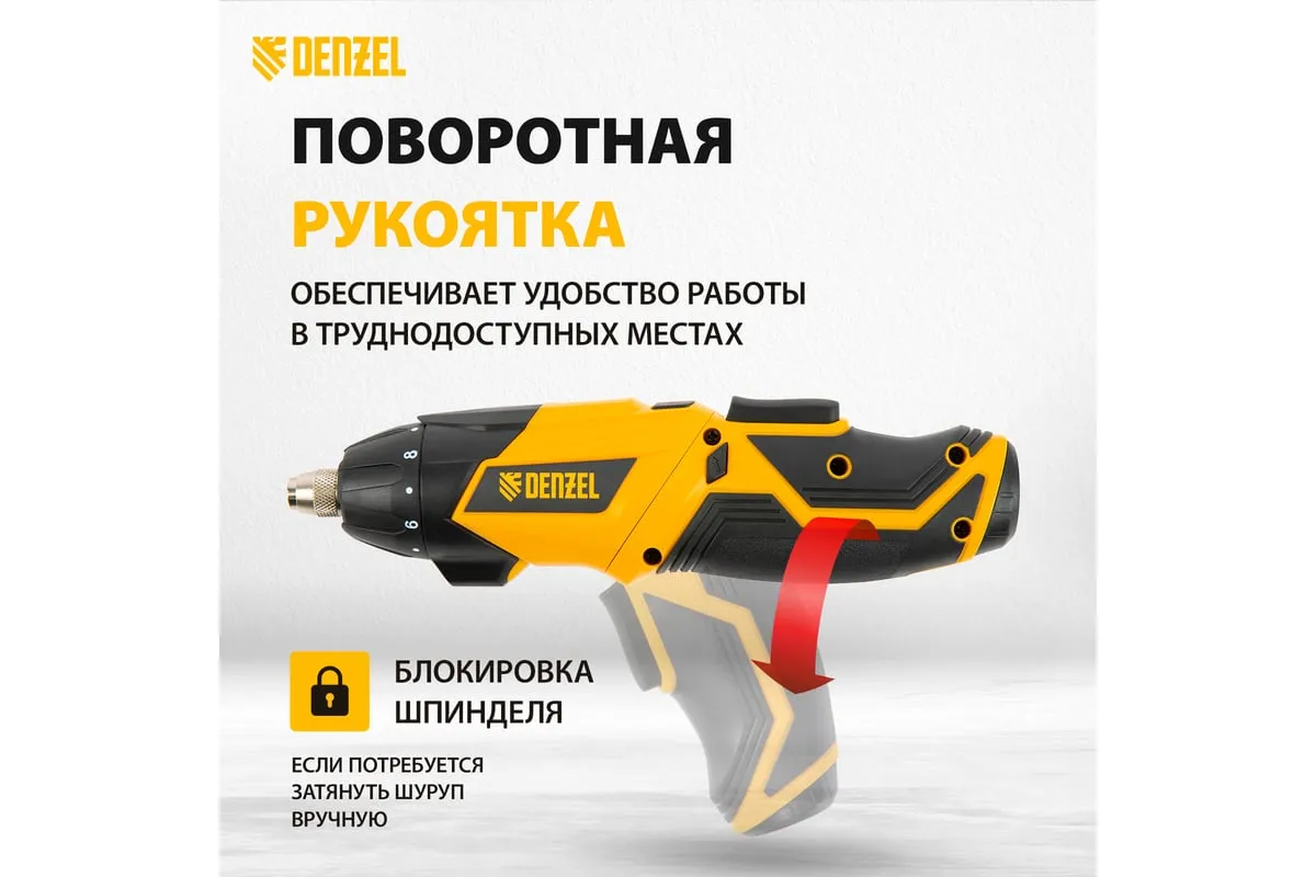 Аккумуляторная отвертка Denzel CSL-3,6-01 используется для работы с саморезами, шурупами и винтами при монтажных работах. Поворотная обрезиненная рукоятка позволяет работать в труднодоступных местах.