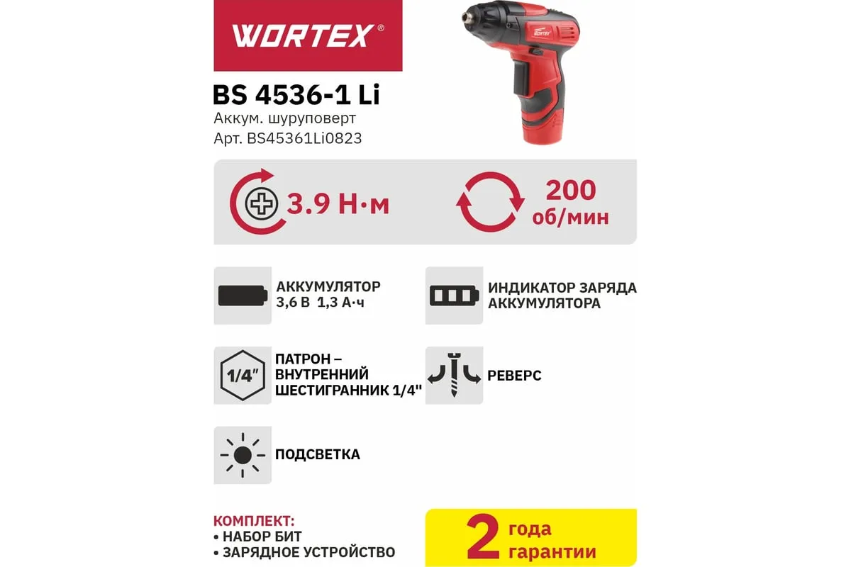 Аккумуляторная отвертка WORTEX BS 4536-1 LI BS45361Li0823 – компактный и легкий, но в тоже время мощный аккумуляторный шуруповерт, предназначен для завинчивания шурупов в различные материалы.