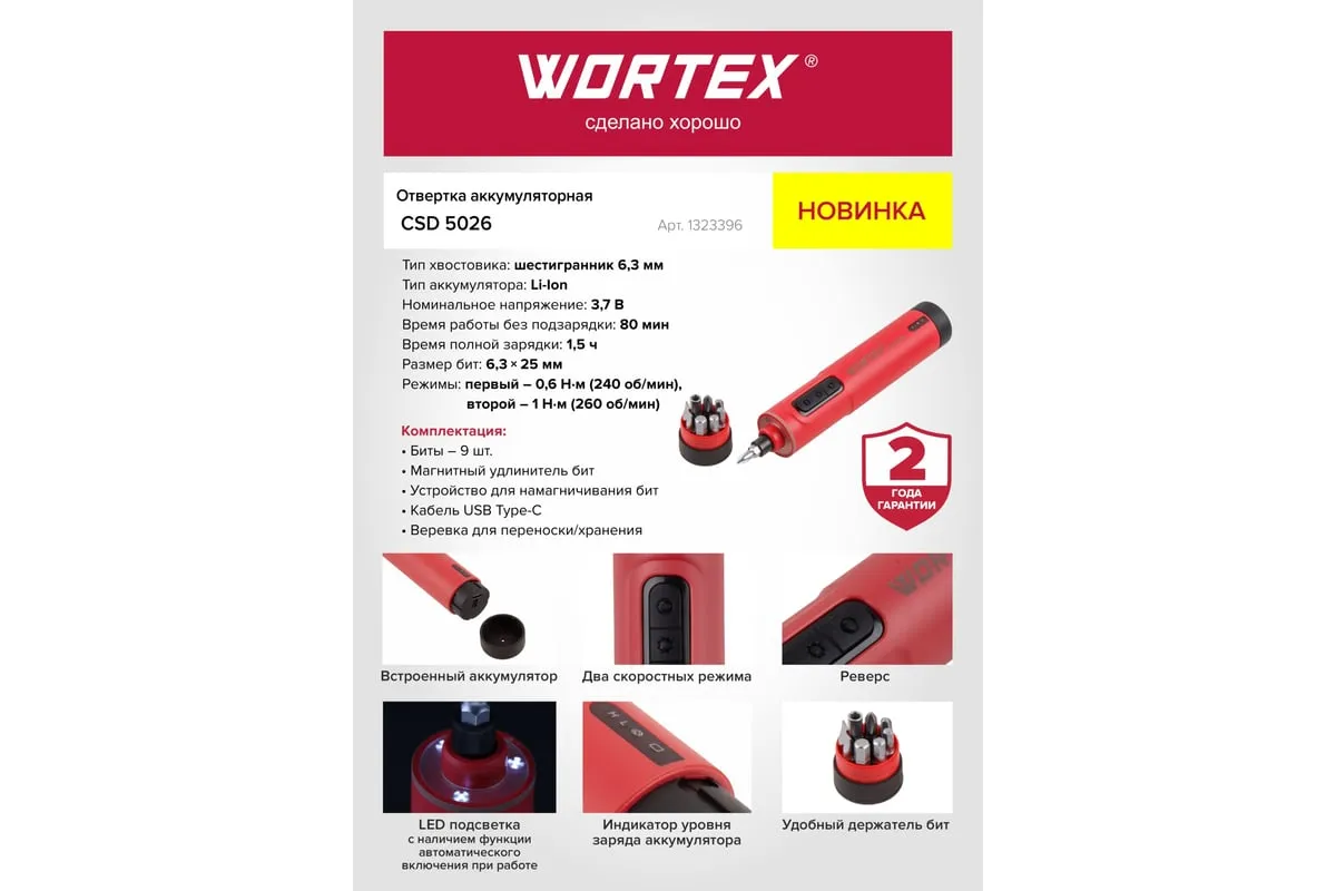 Отвертка WORTEX CSD 5026 (1323396) используется для завинчивания и отвинчивания крепежных изделий с резьбой. Источником питания выступает встроенный аккумулятор. Доступно несколько скоростных режимов: 1-ый - 0.6 Нм (240 об/мин), 2-ой - 1 Нм (260 об/мин) - переключение происходит путем двойного нажатия функциональной кнопки. Оснащена встроенной LED подсветкой, имеет индикатор уровня заряда батареи. Есть реверс. Максимальный крутящий момент 5 Нм достигается путем механического докручивания.
