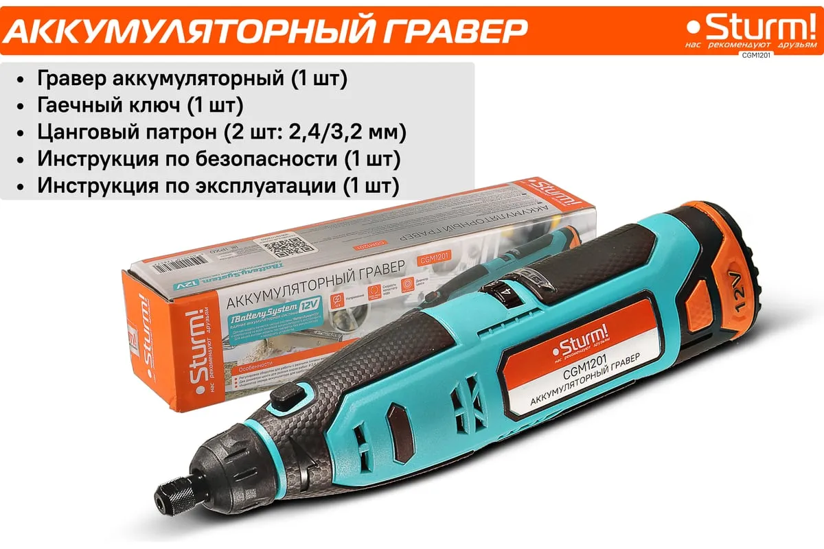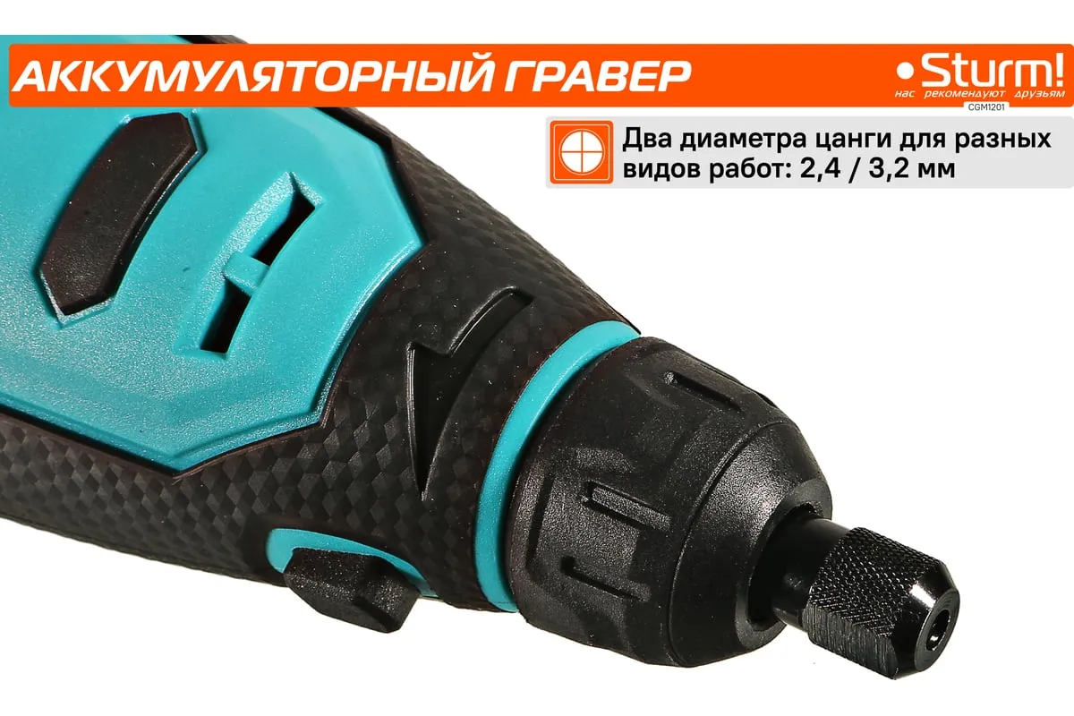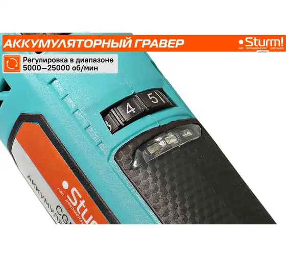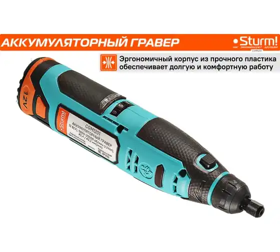 Гравер аккумуляторный Sturm! CGM1201— незаменим для шлифования, полирования, гравировки, заточки и многих других работ. Эргономичный корпус из прочного пластика обеспечивает долгую и комфортную работу в любых условиях эксплуатации и лучший контроль над инструментом благодаря малому весу и удобной для обхвата форме. Регулируемая в диапазоне 5000-25000об/мин скорость обеспечивают хороший контроль при работе с различными материалами. Производительный и компактный двигатель обеспечивает ровное поступательное ведение инструмента и позволяет уверенно производить обработку сложных поверхностей с достойным качеством. Система крепления насадок с использованием двух типовых диаметров фиксирующей цанги 2.4/3.2 мм облегчает подбор оснастки и значительно расширяет диапазон применения инструмента. Данная модель является частью системы 1BatterySystem12V и совместима со всей линейкой аккумуляторного инструмента. Для Вашей выгоды модель поставляется без аккумулятора и зарядного устройства.