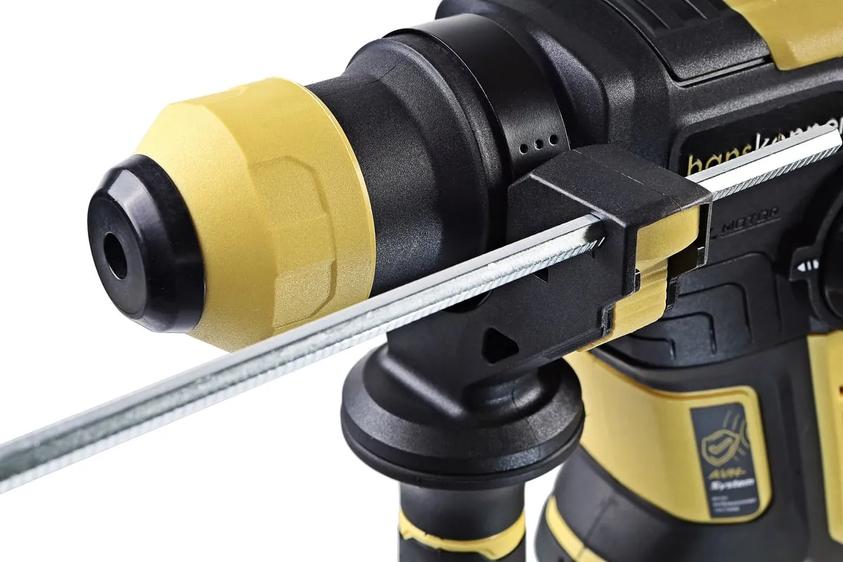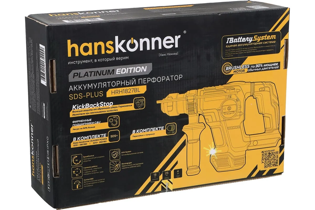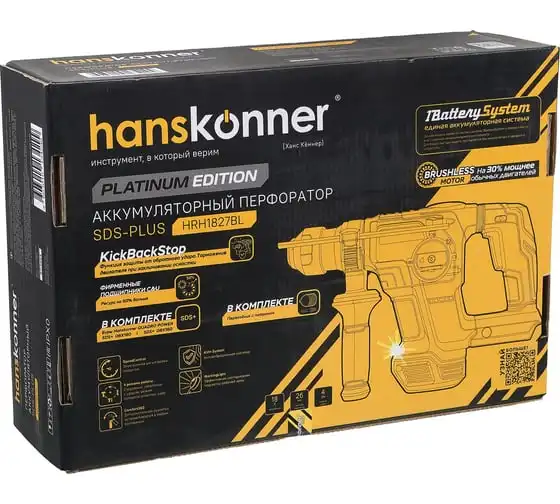 HRH1827BL Hanskonner серии PLATINUM – 18 В аккумуляторный перфоратор с патроном под оснастку SDS+ часть системы 1BatterySystem и совместим со всей линейкой инструмента данной системы. Подходит для сверления отверстий в бетоне, дереве и стали. Имеет 3 режима: сверление, сверление с ударом, долбление + режим предустановки долота. Инструмент оснащен бесщеточным электромотором Brushless Motor, характеризующимся на 30% большей производительностью в сравнении с обычными коллекторными моторами и лучшей долговечностью – отлично противостоит кратковременным перегрузкам, и не склонен к перегреву. Для комфорта работы в условиях с недостаточным освещением модель оборудована эффективной LED подсветкой рабочей зоны. Инструмент не требует расположенной рядом электросети, поэтому работать можно на обесточенных объектах и на высоте. В данной модели перфоратора используется активная антивибрационная система AVH-System, благодаря чему значительно снижается нагрузка на руки оператора, что позволяет увеличить временной интервал работ. Еще одной особенностью данной модели является - предустановленная система KickBackStopl, выполняющая функцию защиты от обратного удара за счет торможения двигателя при заклинивании оснастки, обеспечивающая безопасность при выполнении различного рода работ. Приятным бонусом станут : профессиональные буры Hanskonner QUADRO POWER SDS+ 06X160,SDS+ 08X160 и патрон для сверления с адаптером, которые так же включает комплект поставки.