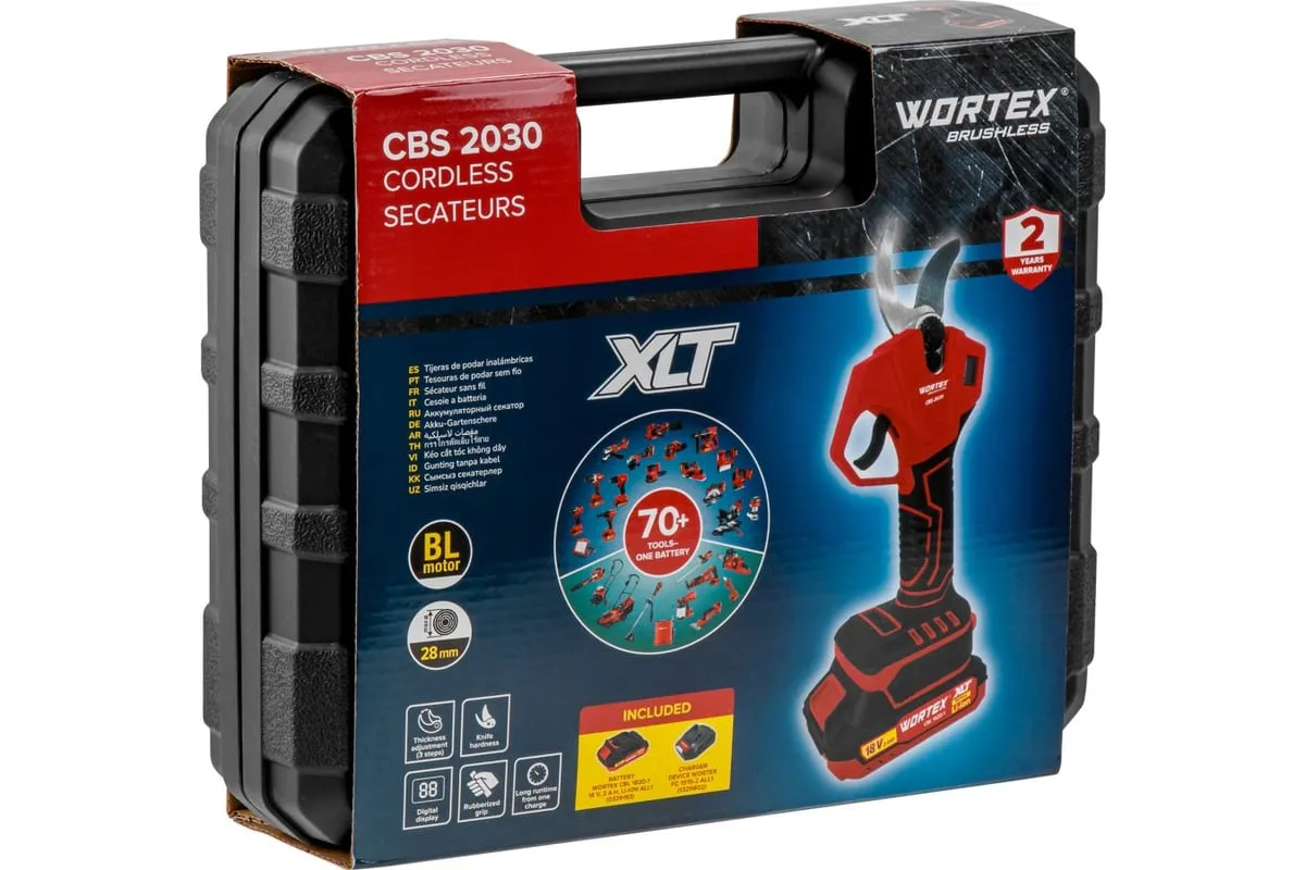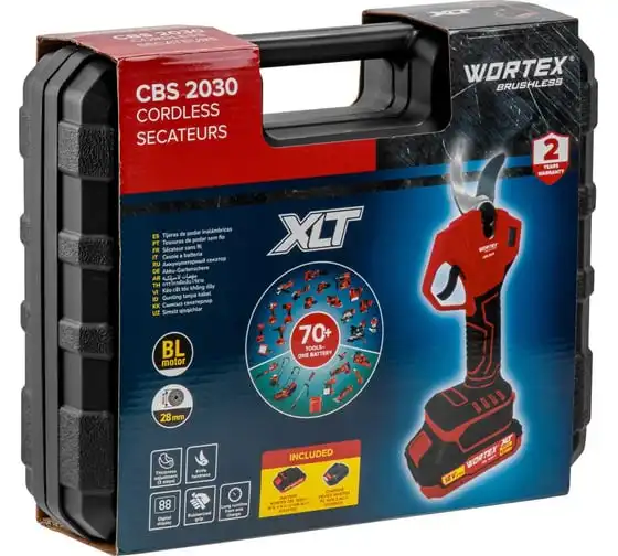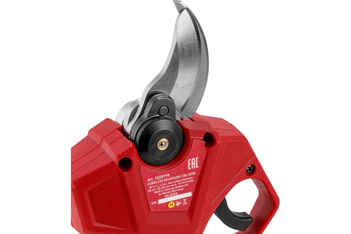 Аккумуляторный секатор подходит для комплексного ухода за садом: обрезки ветвей кустарников и деревьев. Кроме того секатор обладает высокой режущей способностью благодаря острому ножу из твердой стали. Бесщеточный двигатель делает инструмент компактным и значительно продлевает срок его службы. К тому же для удобства пользователя предусмотрена трехпозиционная электронная регулировка толщины реза (до 28 мм). Прорезиненная рукоятка добавит дополнительный комфорт при работе. Имеет встроенный дисплей, отображающий процент заряда батареи. Обладает высокой скоростью работы, где один цикл занимает не более 1 секунды. Также модель совместима с телескопической штангой (в комплекте не идет). Поставляется с чемоданом для переноски и хранения, а также аккумулятором и зарядным устройством.