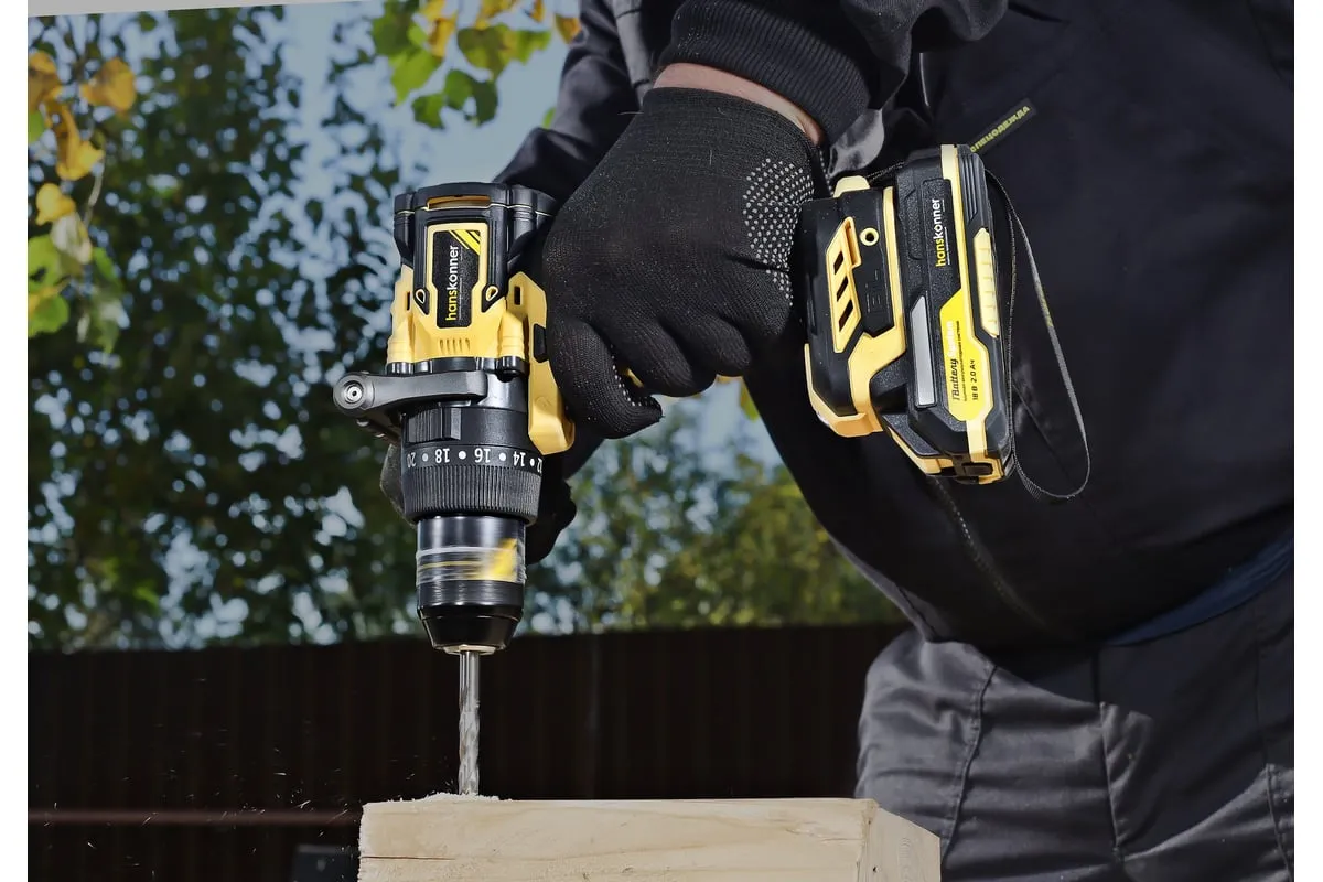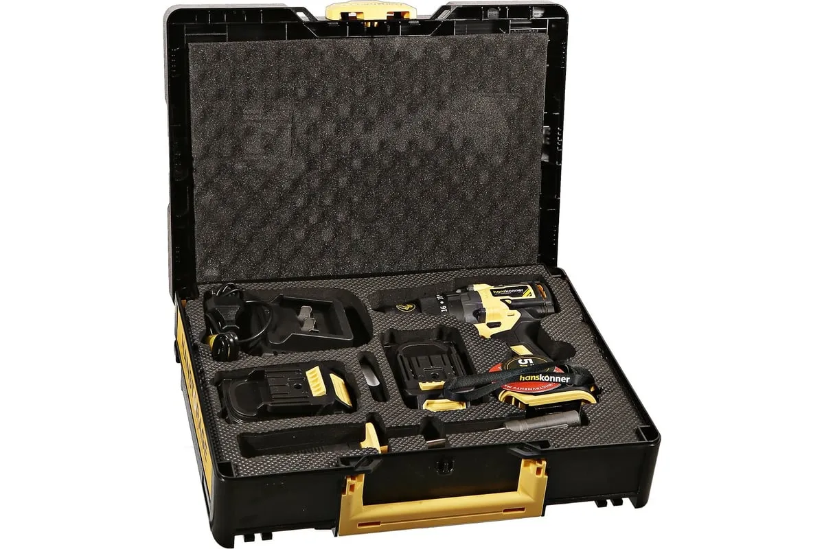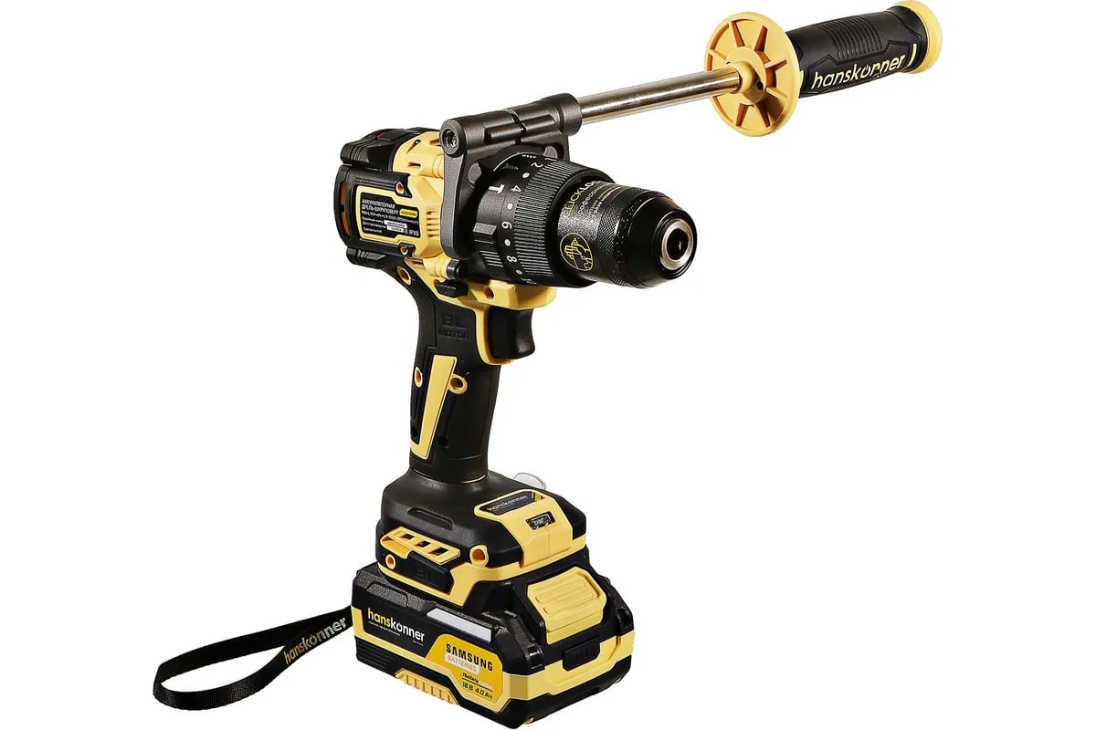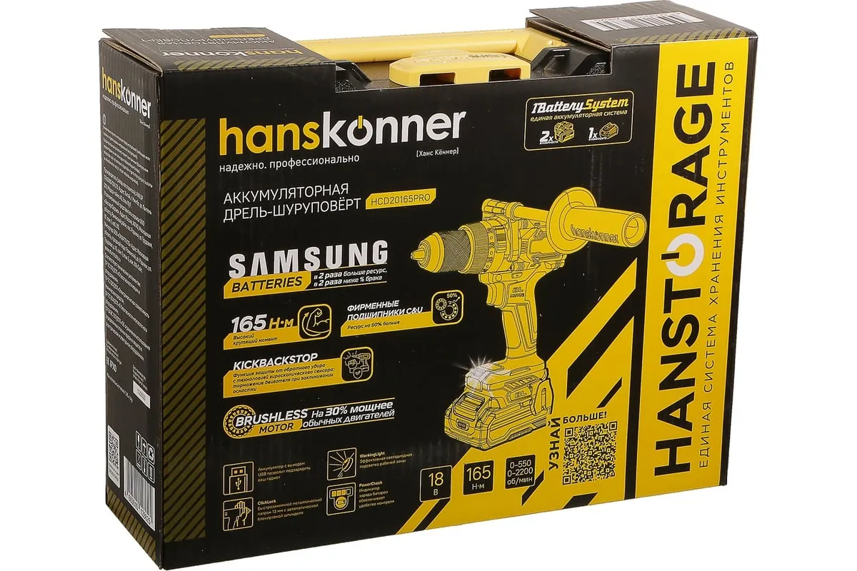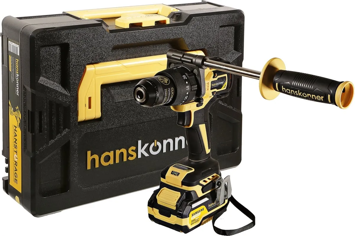 Аккумуляторная ударная дрель-шуруповерт Hanskonner подходит для любых работ, в том числе в стесненных условиях и труднодоступных местах без снижения производительности и потери качества работ. Мощный крутящий момент 165 Н·м позволяет использовать инструмент в 5 полноценных функциях: шуруповерт, ударная дрель, низкооборотистая дрель, ледобур, миксер. Компактный и легкий бесщеточный двигатель имеет выгодные параметры работы: Усиленный цельнометаллический патрон с диаметром захвата 13мм расширяет применение оснастки для выполнения работ с повышенной нагрузкой. 20 ступеней крутящего момента, режим сверления и режим сверления с ударом позволяют устанавливать любой крепеж без его повреждения и вдавливания в материал. Данная модель является частью системы 1BatterySystem и совместима со всей линейкой аккумуляторного инструмента. Два Li-Ion аккумулятора SAMSUNG емкостью 2.0 Ач и 4.0 Ач с увеличенным в 2 раза ресурсом работы.