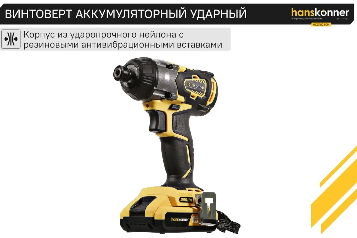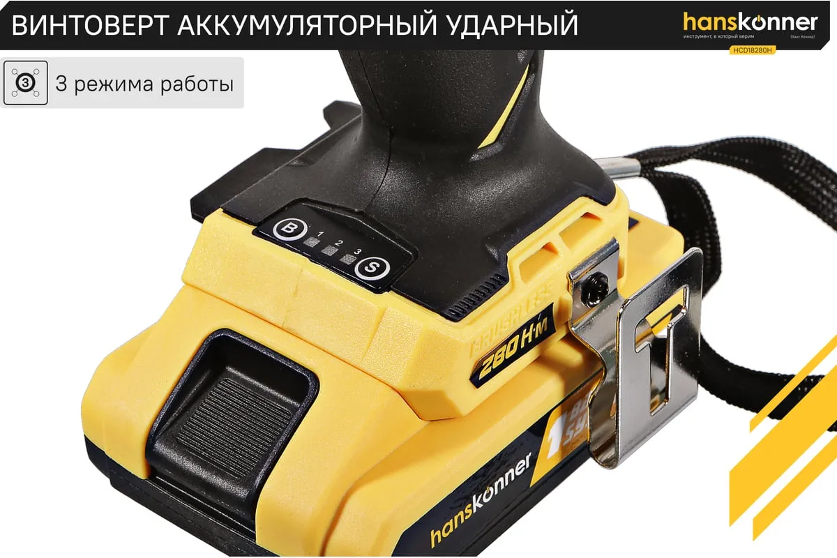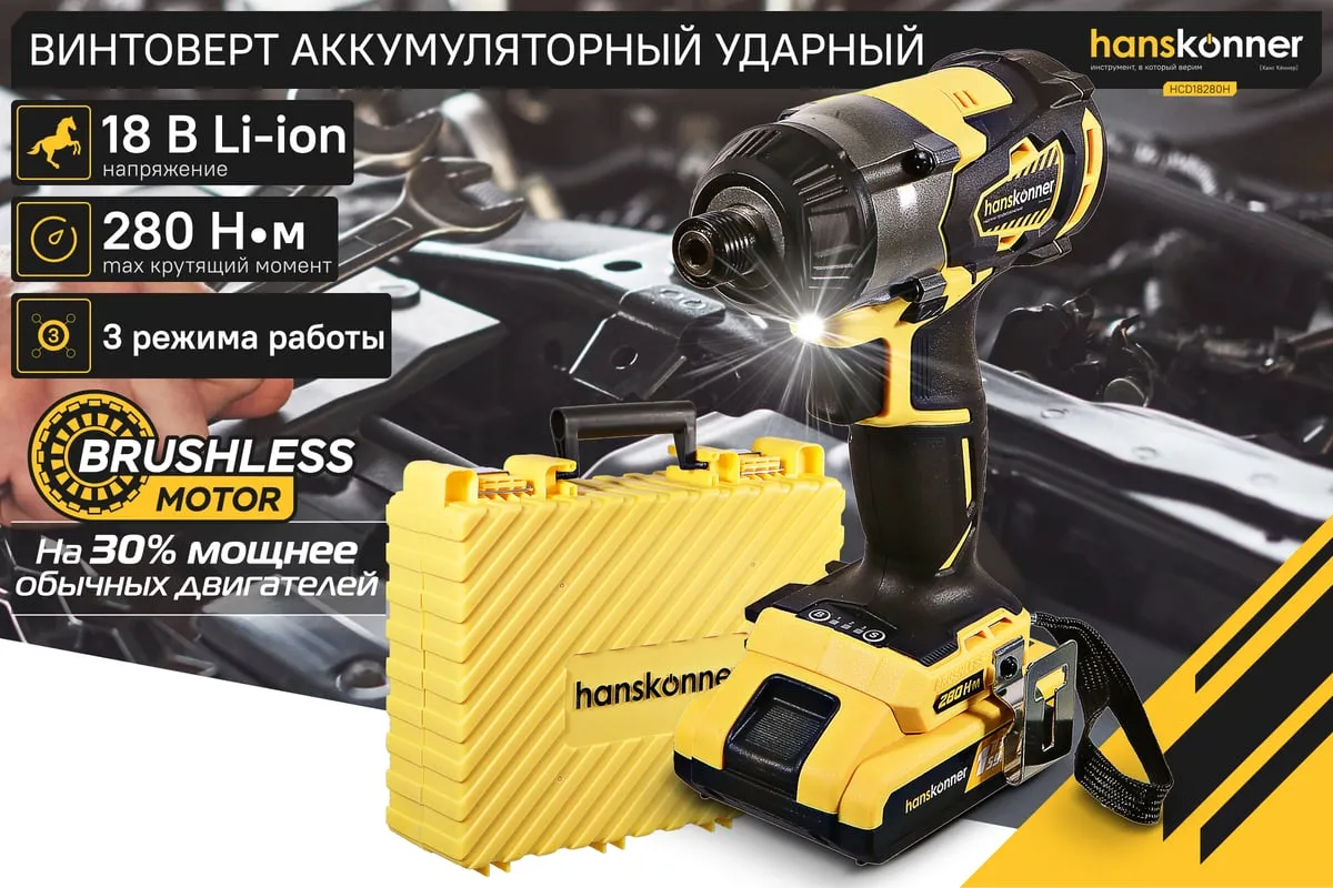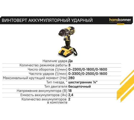 Аккумуляторный шуруповерт Hanskonner HCD18280H имеет функцию удара, благодаря чему помогает справлятьсядаже с закисшими соединениями. Модель оснащена бесщеточным двигателем, из-за чегоувеличивается рабочий ресурс инструмента. Три скоростных режимапомогают настроить изделие под конкретный материал. Два аккумулятора в комплектеобеспечивает длительную работубез перерывов.