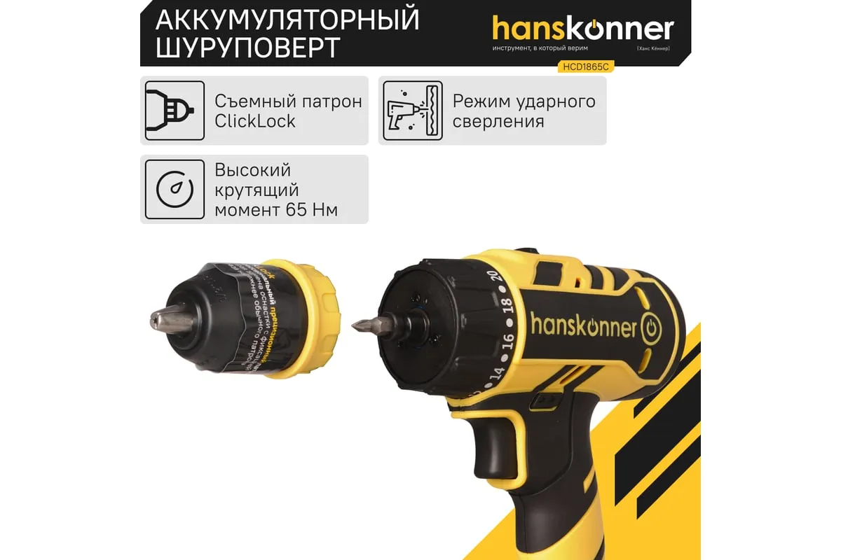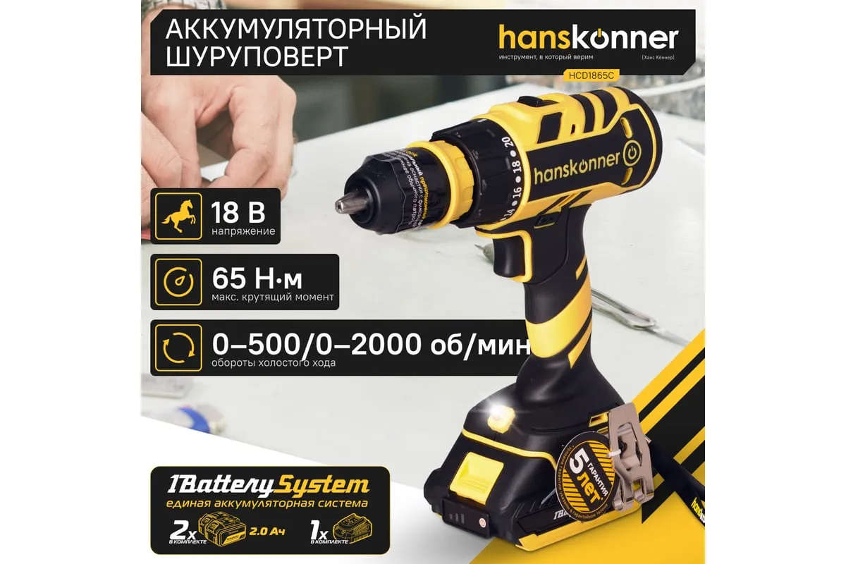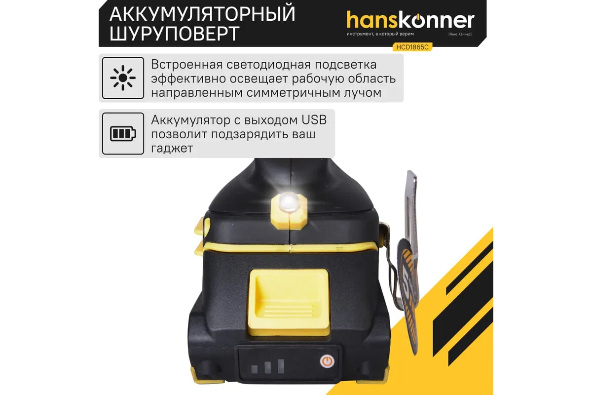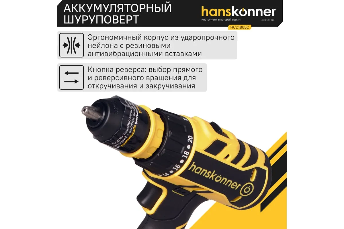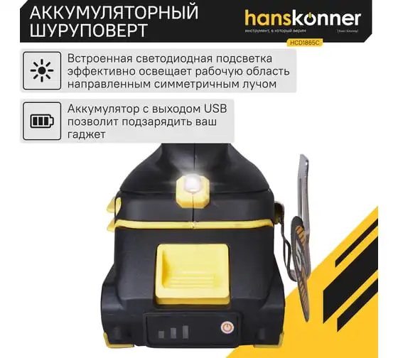 Аккумуляторная бесщеточная дрель-шуруповерт Hanskonner HCD1865C подходит для любых работ, в том числе в стесненных условиях и труднодоступных местах без снижения производительности и потери качества работ.