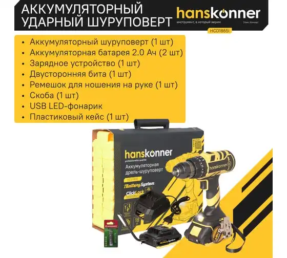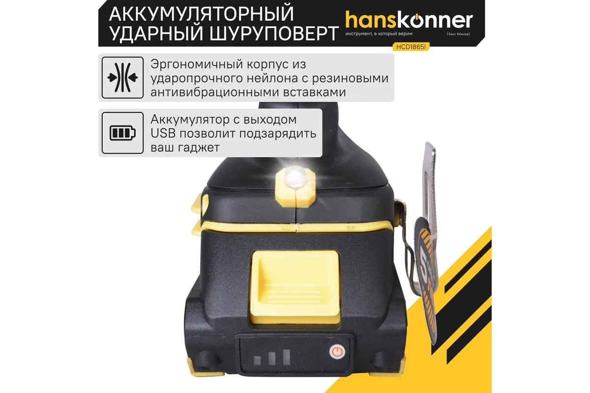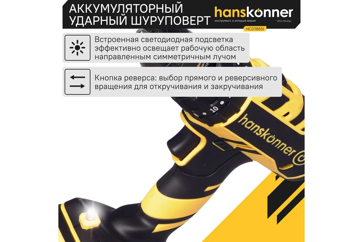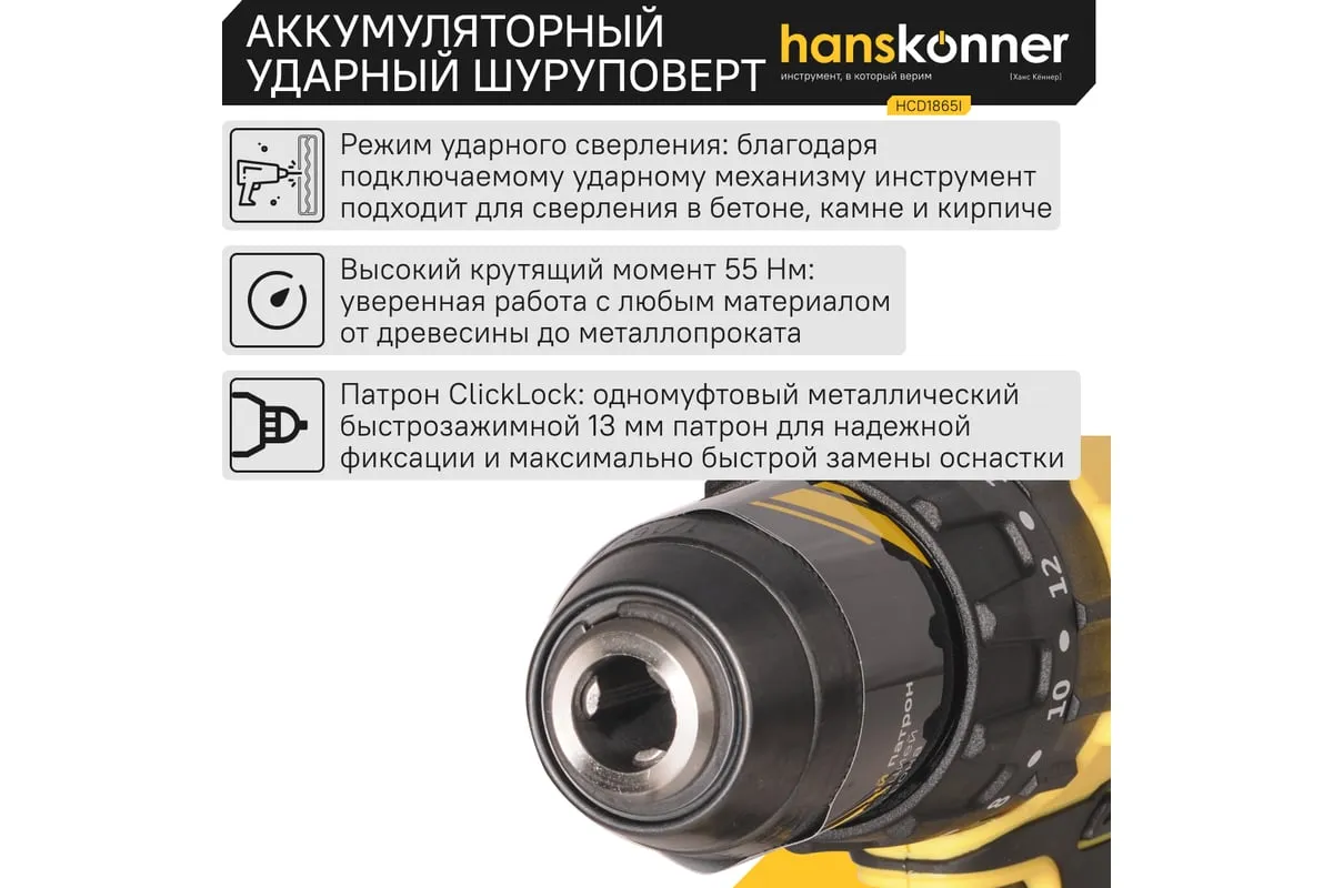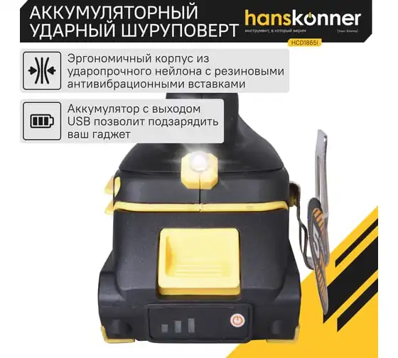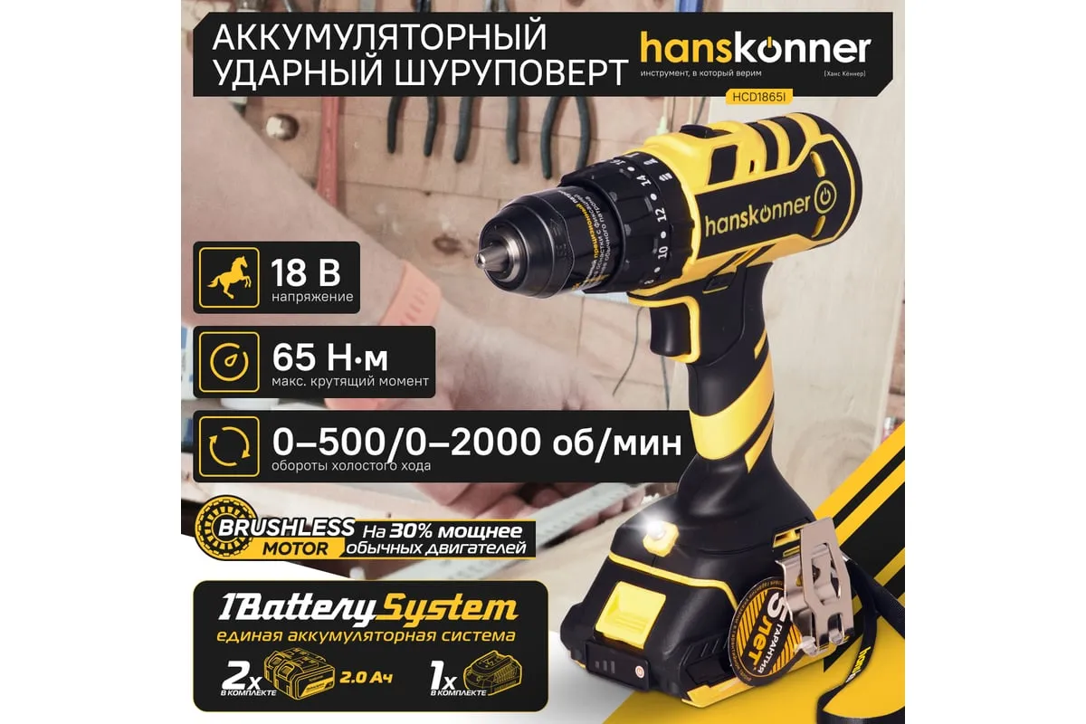 Аккумуляторная бесщеточная ударная дрель-шуруповерт Hanskonner HCD1865I подходит для любых работ, в том числе в стесненных условиях и труднодоступных местах без снижения производительности и потери качества работ. 20 ступеней крутящего момента, режим сверления и режим сверления с ударом позволяют устанавливать любой крепеж без его повреждения и вдавливания в материал.Функция быстрой зарядки зарядного устройства полностью восстановит работоспособность аккумулятора всего за60минут или за 35минут до 80%. Встроенная светодиодная подсветка с применением блока коллиматорных линз эффективно освещает рабочую область направленным симметричным лучом. Эргономичный корпус из ударопрочного нейлона с резиновыми антивибрационными вставками и концентрация основного веса по его оси позволяет работать без напряжения пальцев и снижает усталость.