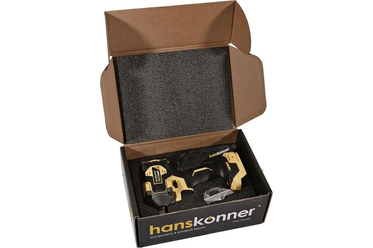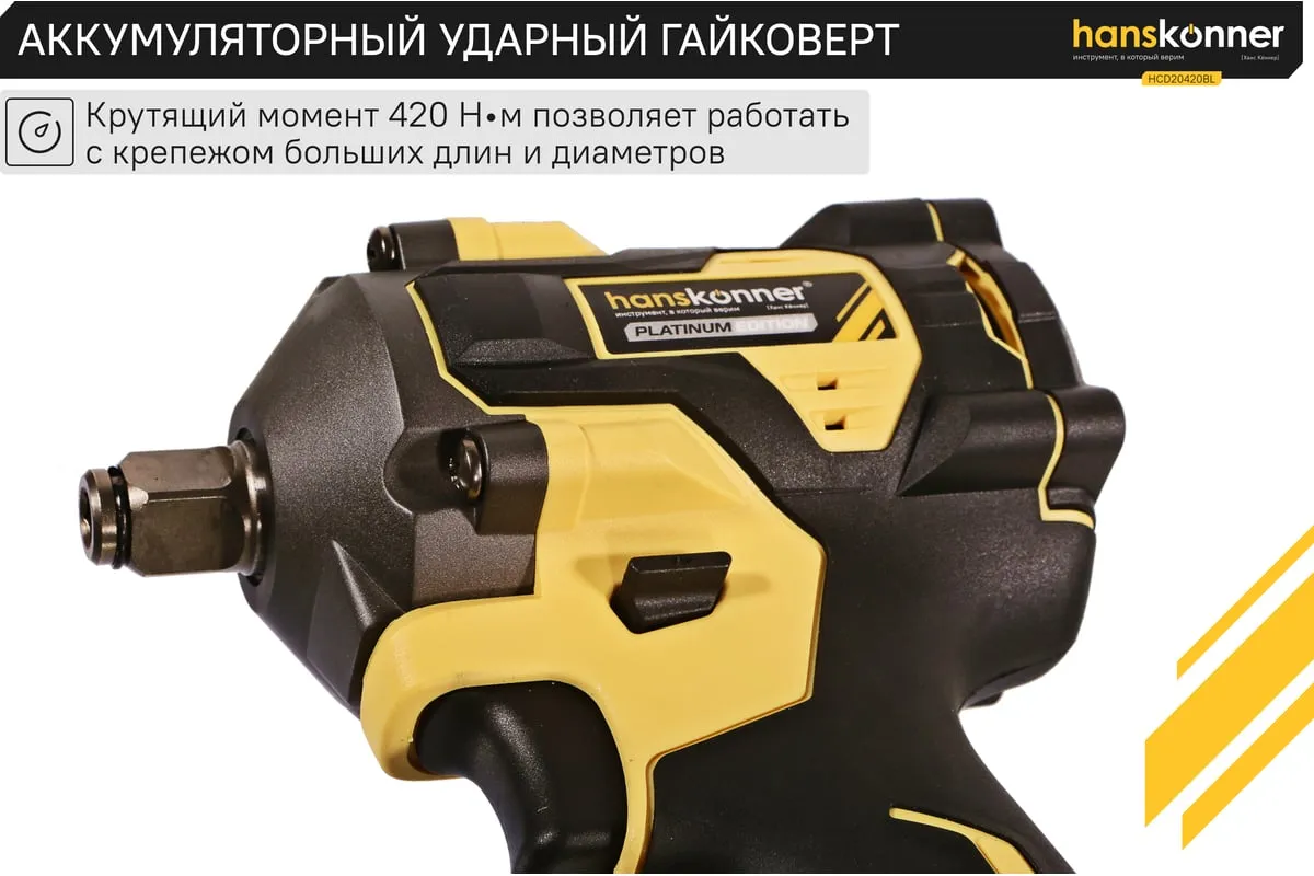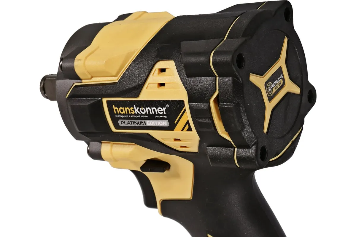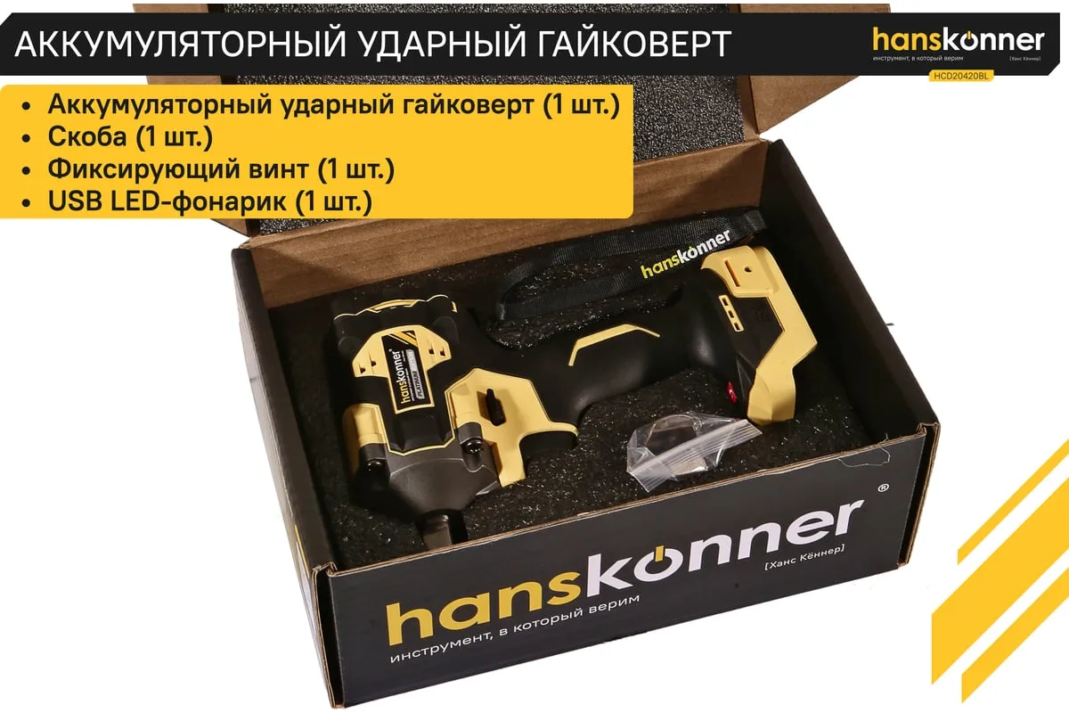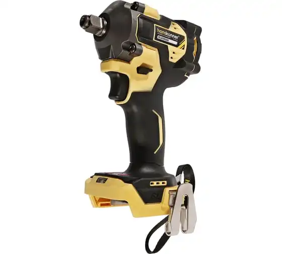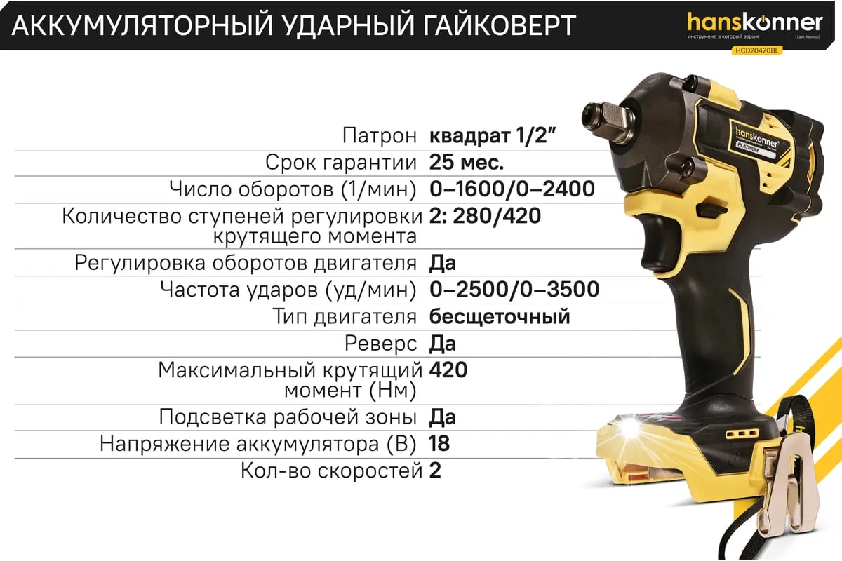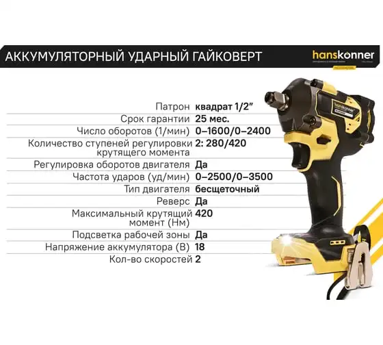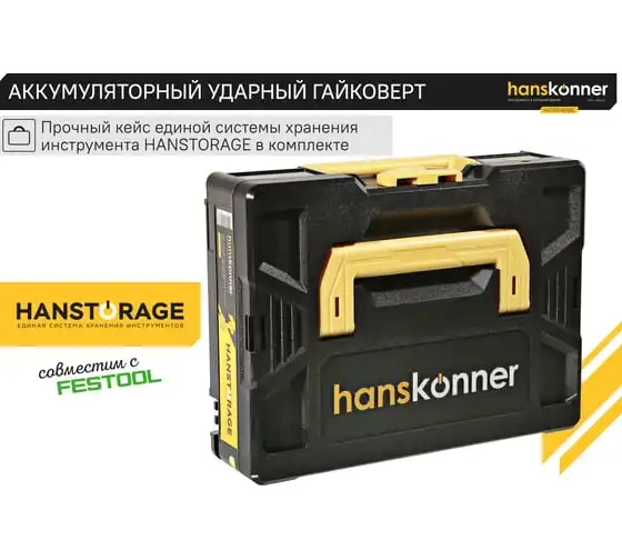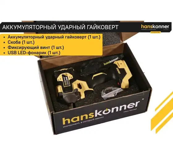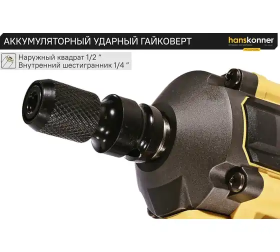 Hanskonner HCD20420BL – аккумуляторный 18 В, ударный гайковерт с наружным квадратом 1/2″ и возможностью установки оснастки под шестигранник 1/4″ – является частью системы 1BatterySystem, обеспечивающей совместимость одного и того же аккумулятора с целым рядом наименований инструмента.