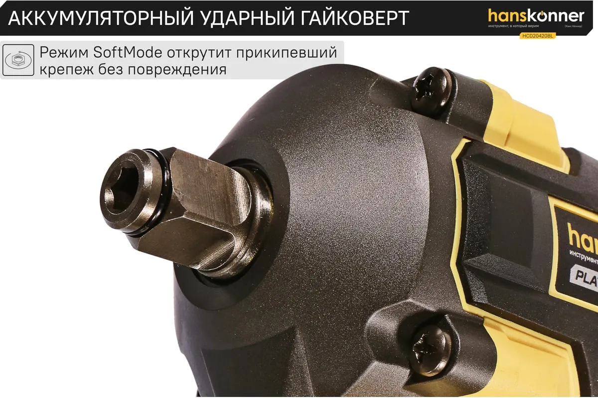 Модель Hanskonner HCD20420BL имеет два режима настройки крутящего момента: 280 Н м и 420 Н м – пользователь выбирает нужный, исходя из поставленных задач. Функция деликатного откручивания SoftMode обеспечивает максимально аккуратное откручивание прикипевшего крепежа, исключая его повреждение.