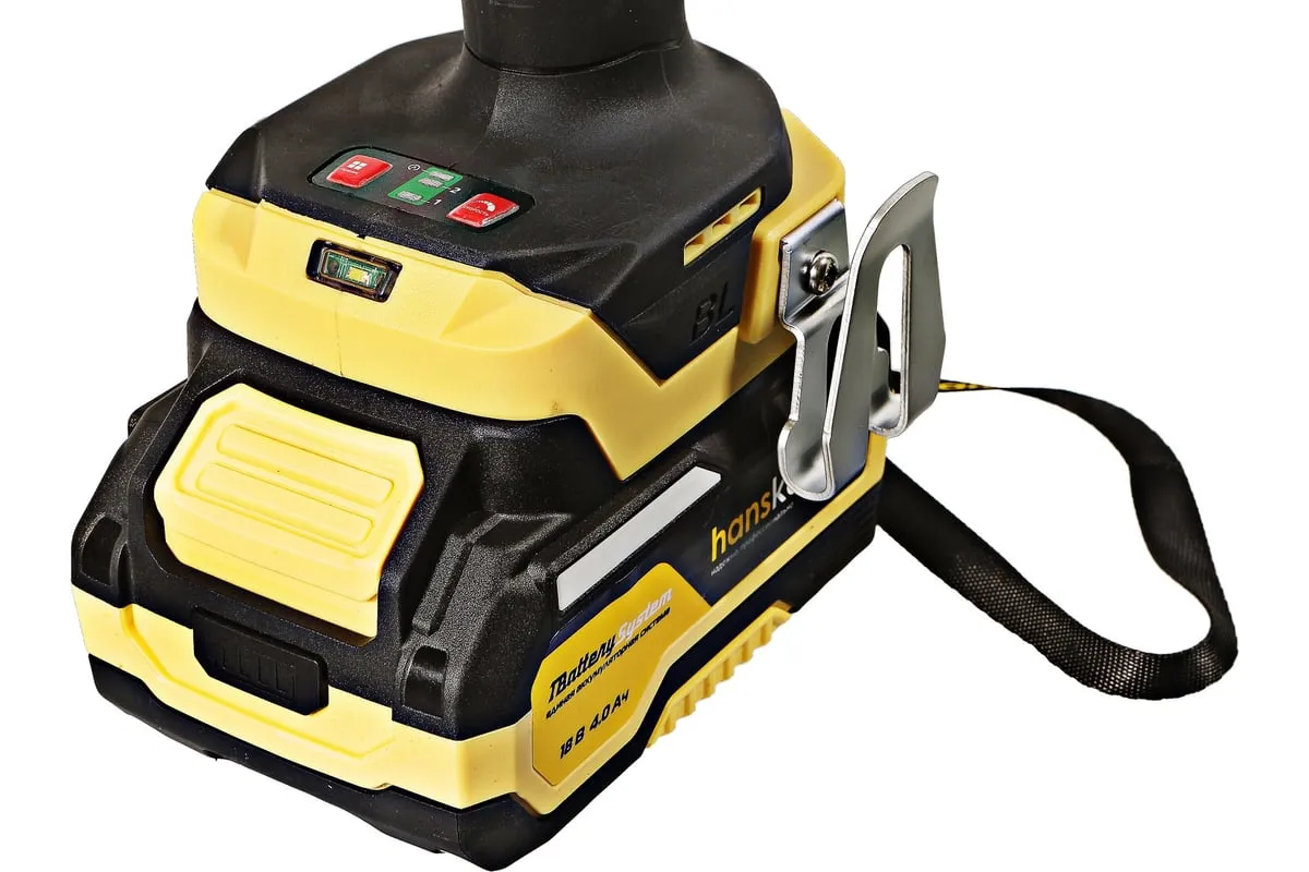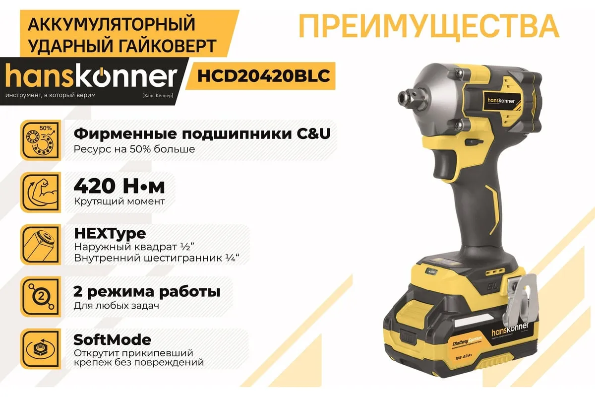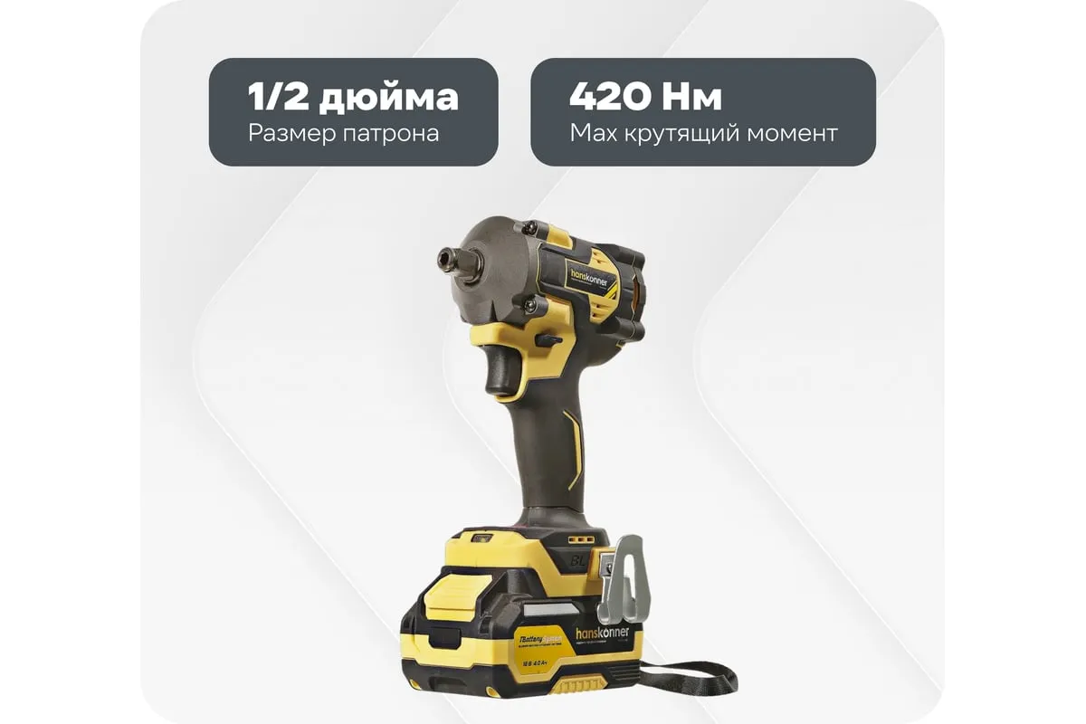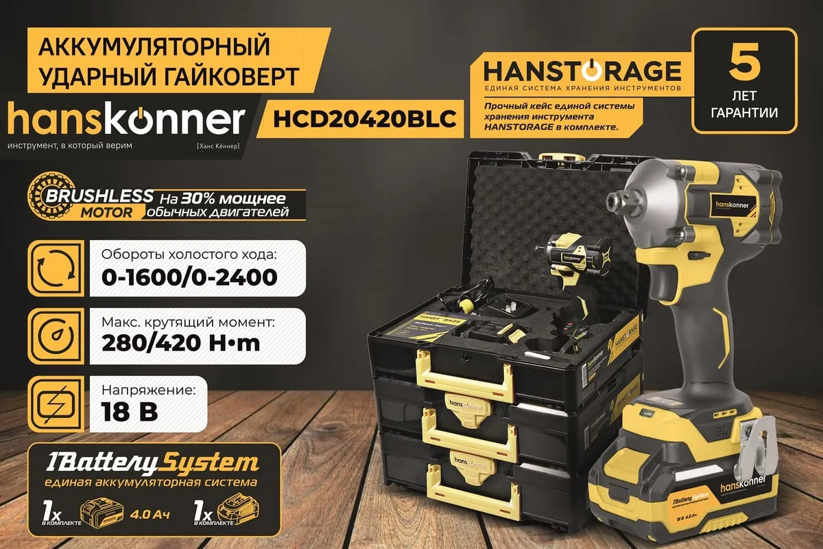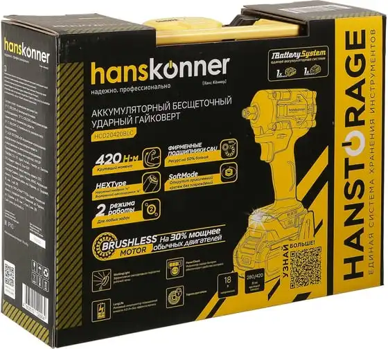Hanskonner HCD20420BLС – аккумуляторный 18 В, ударный гайковерт с наружным квадратом 1/2″ и возможностью установки оснастки под шестигранник 1/4″ – является частью системы 1BatterySystem, обеспечивающей совместимость одного и того же аккумулятора с целым рядом наименований инструмента. Модель обладает максимально сбалансированной компоновкой: небольшие размеры корпуса и рукояти позволяют эффективное использование в условиях с затрудненным доступом, а нейтральный центр тяжести, и обилие прорезиненных противоскользящих поверхностей способствуют надежному хвату, и лучшему контролю. Гайковерт оснащен 18 В бесщеточным двигателем, характеризующимся на 30% лучшей производительностью в сравнении с коллекторными аналогами. Модель Hanskonner HCD20420BLС имеет два режима настройки крутящего момента: 280 Н м и 420 Н м – пользователь выбирает нужный, исходя из поставленных задач. К особенностям Hanskonner HCD20420BLC стоит отнести электронный тормоз двигателя, эффективную LED-подсветку рабочей зоны WorkingLight с блоком коллиматорных линз, создающих направленный симметричный луч, а также индикатор остаточного заряда аккумулятора PowerCheck. Дополнительному комфорту использования способствует специальная зацепная скоба крепления на пояс и страховочный ремешок на руку. Прочный кейс единой системы хранения инструмента HANSTORAGE гарантирует сохранность устройства и аксессуаров в процессе транспортировки. Назначение: для ударного закручивания / откручивания различных крепежных элементов.