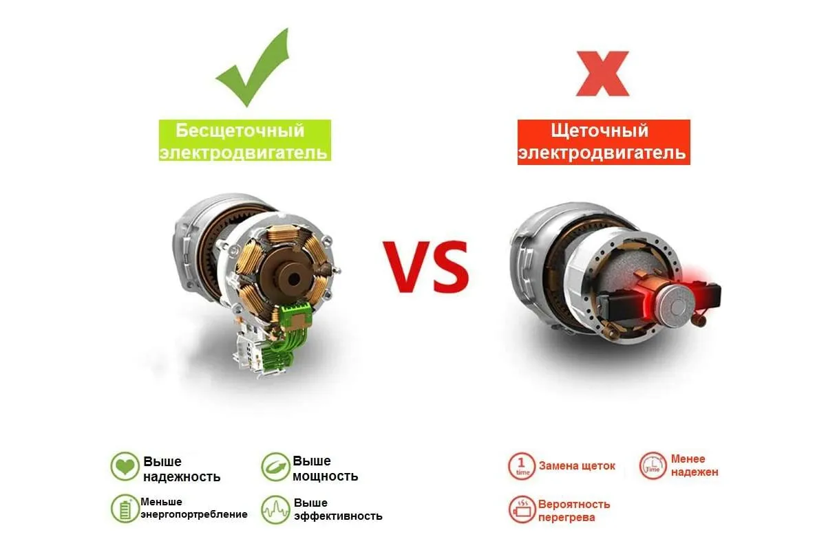 Преимущества бесщеточного мотора: высокий крутящий момент в обоих направлениях вращения, повышенная нагрузка не уменьшает скорость вращения, отсутствие искры при работе позволяет работать в огнеопасных местах, максимальная мощность достигается мгновенно. Облегченная конструкция и удобная ручка создают все условия для эффективной работы инструментом. Фонарик помогает работать без неудобств при недостаточной освещенности. Гайковерт имеет переключатель для прямого и реверсивного вращения патрона, а также индикатор заряда батареи.