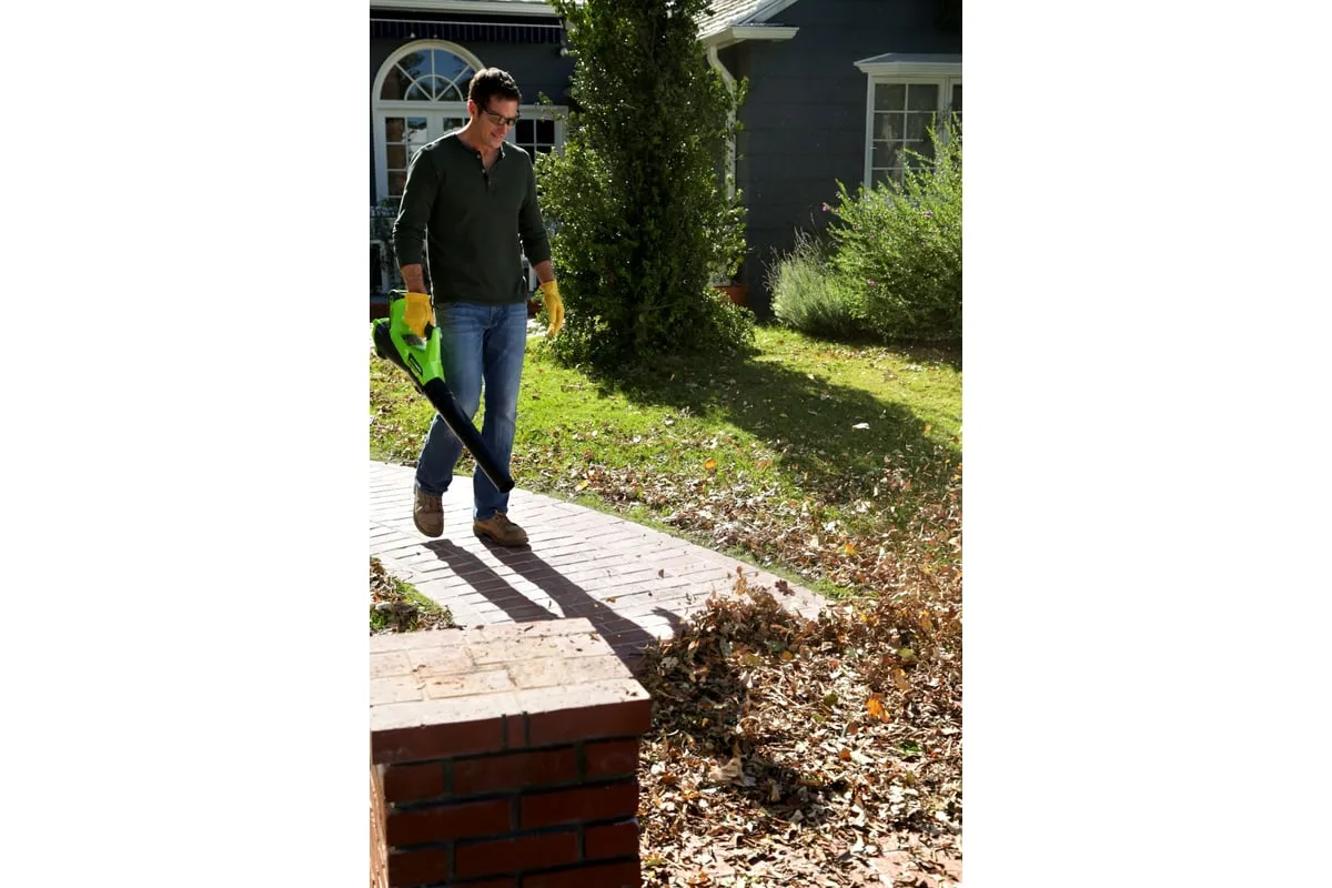 Аккумуляторный воздуходув Greenworks G40AB используется на придомовой территории. Предназначена для сдувания садового мусора в одну кучу. Работает от аккумулятора напряжением 40 В, который является универсальным для устройств из линейки G-MAX 40V. Ручка не скользит и позволяет крепко держать инструмент во время работы.