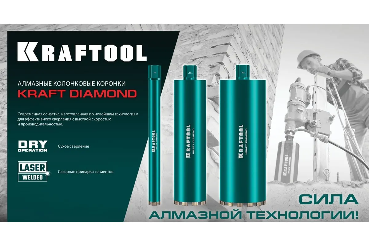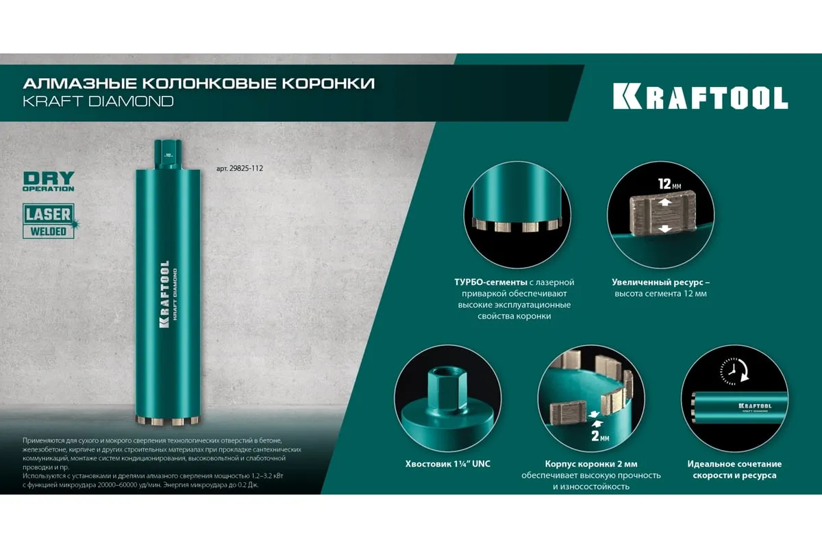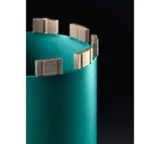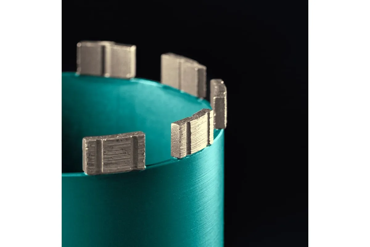 Алмазные колонковые коронки используются для бурения крупных проемов и отверстий в бетоне при проведении отделочно-строительных работ. Для сухого сверления отверстий в железобетоне, кирпиче и других строительных материалах. Используются с установками алмазного бурения с функцией микроудара мощностью от 2 кВт. Преимущества