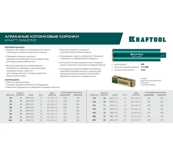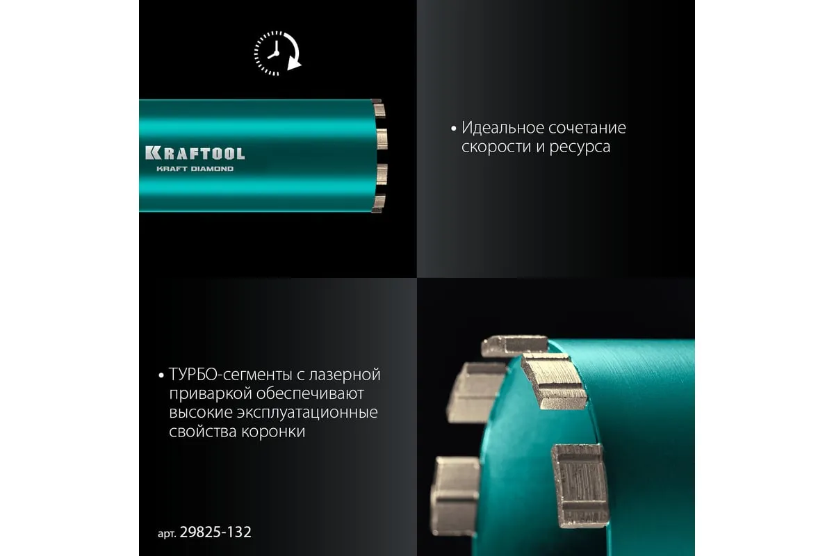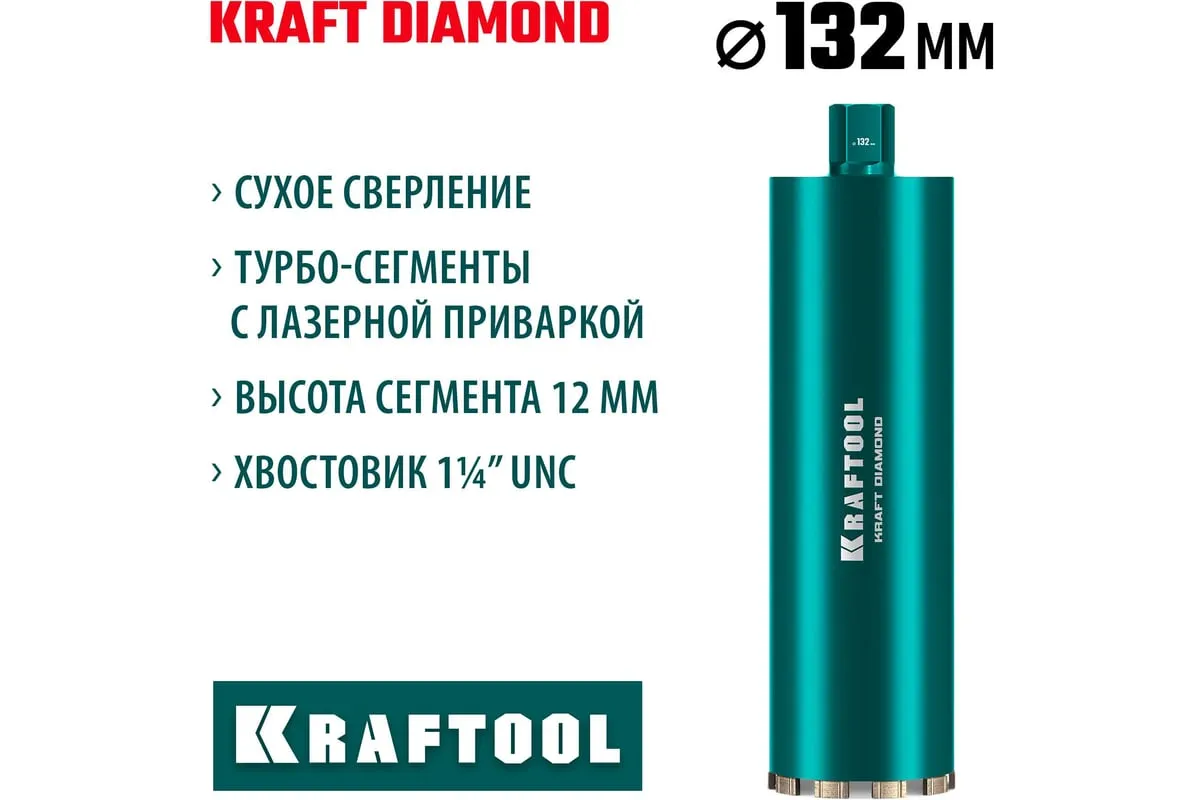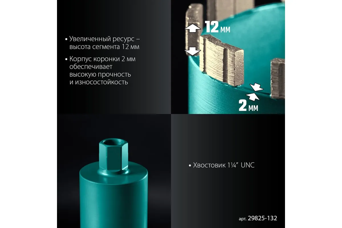Алмазные колонковые коронки используются для бурения крупных проемов и отверстий в бетоне при проведении отделочно-строительных работ. Для сухого сверления отверстий в железобетоне, кирпиче и других строительных материалах. Используются с установками алмазного бурения с функцией микроудара мощностью от 2 кВт. Преимущества