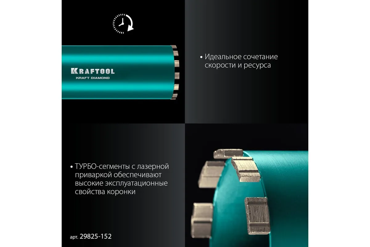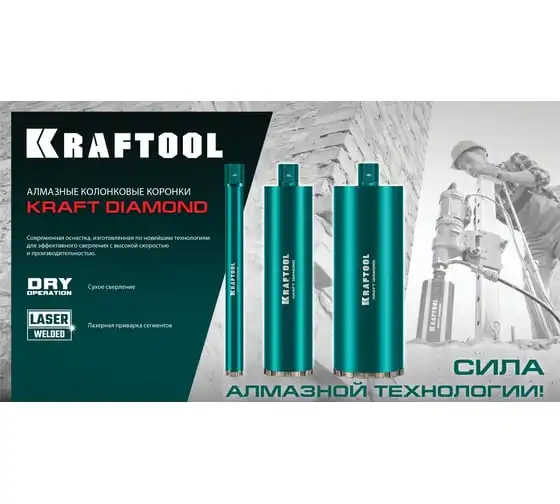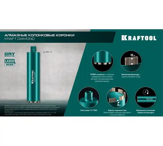 Алмазные колонковые коронки используются для бурения крупных проемов и отверстий в бетоне при проведении отделочно-строительных работ. Для сухого сверления отверстий в железобетоне, кирпиче и других строительных материалах. Используются с установками алмазного бурения с функцией микроудара мощностью от 2 кВт. Преимущества
