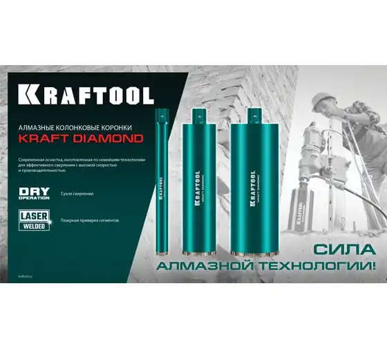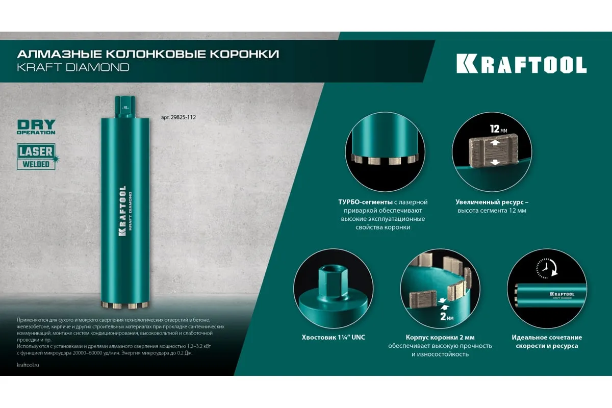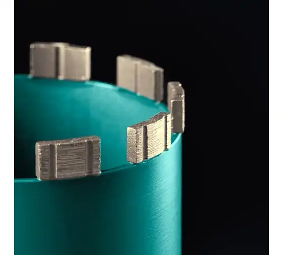 Алмазные колонковые коронки используются для бурения крупных проемов и отверстий в бетоне при проведении отделочно-строительных работ. Для сухого сверления отверстий в железобетоне, кирпиче и других строительных материалах. Используются с установками алмазного бурения с функцией микроудара мощностью от 1.5 кВт. Преимущества
