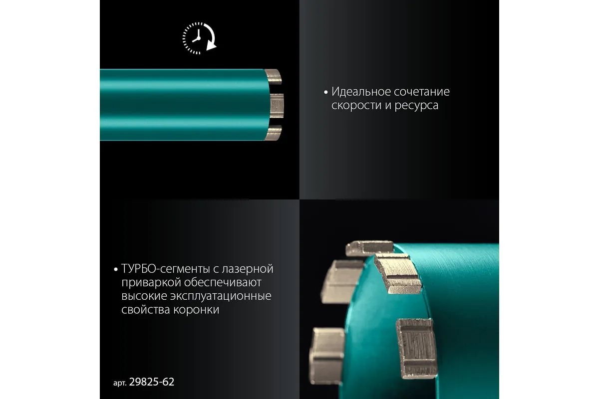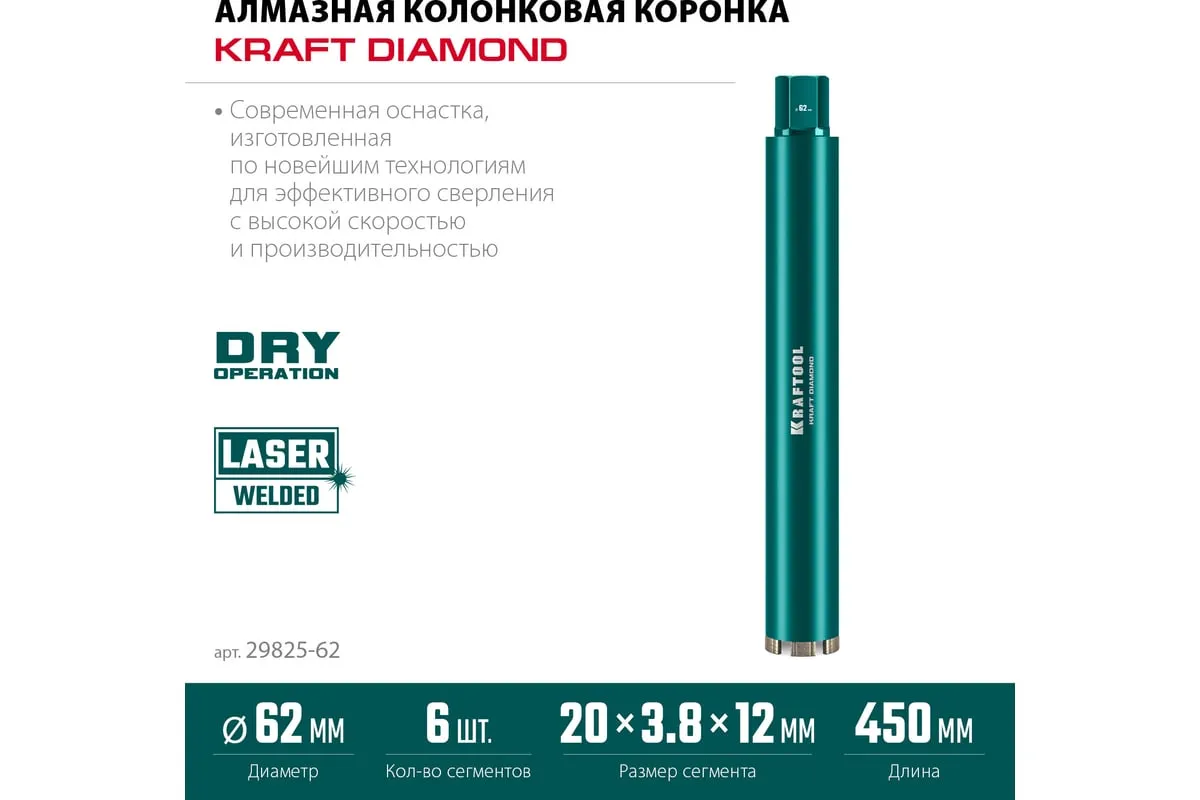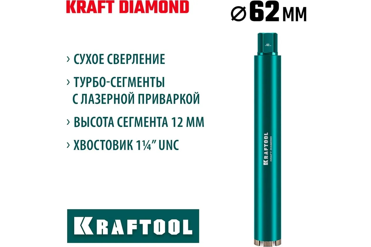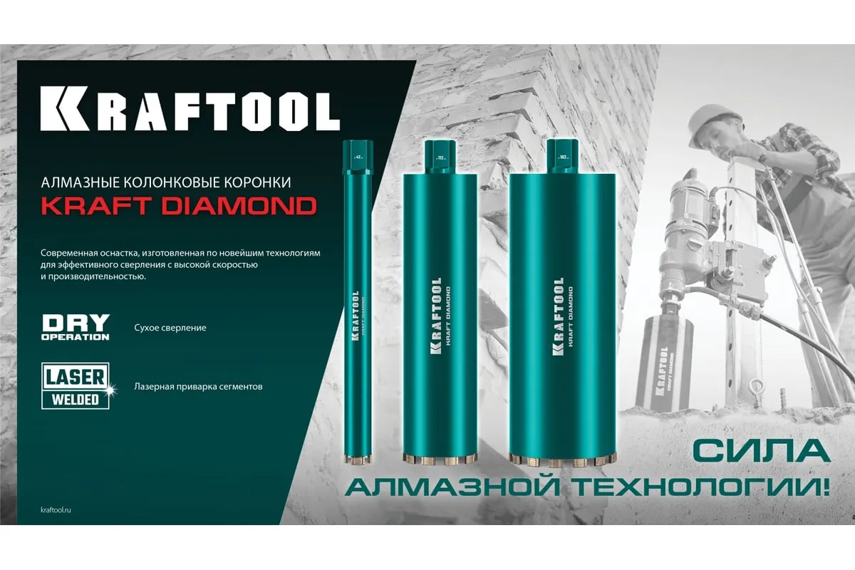 Алмазные колонковые коронки используются для бурения крупных проемов и отверстий в бетоне при проведении отделочно-строительных работ. Для сухого сверления отверстий в железобетоне, кирпиче и других строительных материалах. Используются с установками алмазного бурения с функцией микроудара мощностью от 1.5 кВт. Преимущества