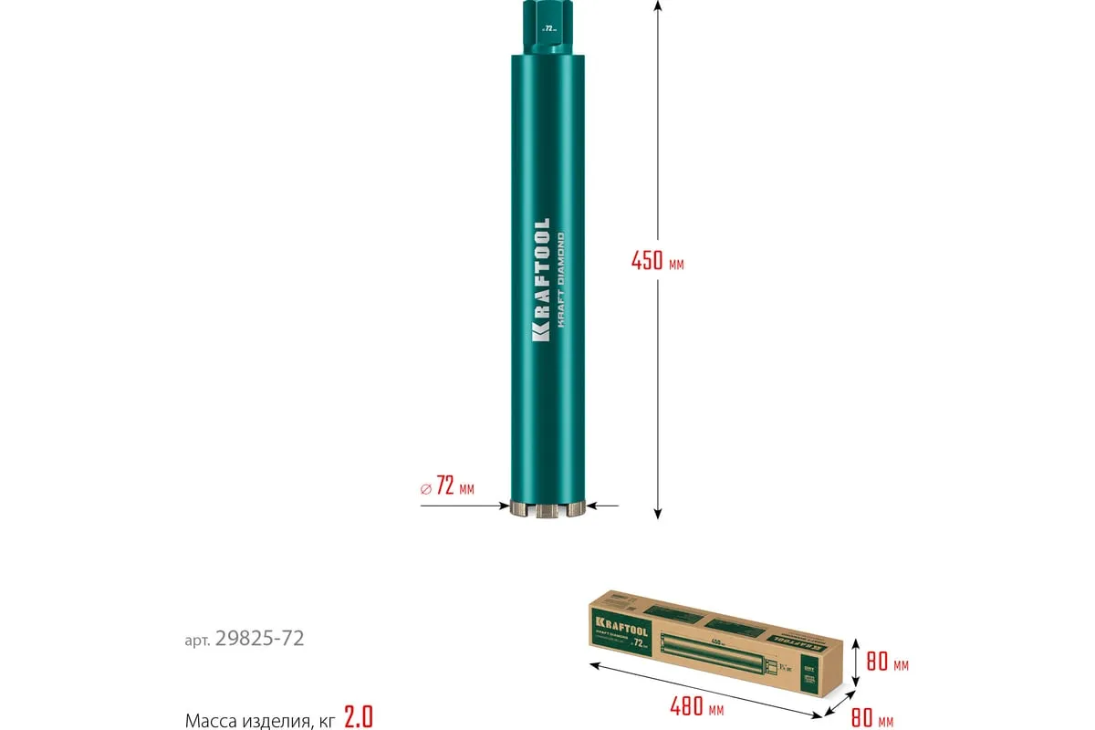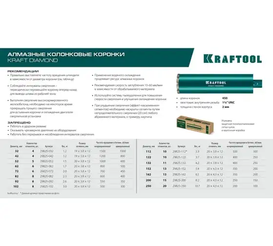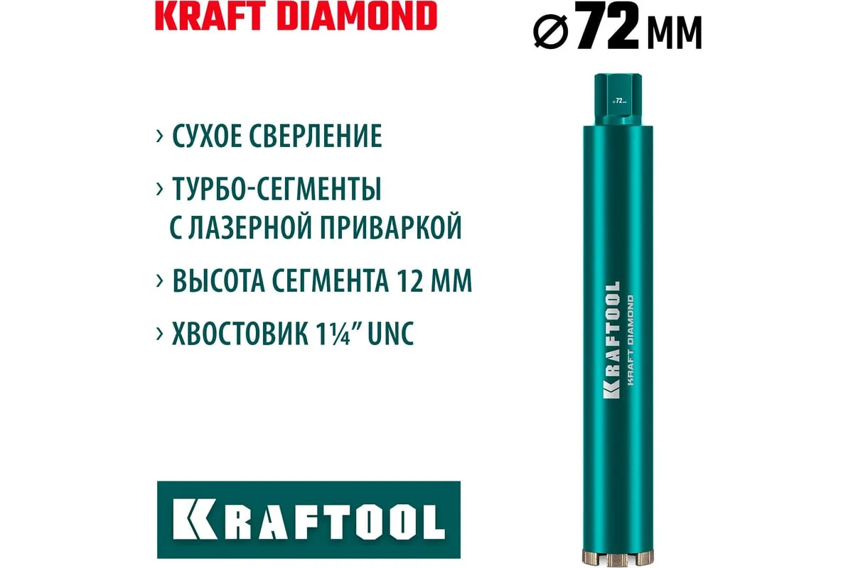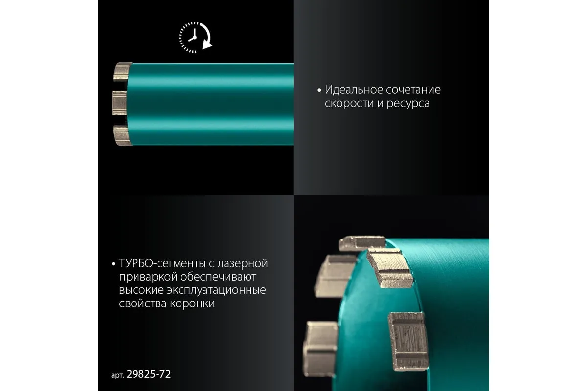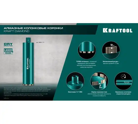 Алмазные колонковые коронки используются для бурения крупных проемов и отверстий в бетоне при проведении отделочно-строительных работ. Для сухого сверления отверстий в железобетоне, кирпиче и других строительных материалах. Используются с установками алмазного бурения с функцией микроудара мощностью от 1.5 кВт. Преимущества