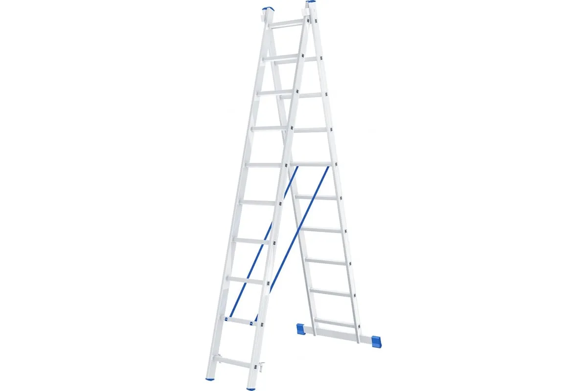 Алюминиевая двухсекционная лестница СИБРТЕХ 2х10 ступеней 97910 подходит для выполнения работ на высоте до 5.3 м. При изготовлении использовался прессованный алюминиевый профиль прямоугольного сечения. Этогарантирует изделию коррозионную стойкость и прочность. Защиту от скольжения на рабочих поверхностях обеспечивают заглушки и широкая траверса.