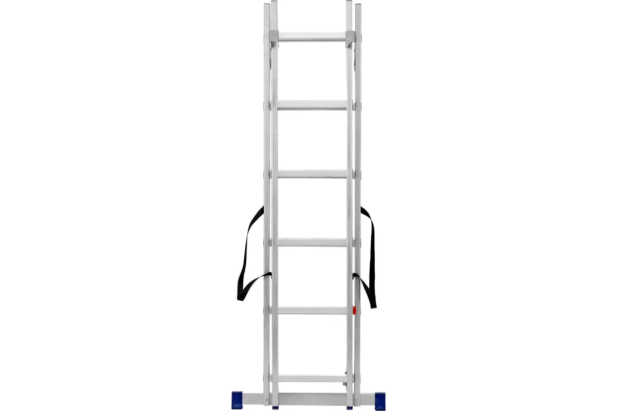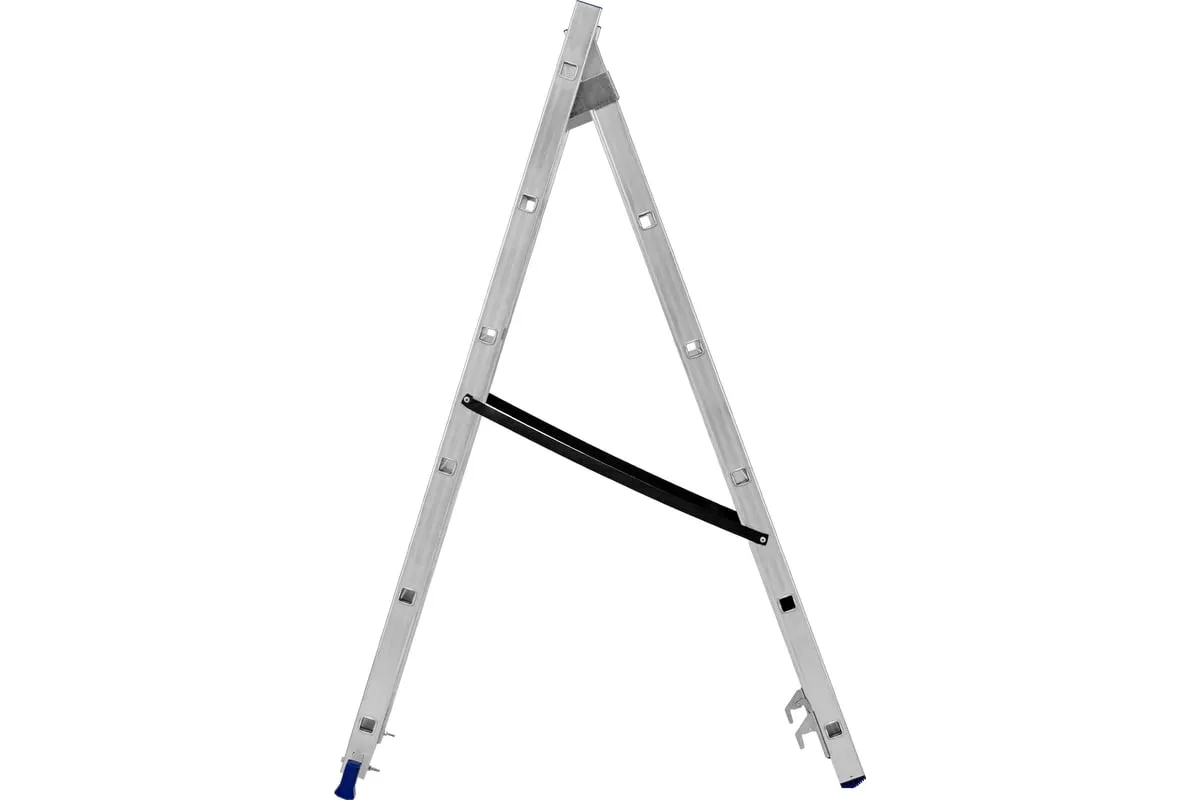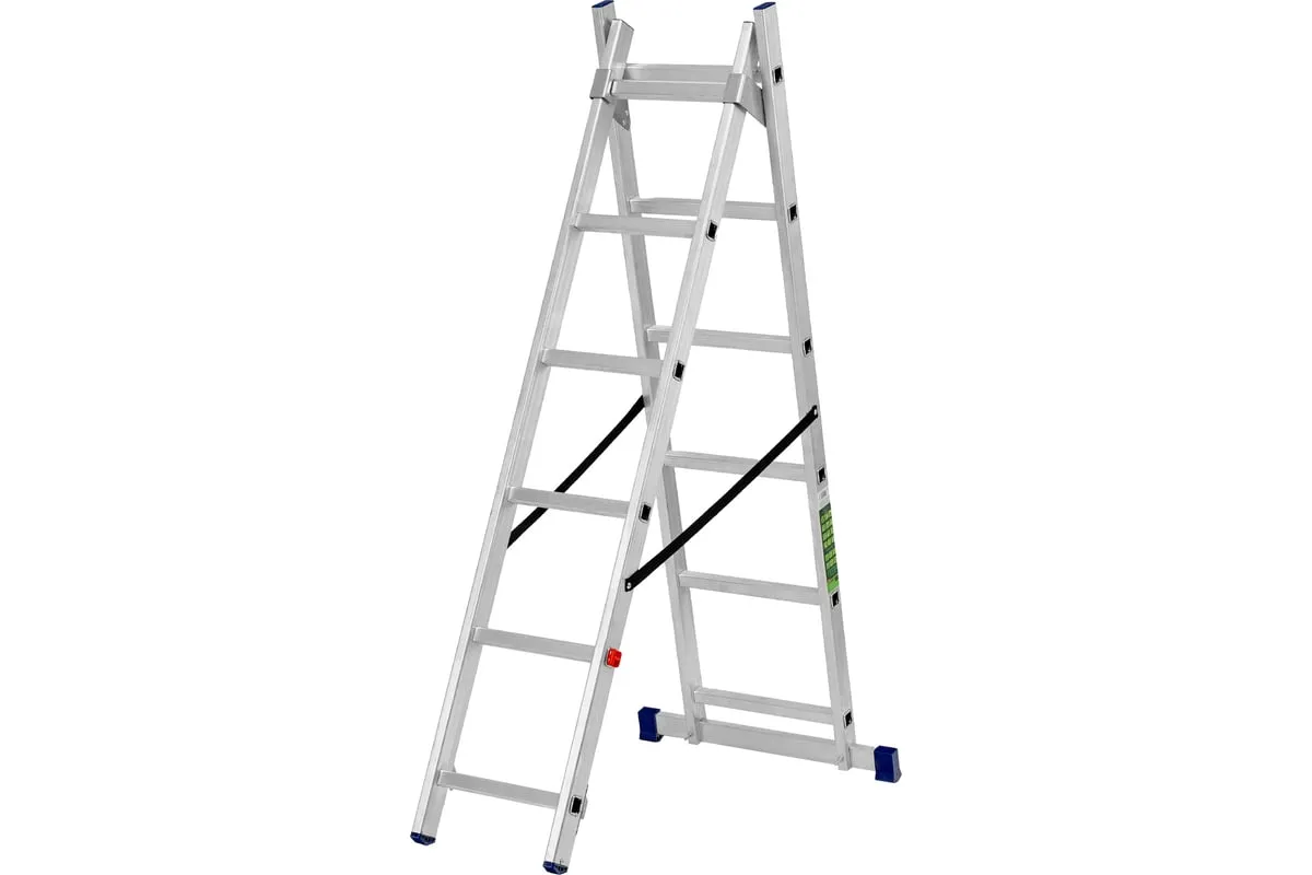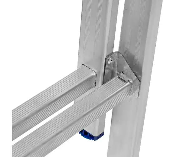 Алюминиевая двухсекционная лестница СИБРТЕХ 2х6 ступеней 97906 подходит для выполнения работ на высоте до 3 м. При изготовлении использовался прессованный алюминиевый профиль прямоугольного сечения. Этогарантирует изделию коррозионную стойкость и прочность. Защиту от скольжения на рабочих поверхностях обеспечивают заглушки и широкая траверса.