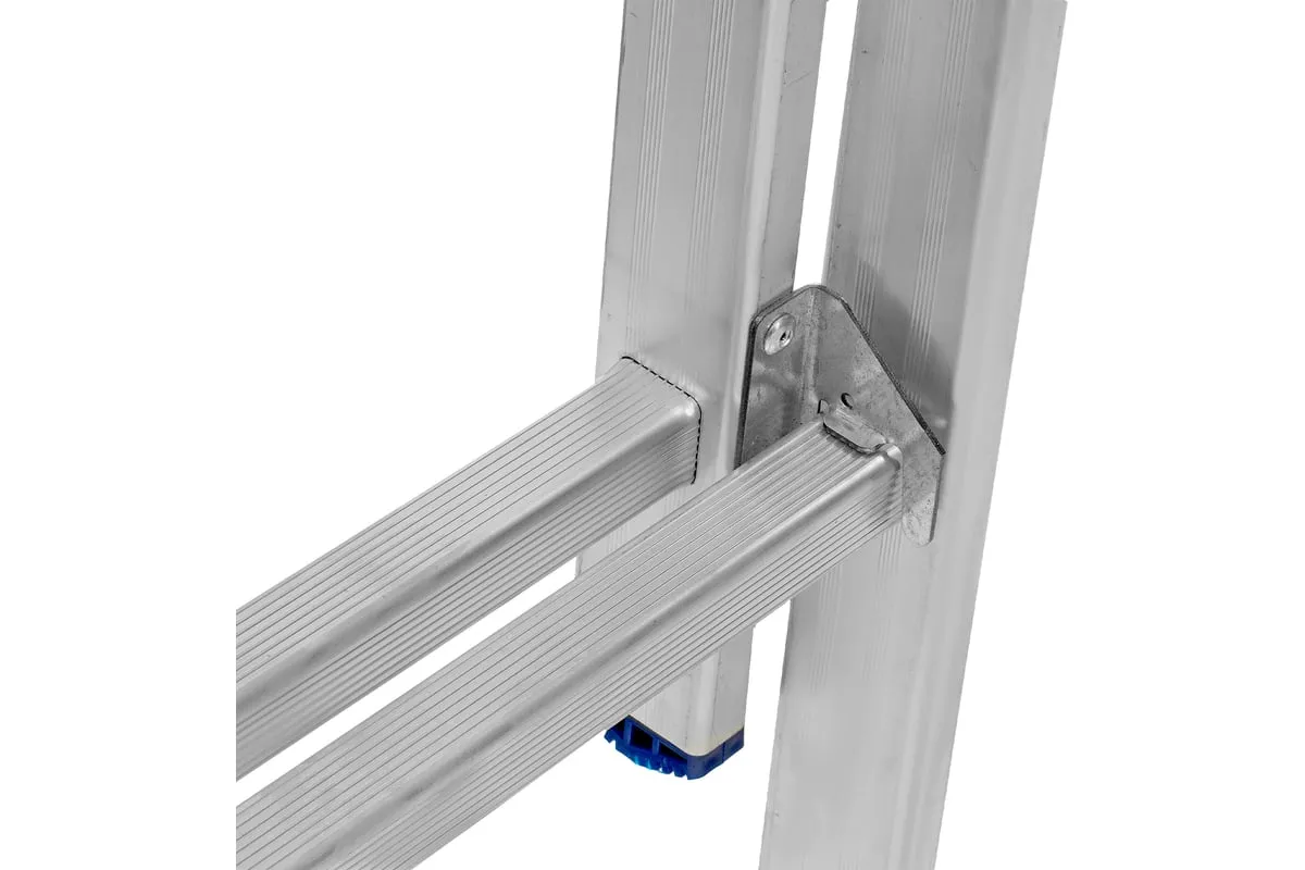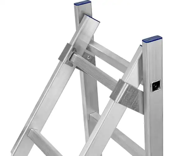 Алюминиевая двухсекционная лестница СИБРТЕХ 2х9 ступеней 97909 подходит для выполнения работ на высоте до 4.7 м. При изготовлении использовался прессованный алюминиевый профиль прямоугольного сечения. Этогарантирует изделию коррозионную стойкость и прочность. Защиту от скольжения на рабочих поверхностях обеспечивают заглушки и широкая траверса.