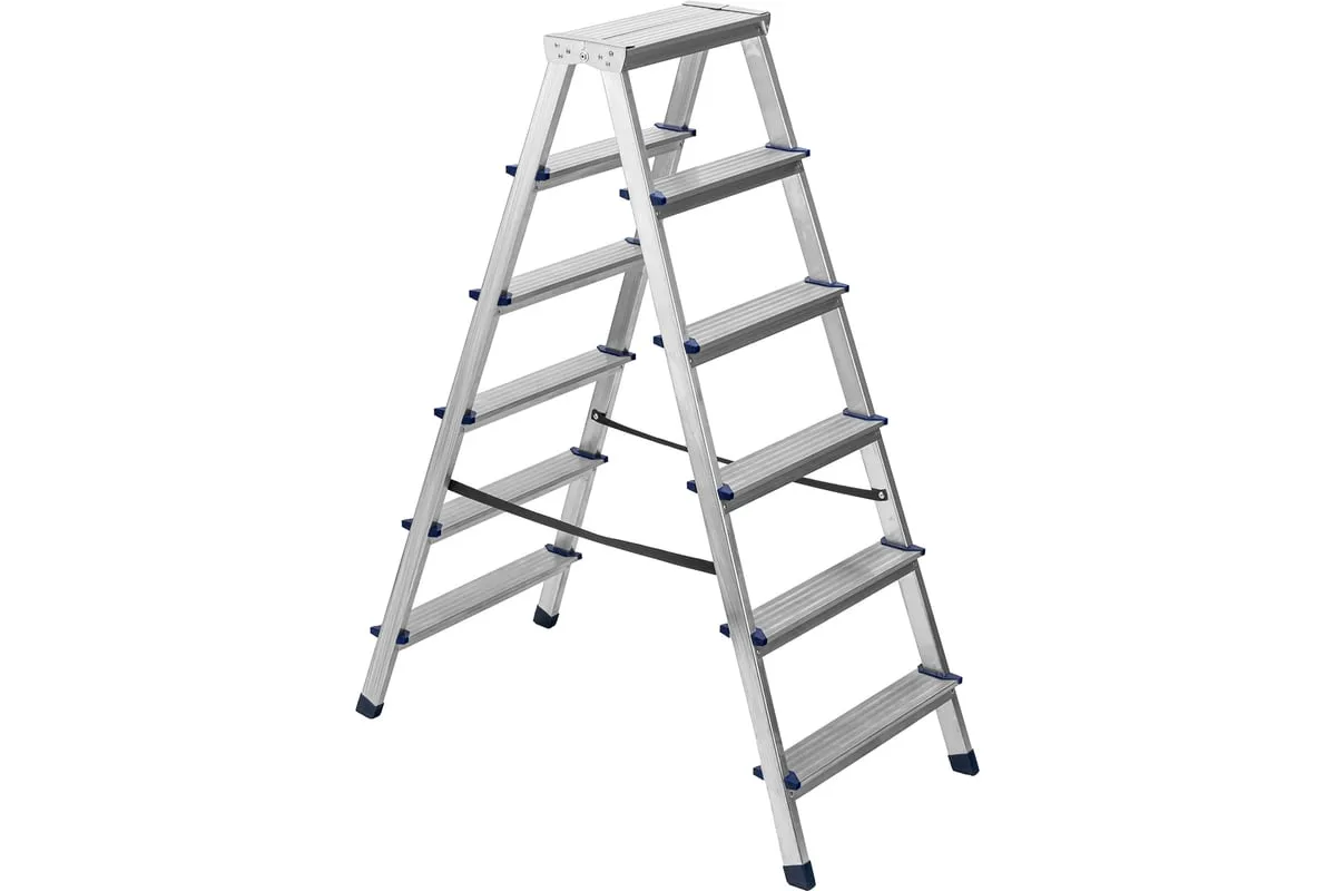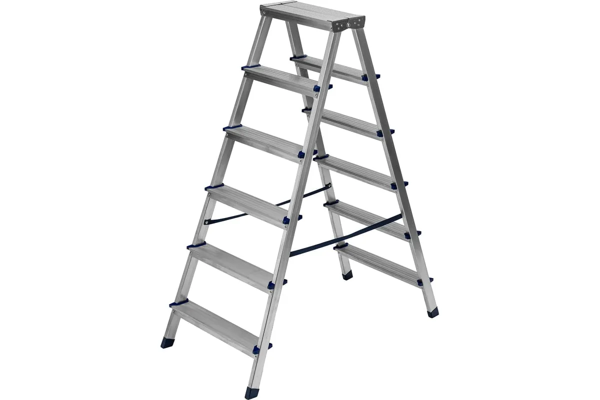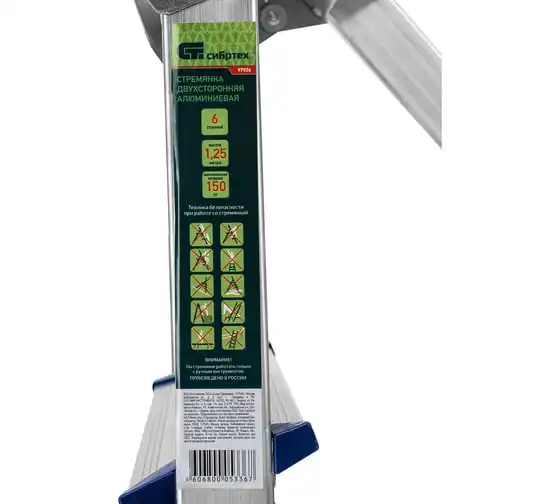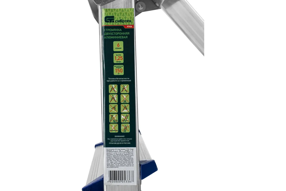 Алюминиевая двусторонняя стремянка СИБРТЕХ 6 ступеней 97926 широко используется в частных домах и квартирах. Имеет широкие рифленые ступени для безопасного подъёма и спуска. При изготовлении использовался прессованный алюминиевый профиль. Этогарантирует изделию коррозионную стойкость и прочность. Изделие оснащено пластиковыми наконечниками, которыеисключают скольжения по поверхности и не повреждают покрытие пола.