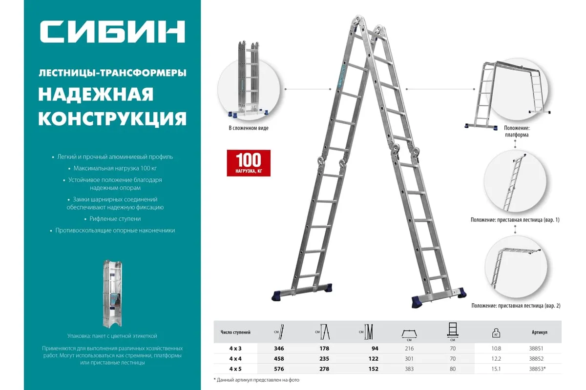 Алюминиевая лестница-трансформер СИБИН 4x4 38852 обладает функциональными преимуществами и удобна в транспортировке. Легко трансформируетсяв три различные модели: стремянку, платформу, приставную лестницу. Выполнена из алюминиевого профиля, устойчивого к внешним воздействиям. Широкие траверсы с антискользящими накладками из пластика обеспечиваютустойчивостьконструкции.