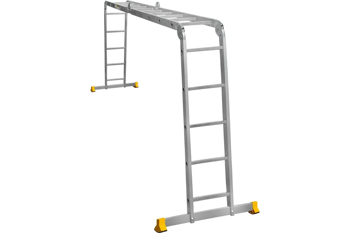 Лестница шарнирная алюминиевая четырехсекционная профессиональная– представляет собой лестницу-трансформер, состоящую из четырех секций,последовательно соединенных между собой стальными шарнирами. Шарнины имеют три угла фиксации,которые обеспечивают лестнице положения: -приставная, -стремянка, -приставная под крышу, -помост только для Т433, Т444(исключительно с штатной площадкой.В комплект не входит).