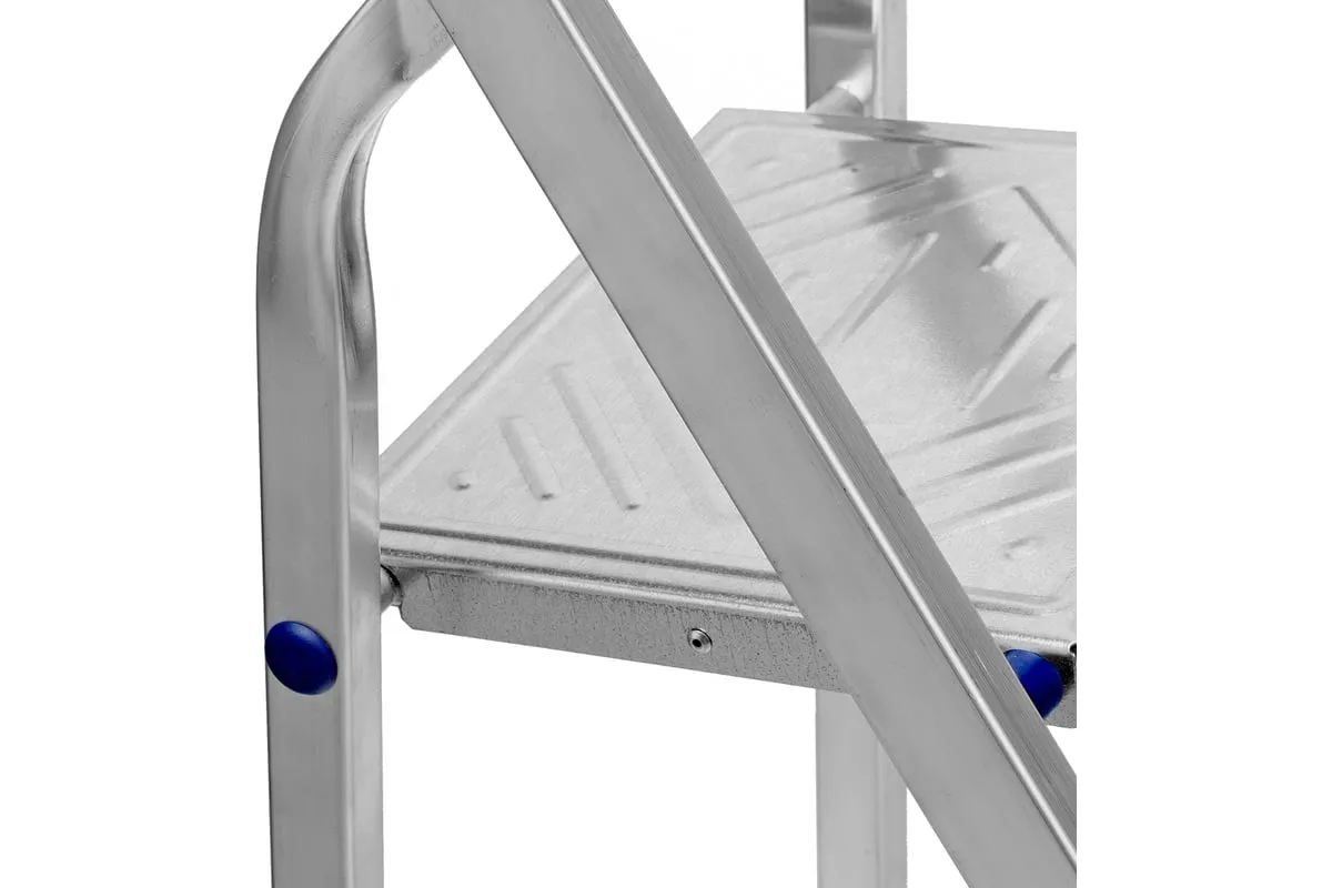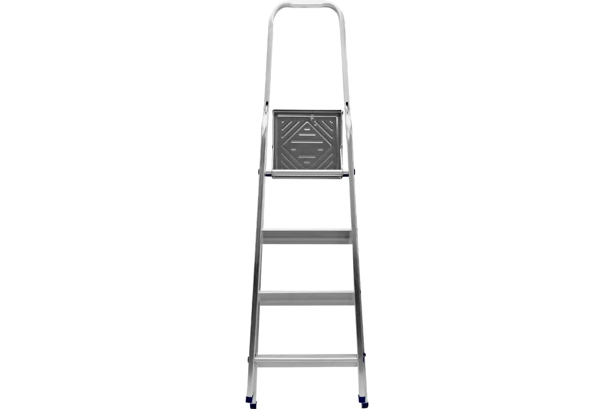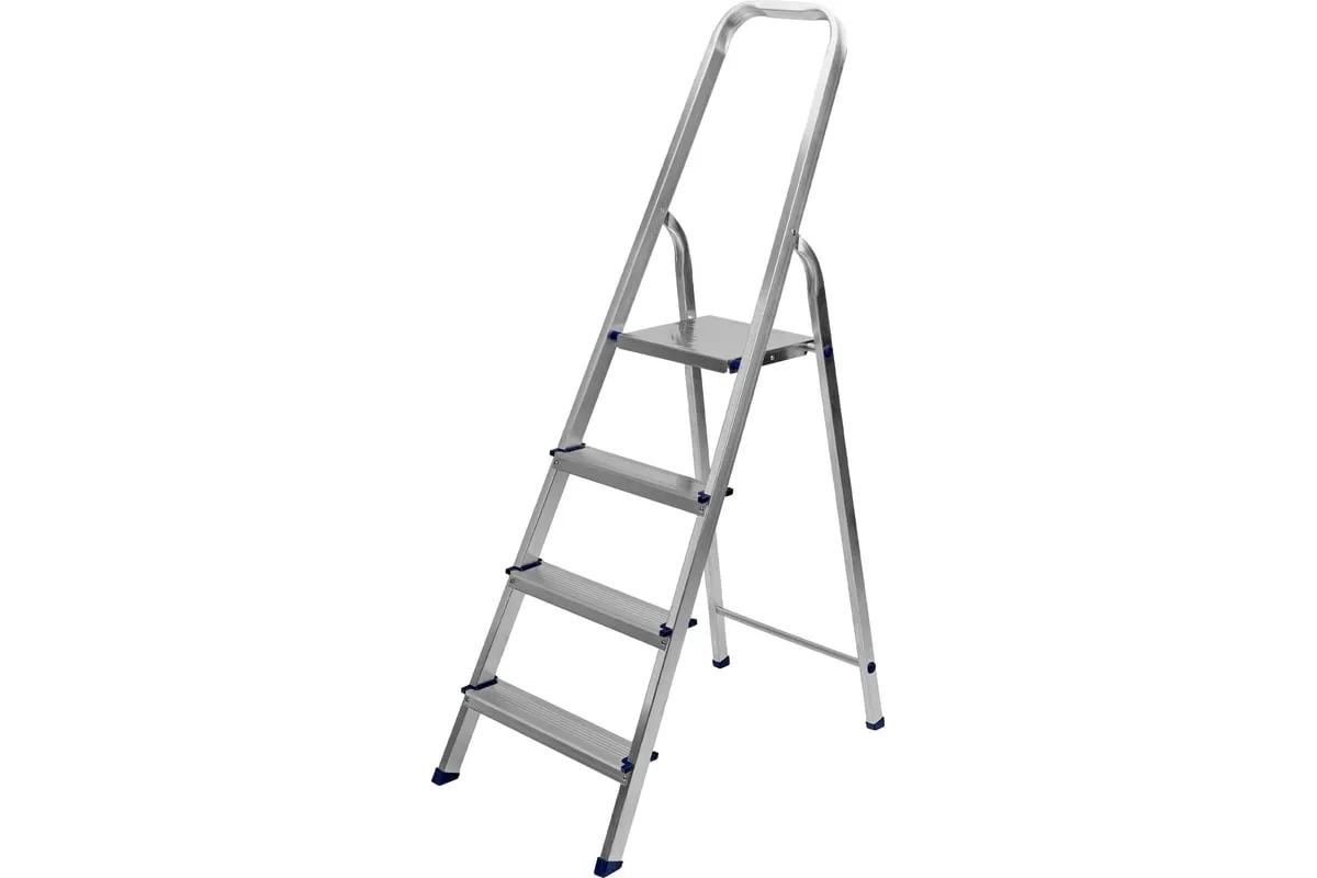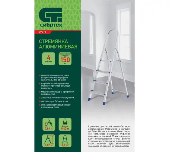 Стремянка алюминиевая Сибртех 97714 с 4 ступенями предназначена для выполнения работ на высоте, превышающей человеческий рост. Высокая дуга безопасности обеспечивает устойчивое положение пользователя. Площадка находится на высоте 80,9 см от опорной поверхности, рабочая высота стремянки составляет 280,9 см (при среднем росте пользователя 170 см). Стремянка пригодится во время строительных и ремонтных работ, позволит без лишних усилий повесить картину или шторы, покрасить стену, достать нужную вещь с антресолей или верхней полки шкафа, а также решить много других бытовых задач. Стремянка устанавливается на плоскую поверхность и не предназначена для работы с электроинструментом.