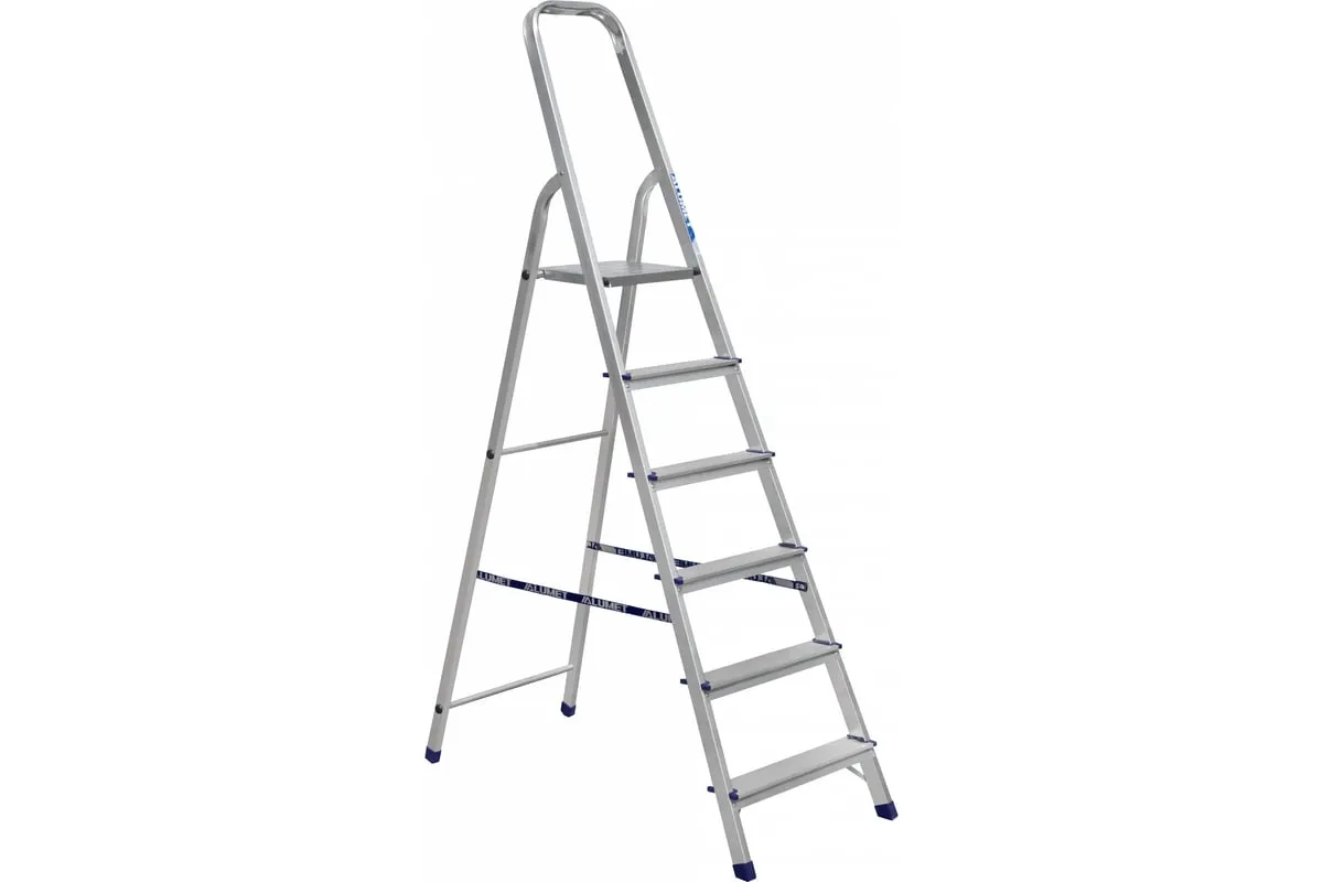 Стремянка алюминиевая -представляет собой свободностоящую переносную лестницу, сужающуюся к верху, имеющую одну сторону для подъема, и оборудованную дугой безопасности, конструктивно выполненной совместно со стороной подъема.