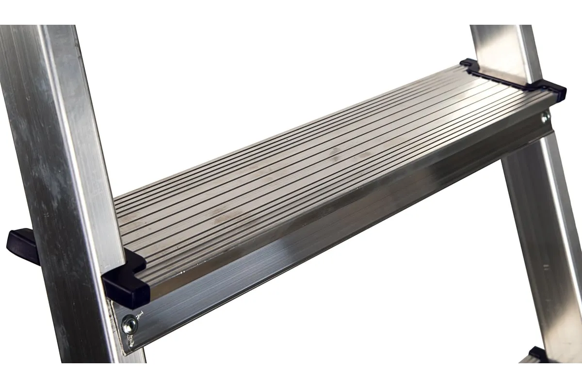 Тетивы и ступени стремянки изготовлены из высокопрочного алюминиевого сплава (ГОСТ 22233-2018), что обеспечивает прочность и долговечность при минимальном весе.