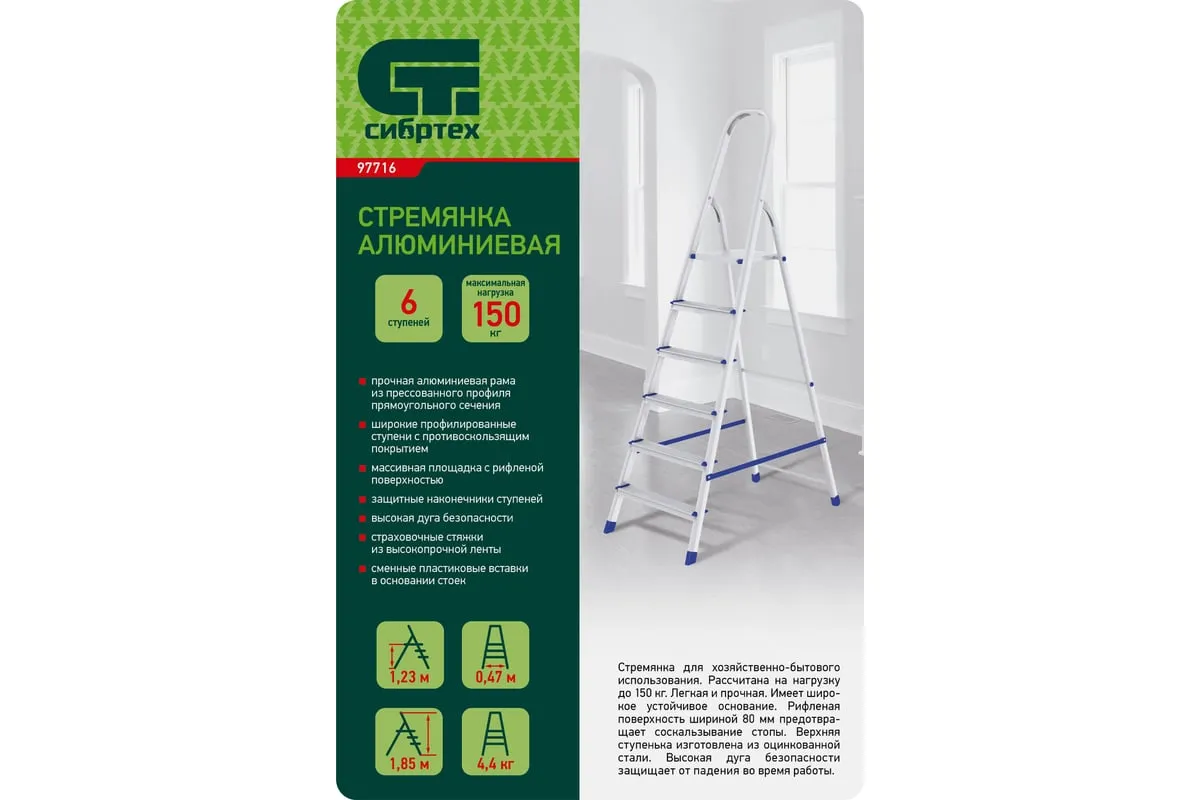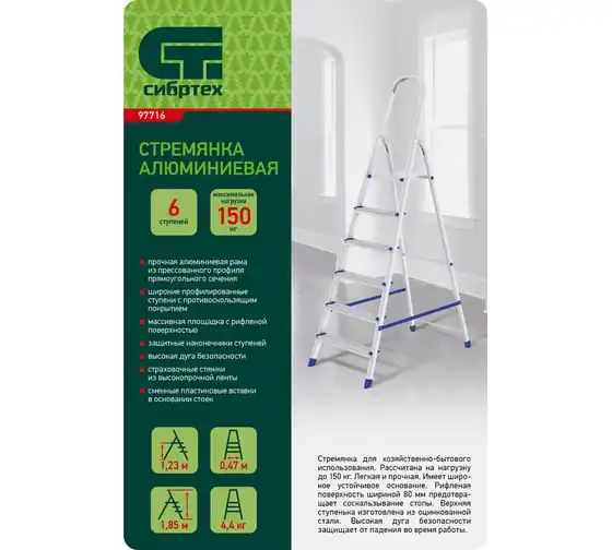 Алюминиевая стремянка СИБРТЕХ 6 ступеней 97716 используется для осуществления различных работ на высоте, например, для внутренней отделки помещений или сбора плодов с деревьев в саду и пр. Широкие профилированные ступениобеспечивают безопасный спуск/подъем, удобство при длительной работе на высоте. Благодаря наличию высокой дуги работник может безопасно выполнять различные высотные работы. Страховочные ремни предотвращают случайное складывание стремянки.