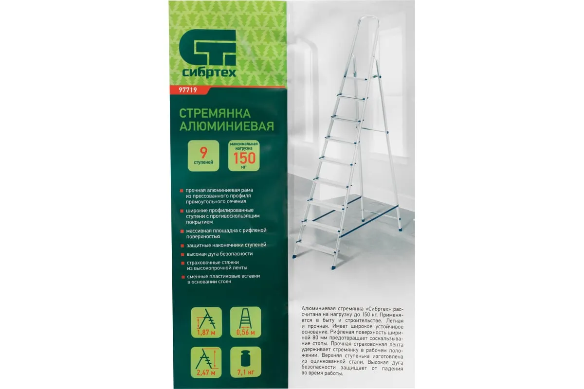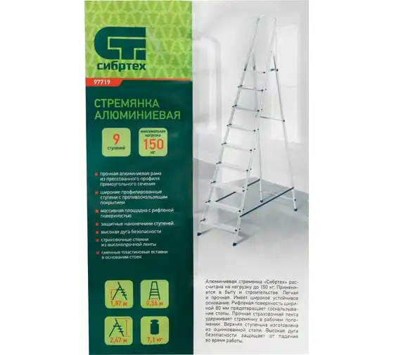 Алюминиевая стремянка СИБРТЕХ 9 ступеней 97719 используется для осуществления различных работ на высоте, например, для внутренней отделки помещений или сбора плодов с деревьев в саду и пр. Широкие профилированные ступениобеспечивают безопасный спуск/подъем, удобство при длительной работе на высоте. Благодаря наличию высокой дуги работник может безопасно выполнять различные высотные работы. Страховочные ремни предотвращают случайное складывание стремянки.