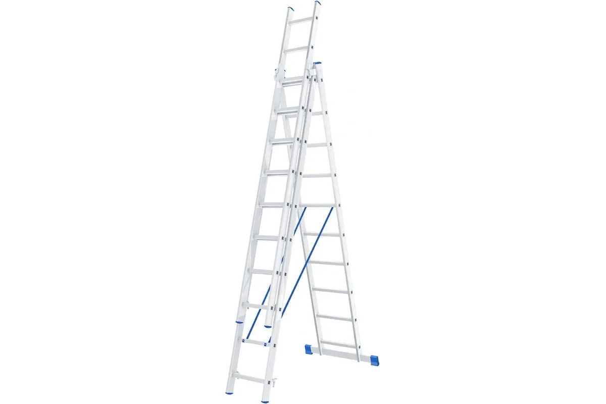 Алюминиевая трехсекционная лестница СИБРТЕХ 3х10 ступеней 97820 применяется для высотных работ, как покраска фасада дома, монтирование электроосветительных приборов, работа в саду и др. Трансформируется в четыре различные формы и подходит для выполнения работ на высоте до 5.25 м. Защиту от скольжения на рабочих поверхностях обеспечивают заглушки и широкая траверса.