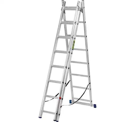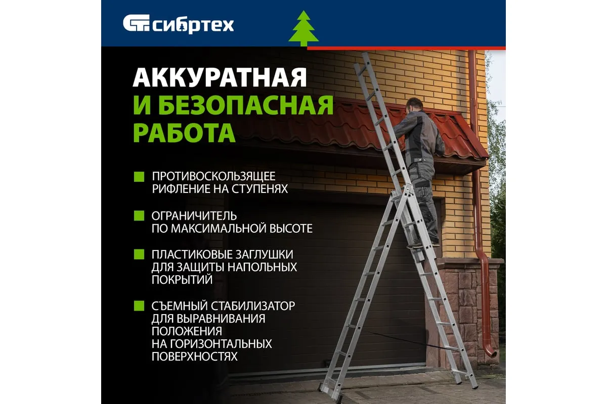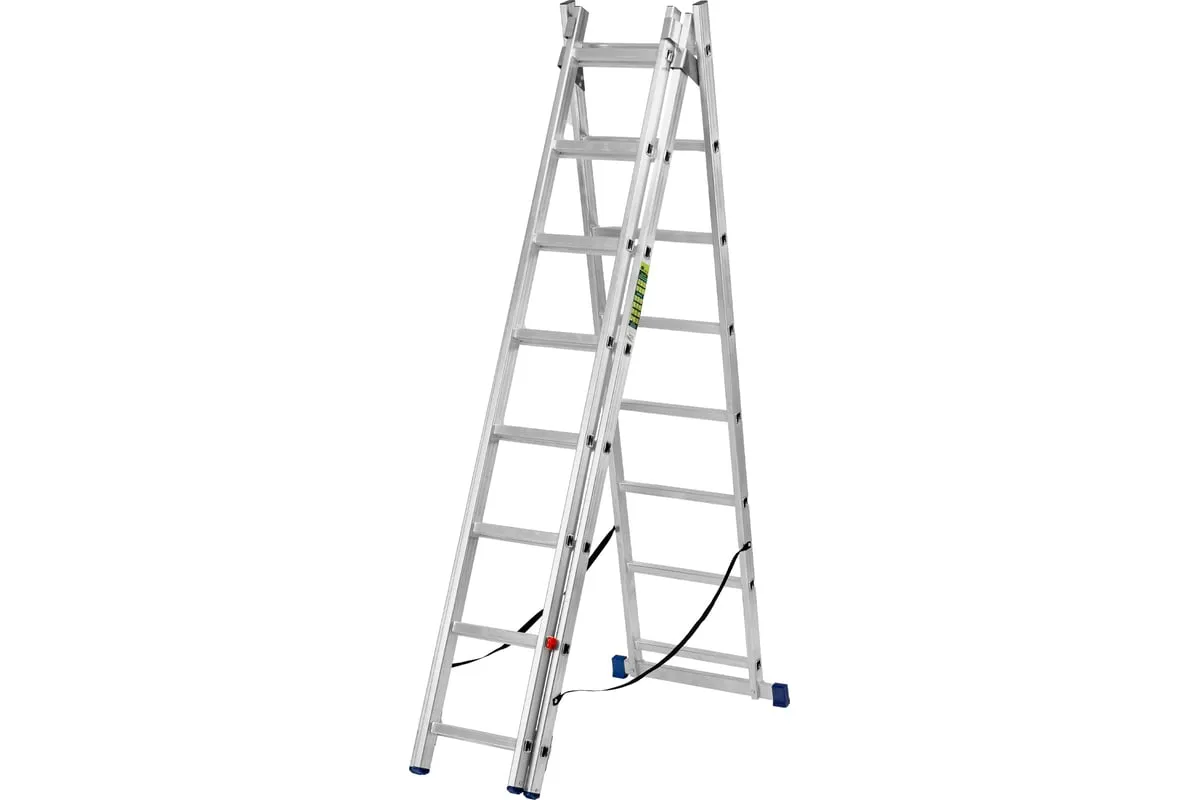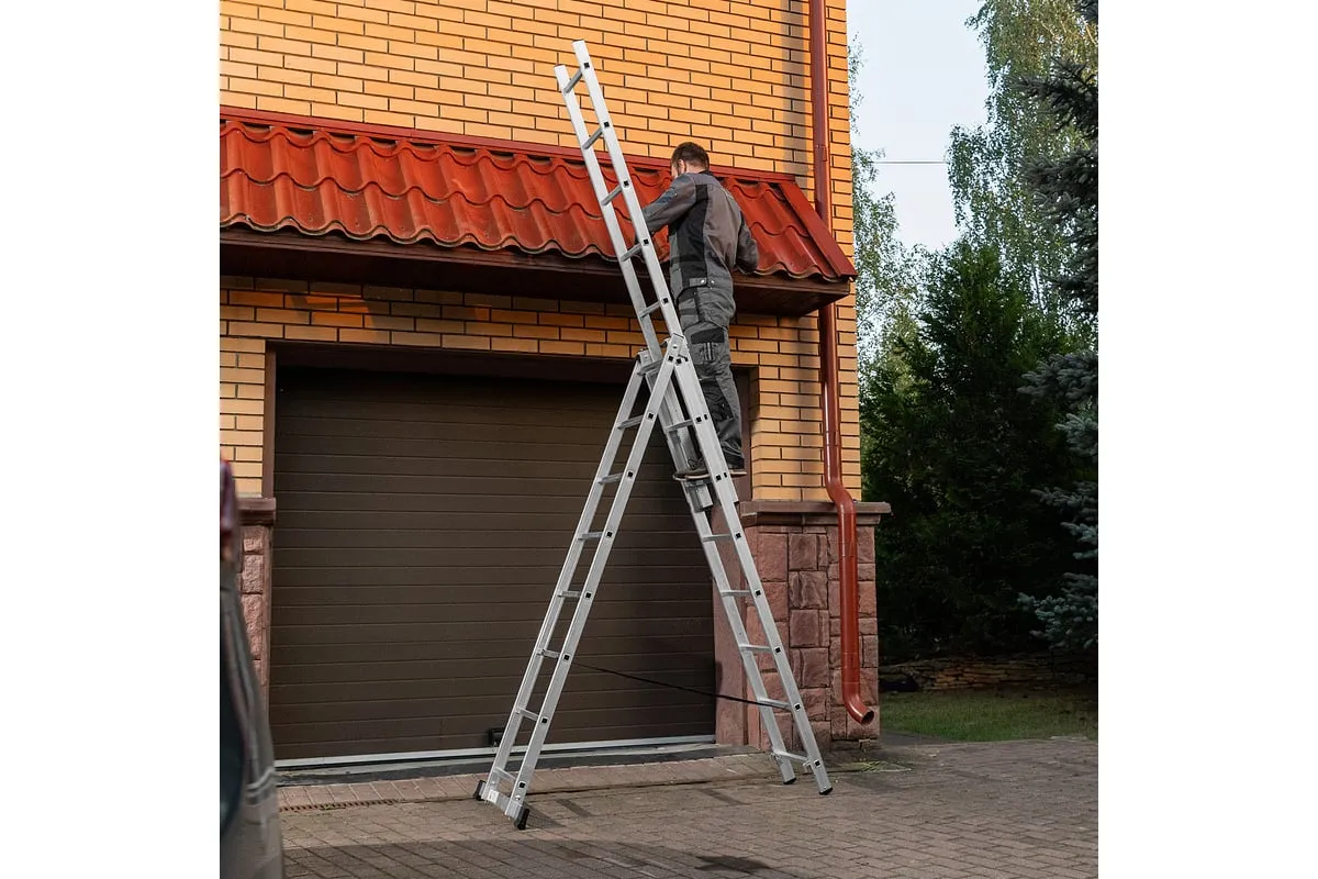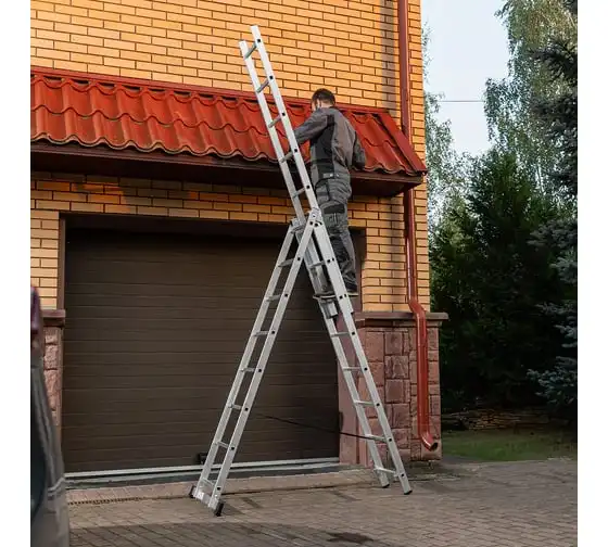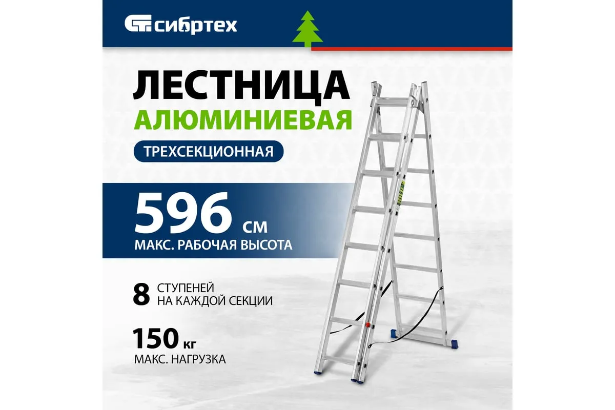 Алюминиевая трехсекционная лестница СИБРТЕХ 3х8 ступеней 97818 применяется для высотных работ, как покраска фасада дома, монтирование электроосветительных приборов, работа в саду и др. Трансформируется в четыре различные формы и подходит для выполнения работ на высоте до 4.15 м. Защиту от скольжения на рабочих поверхностях обеспечивают заглушки и широкая траверса.