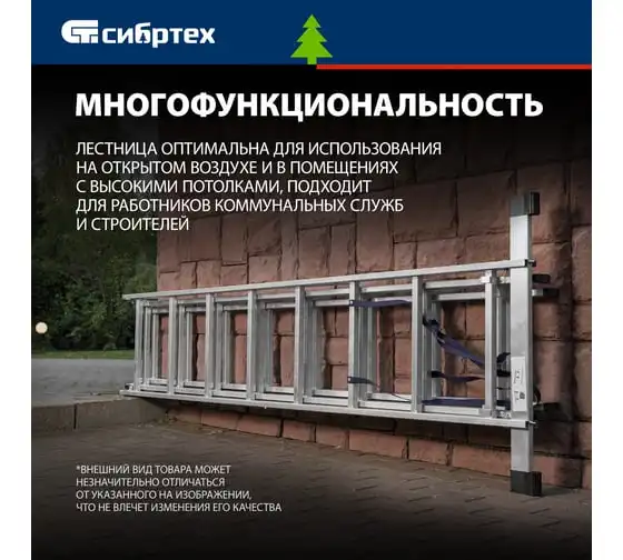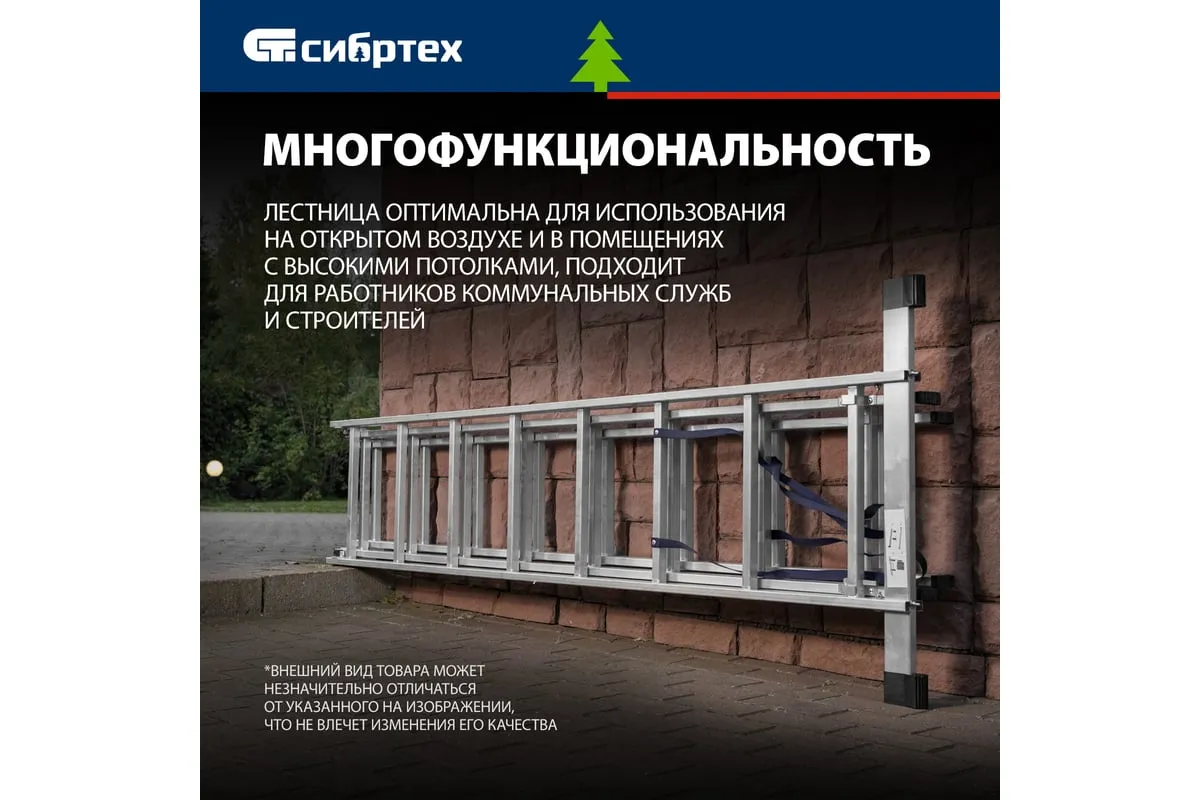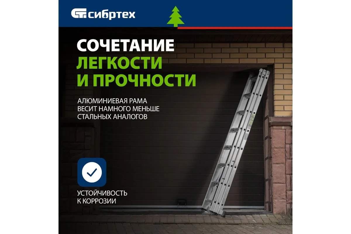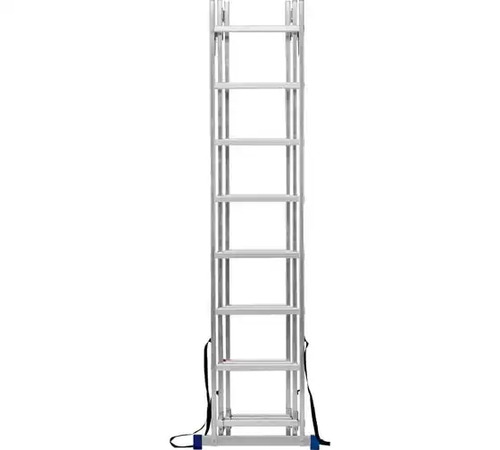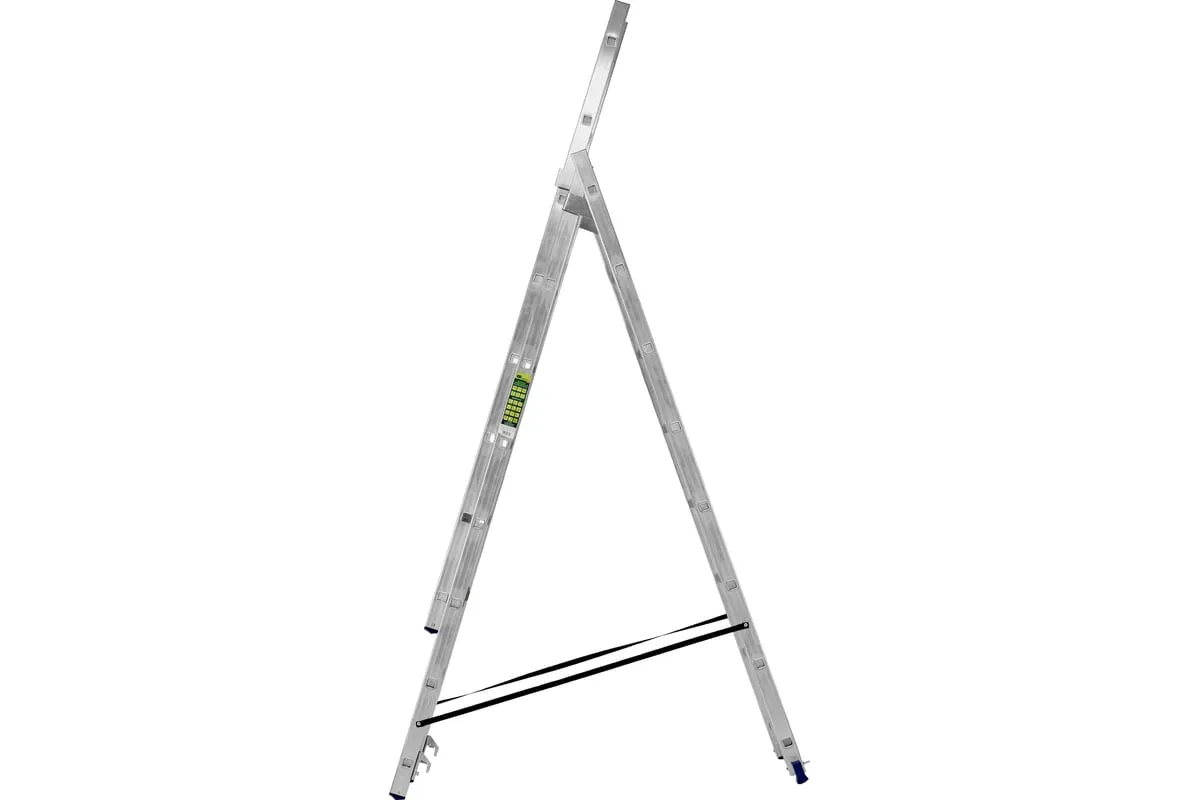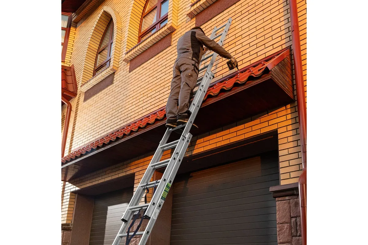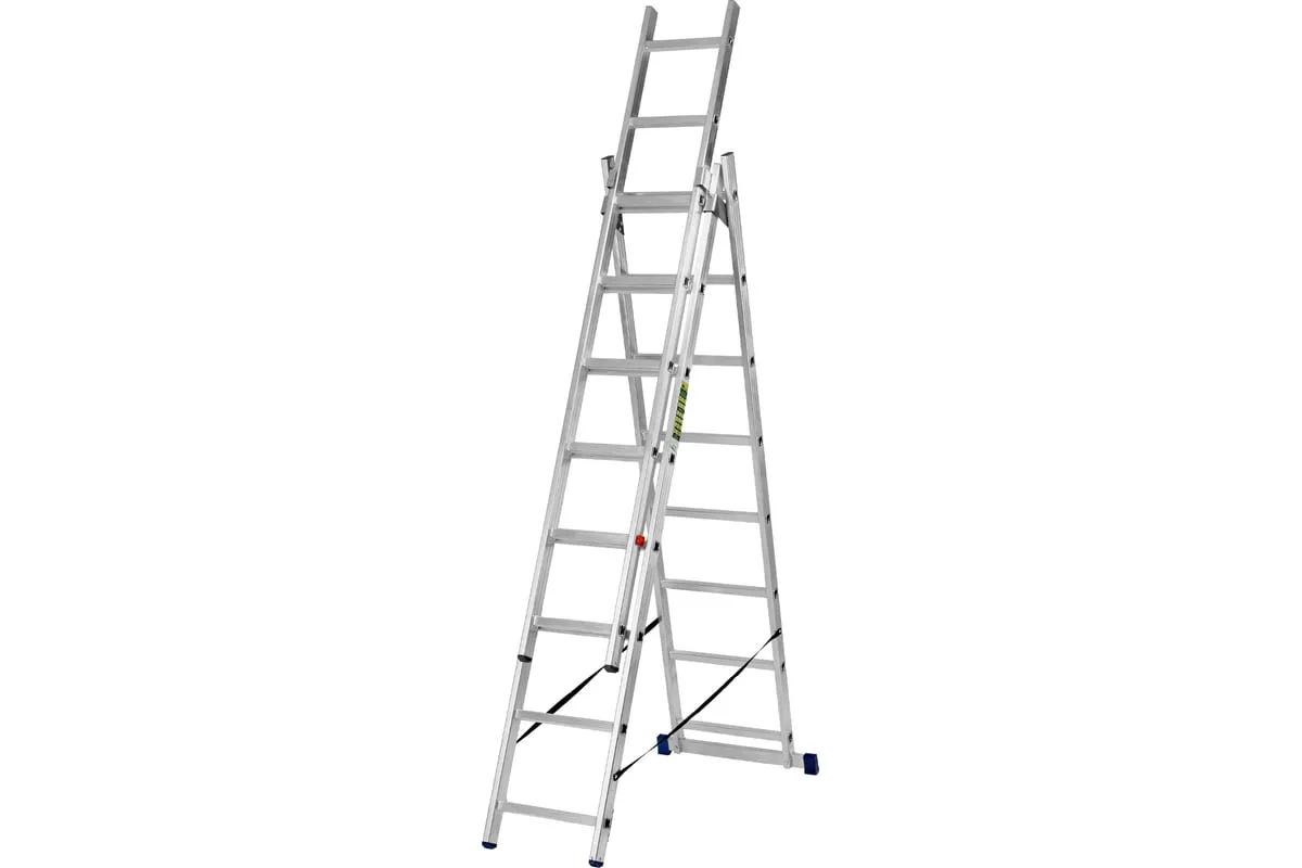 Алюминиевая трехсекционная лестница СИБРТЕХ 3х8 ступеней 97818 применяется для высотных работ, как покраска фасада дома, монтирование электроосветительных приборов, работа в саду и др. Трансформируется в четыре различные формы и подходит для выполнения работ на высоте до 4.15 м. Защиту от скольжения на рабочих поверхностях обеспечивают заглушки и широкая траверса.