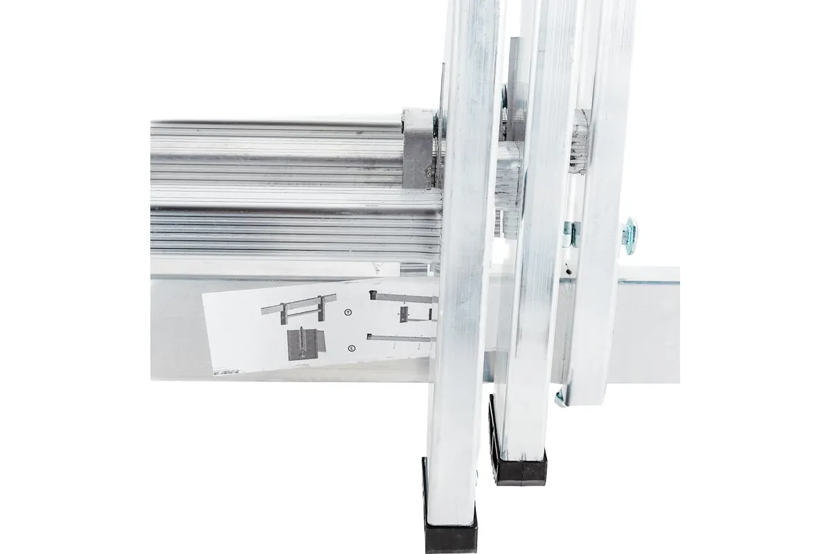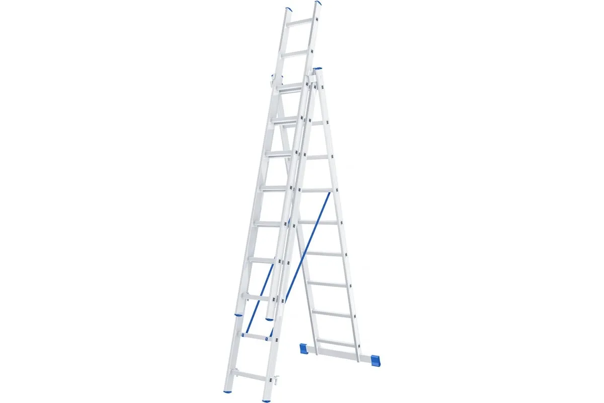 Алюминиевая трехсекционная лестница СИБРТЕХ 3х9 ступеней 97819 применяется для высотных работ, как покраска фасада дома, монтирование электроосветительных приборов, работа в саду и др. Трансформируется в четыре различные формы и подходит для выполнения работ на высоте до 4.7 м. Защиту от скольжения на рабочих поверхностях обеспечивают заглушки и широкая траверса.