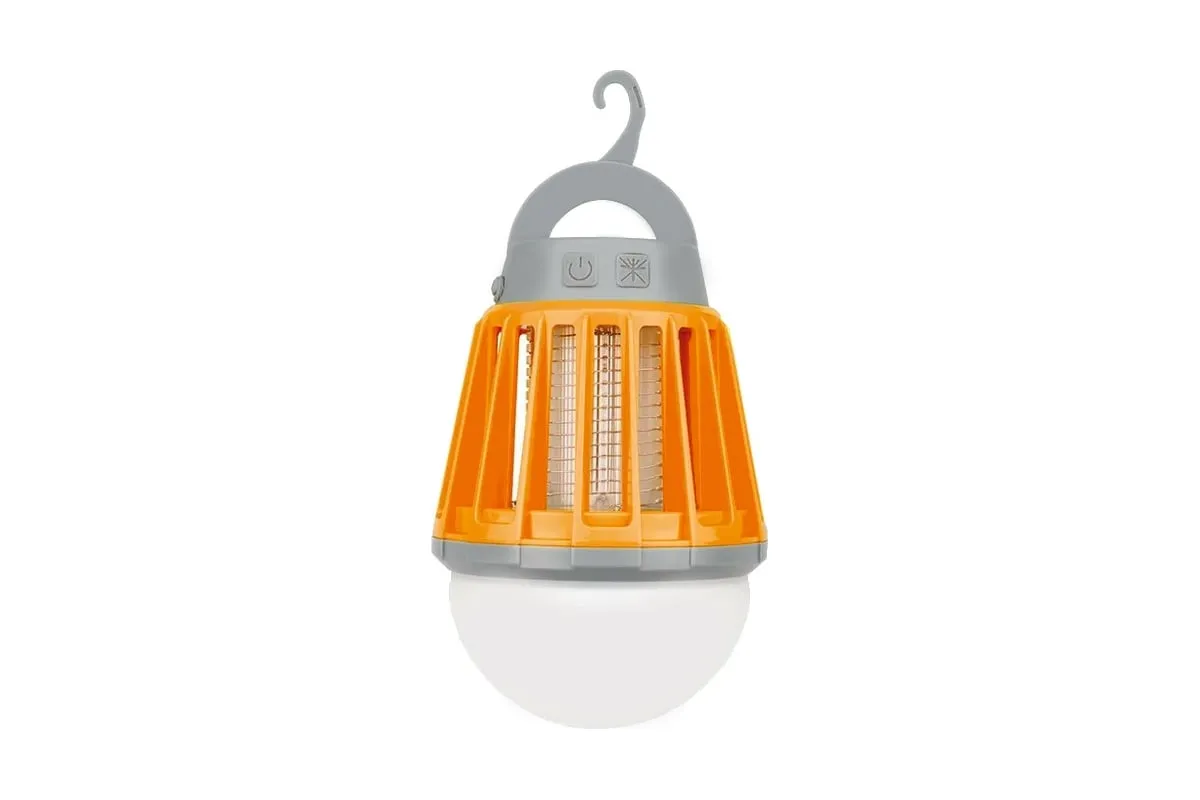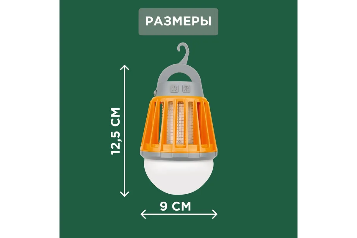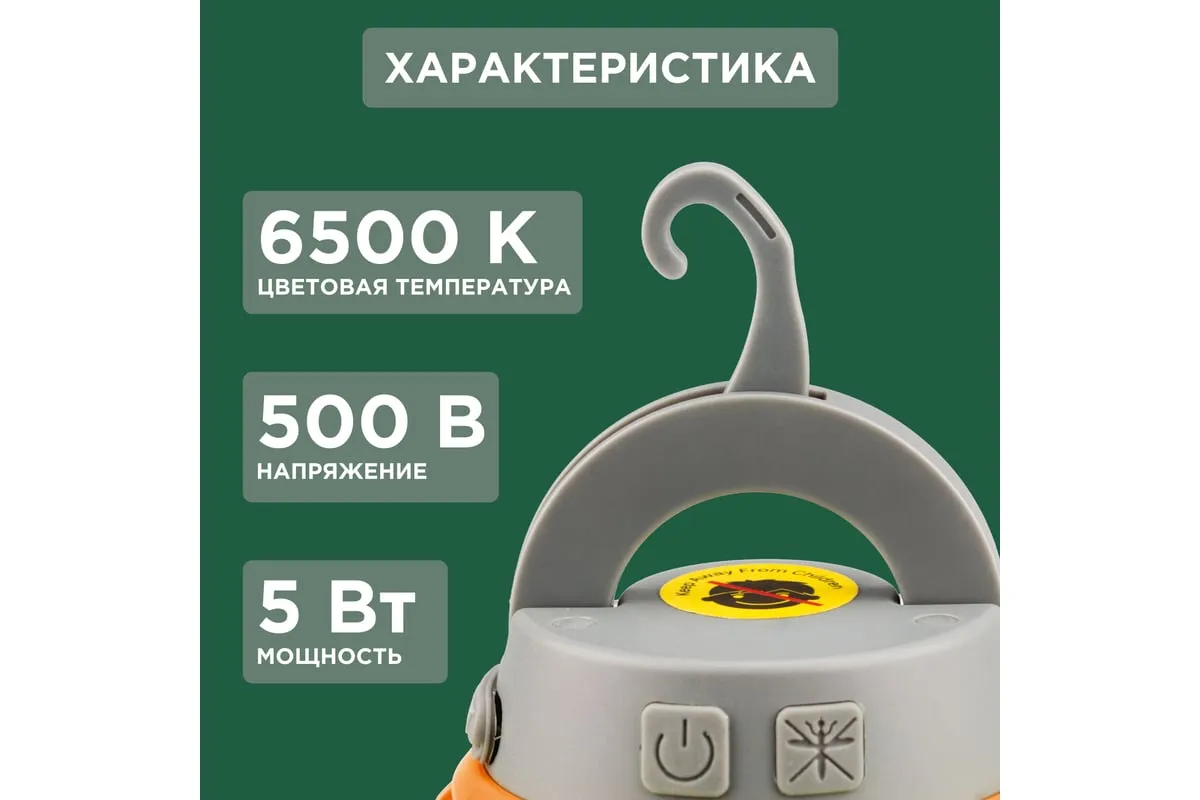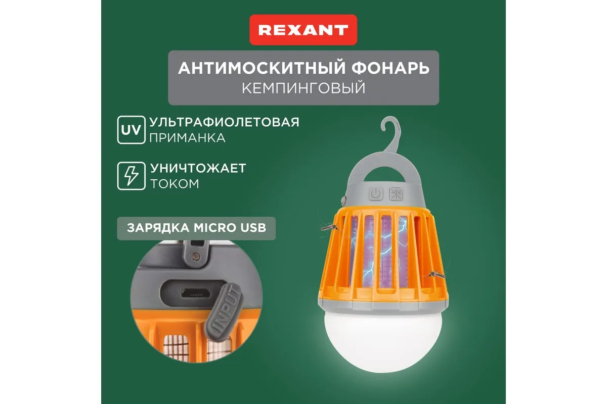Антимоскитный кемпинговый фонарь REXANT сочетает в себе сразу 2 прибора: кемпинговый фонарь и уничтожитель насекомых. Прибор привлекает насекомых ультрафиолетовым свечением и мгновенно убивает их током. Может использоваться как внутри помещений, так и снаружи, например, для освещения палатки, беседки или просто как фонарь, благодаря влагозащищенному корпусу.