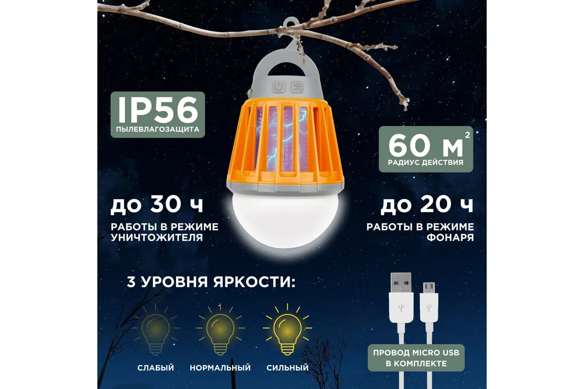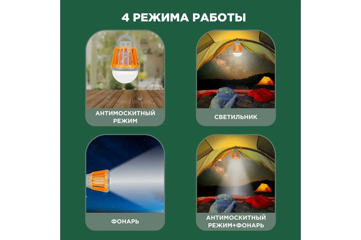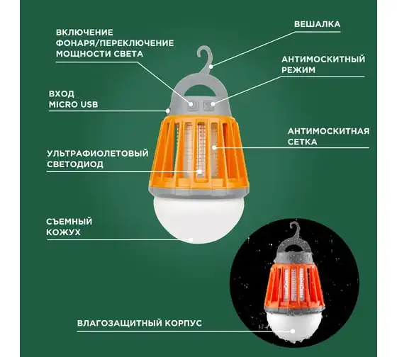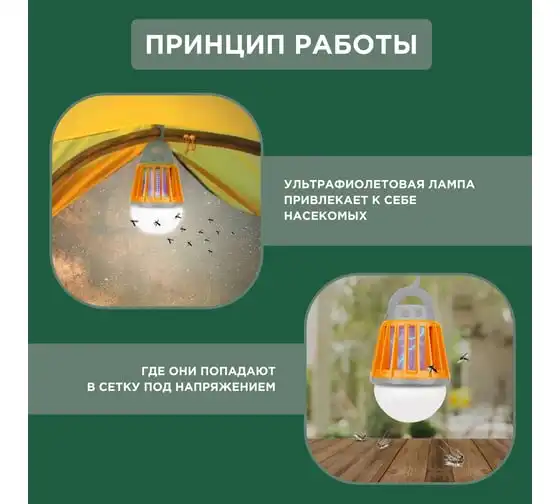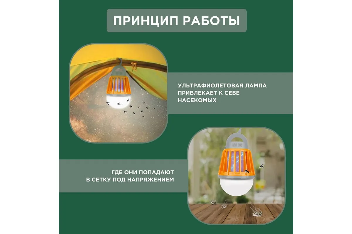 Антимоскитный кемпинговый фонарь REXANT сочетает в себе сразу 2 прибора: кемпинговый фонарь и уничтожитель насекомых. Прибор привлекает насекомых ультрафиолетовым свечением и мгновенно убивает их током. Может использоваться как внутри помещений, так и снаружи, например, для освещения палатки, беседки или просто как фонарь, благодаря влагозащищенному корпусу.