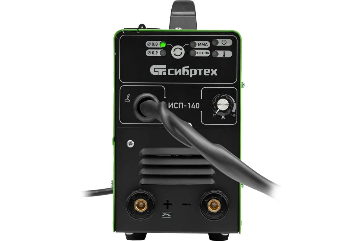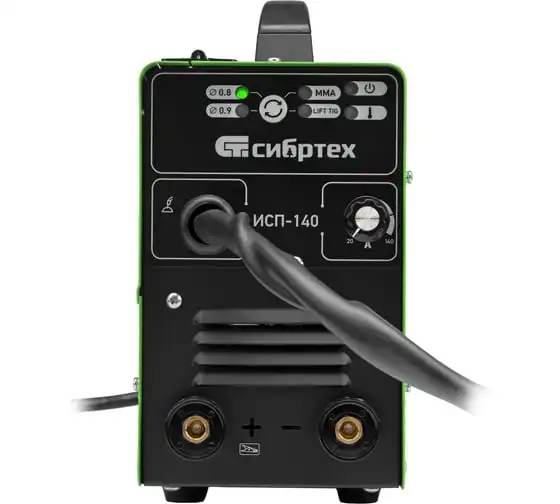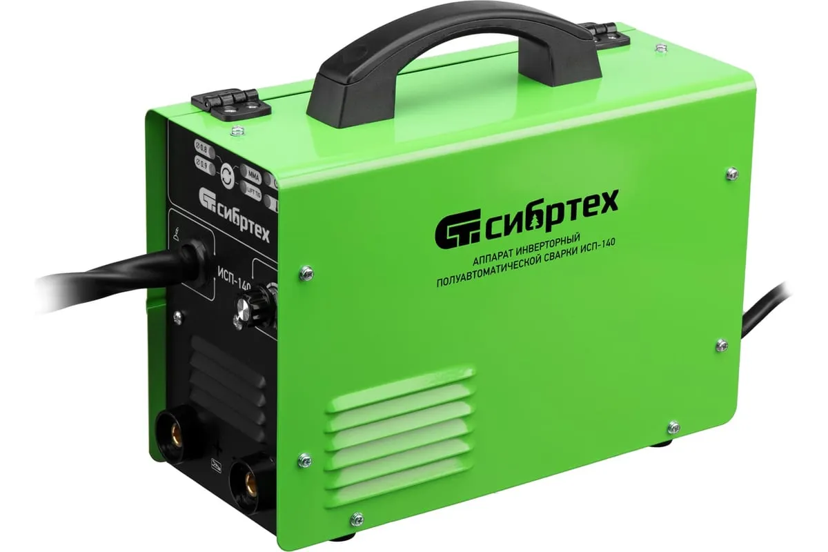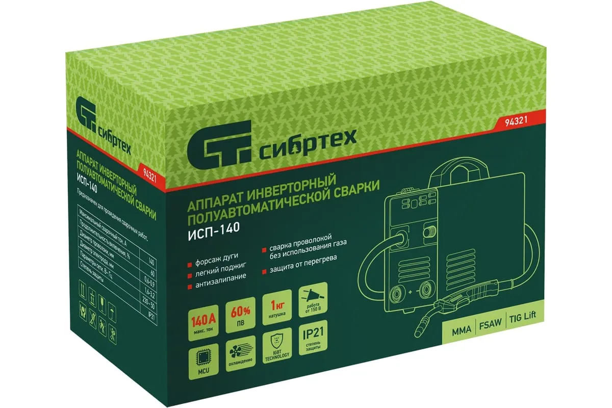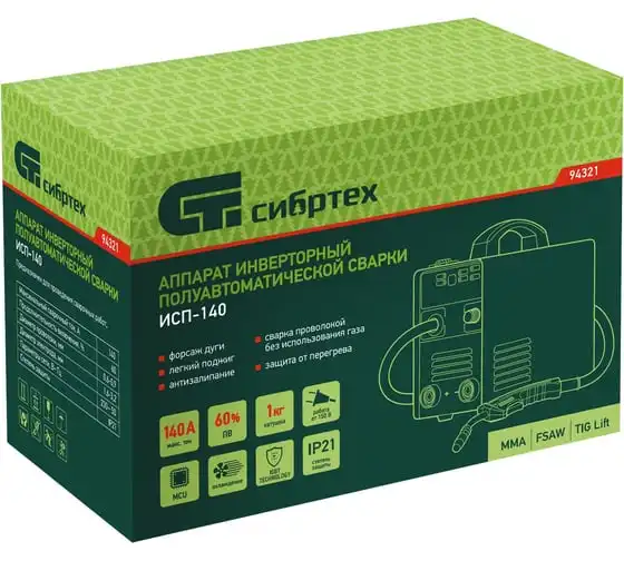 Инверторный аппарат полуавтоматической сварки Сибртех ИСП-140 94321 работает с максимальным сварочным током 140 А, время продолжительности включения составляет 60%. Аппарат позволяет работать в режимах MMA (сварка покрытым электродом диаметром до 4 мм), сварки флюсовой проволокой FCAW диаметром 0,8/0,9 мм без подачи газа и в режиме аргонодуговой сварки неплавящимся вольфрамовым электродом LIFT TIG (горелка в комплект не входит). Применение передовой инверторной технологии IGBT обеспечивает стабильный постоянный сварочный ток на выходе. Аппарат подходит для профессионального использования.