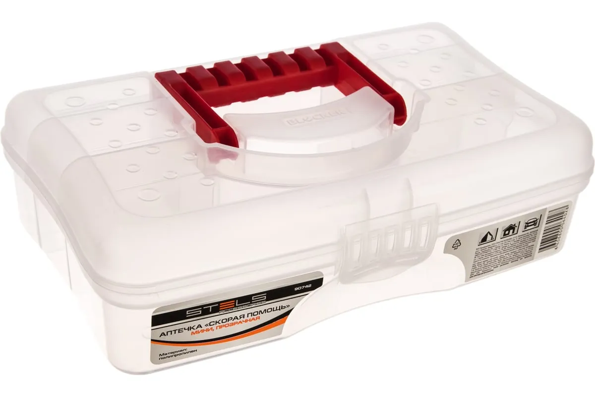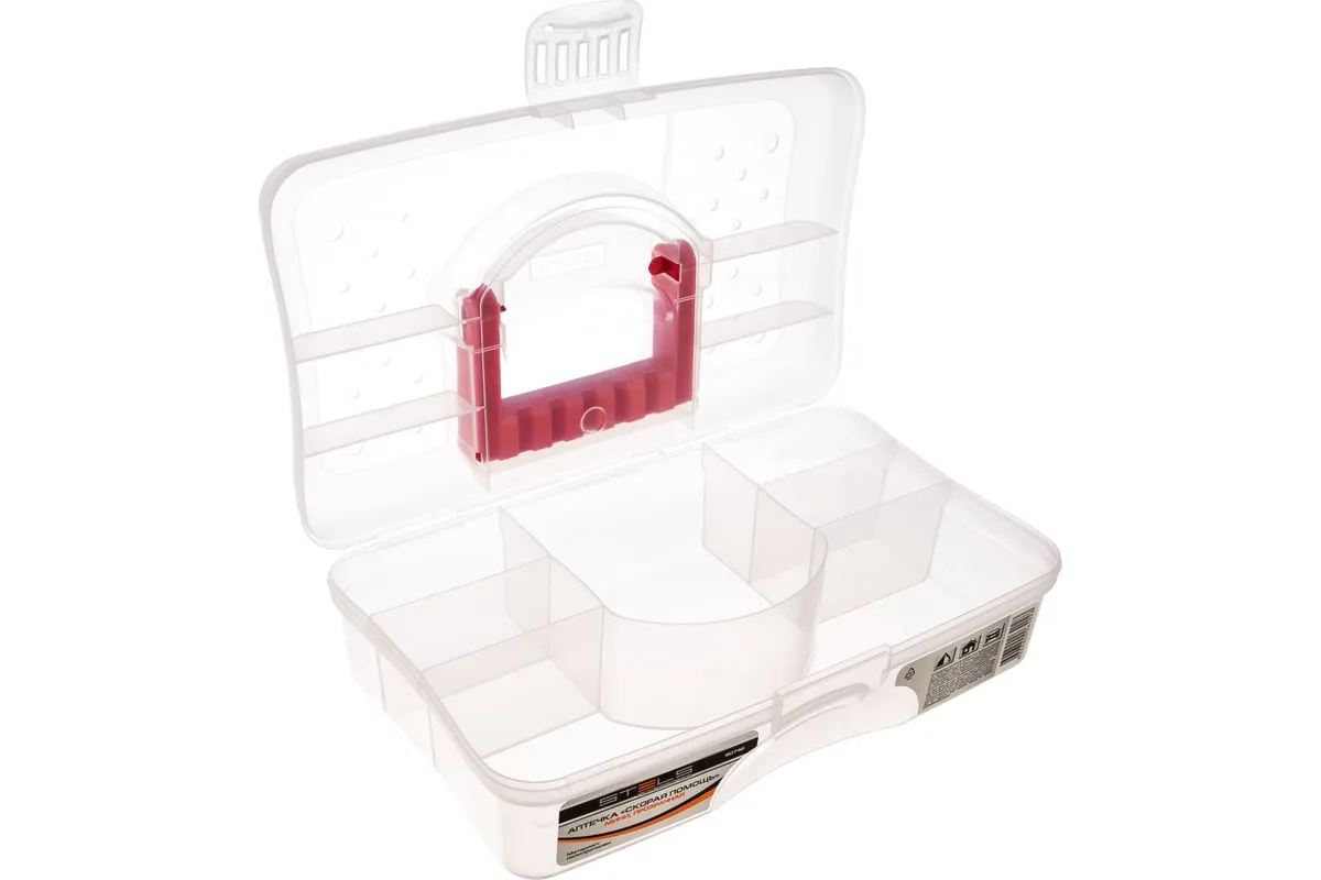 Аптечка Скорая помощь мини прозрачная STELS 90742 обладает небольшими размерами и разделена на 6 ячеек, что позволяет хранить внутри лекарства и препараты раздельно друг от друга.