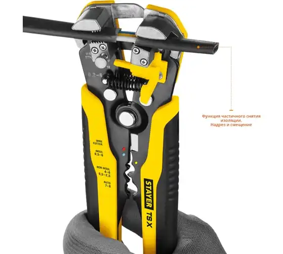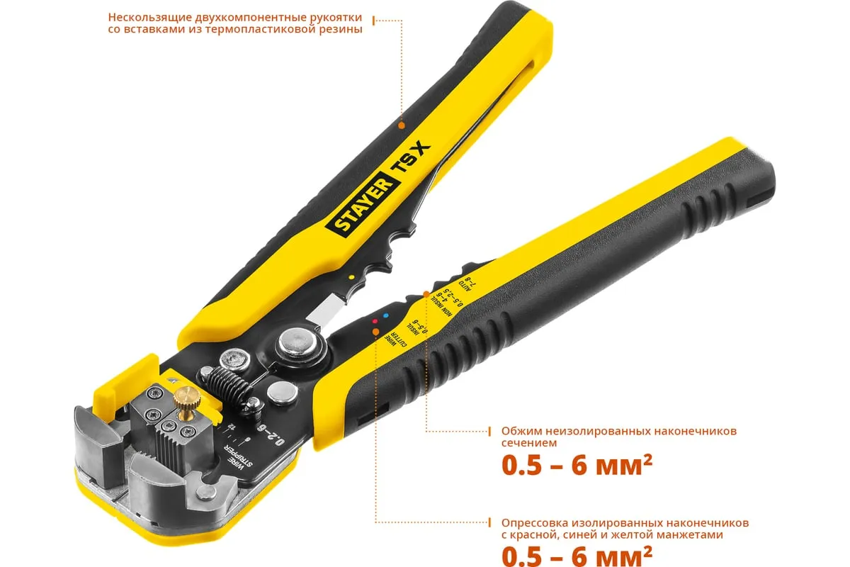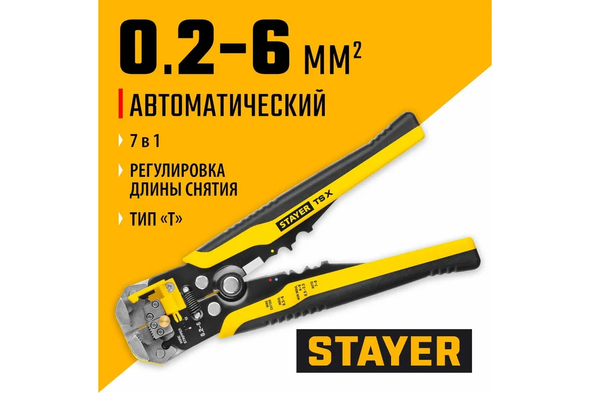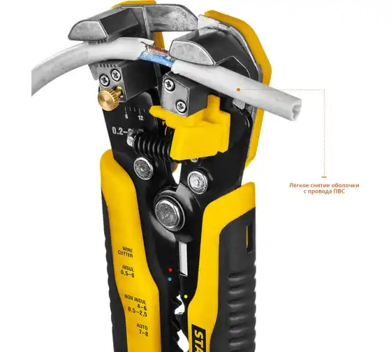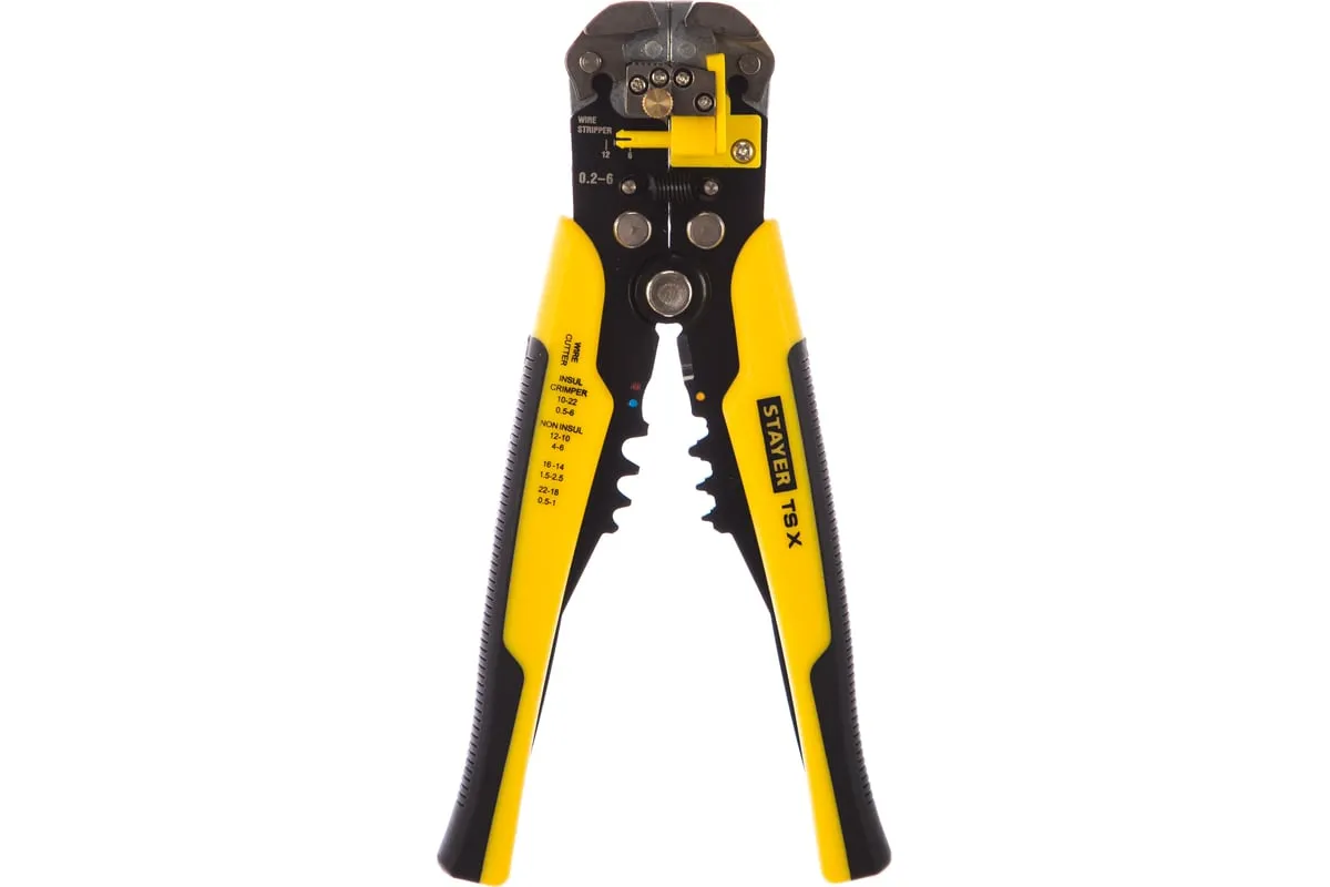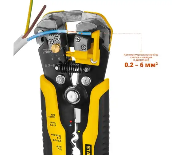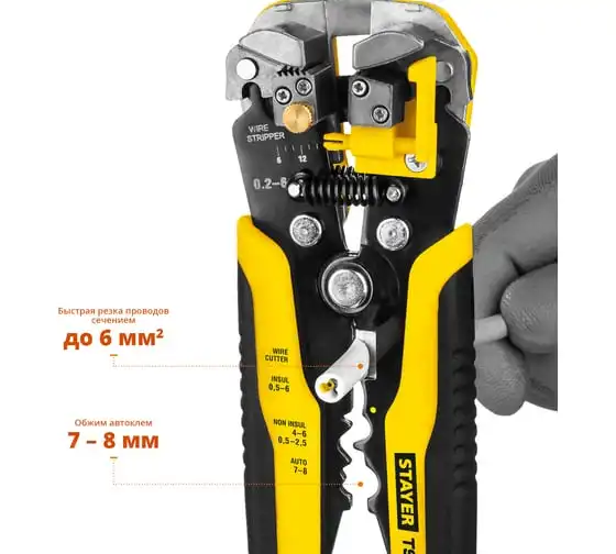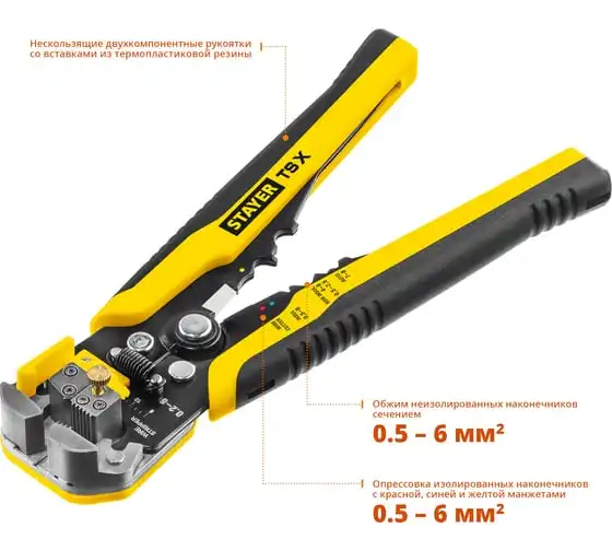 Автоматический многофункциональный стриппер STAYER TS-X 0.2 - 6 мм2 22655 обладает простой и понятной системой настройки. Данный инструмент служит для снятия изоляции при зачистке проводов и кабелей, опрессовки изолированных и неизолированных наконечников, резки кабелей, отрезания латунных болтов. Стриппер позволяет безопасно и без повреждений проводника снимать изоляцию с многожильных и многопроволочных кабелей. Также изделие удобно для снятия изоляции с плоских проводов. Инструмент оснащен усиленными прижимными губками, которые изготовлены из высокопрочной стали. Винт микронастройки позволяет работать с проводами различного сечения.