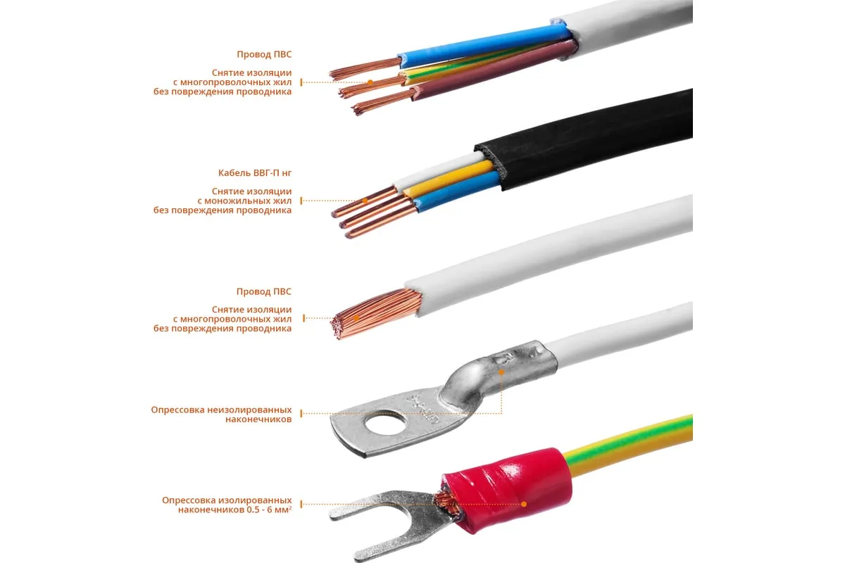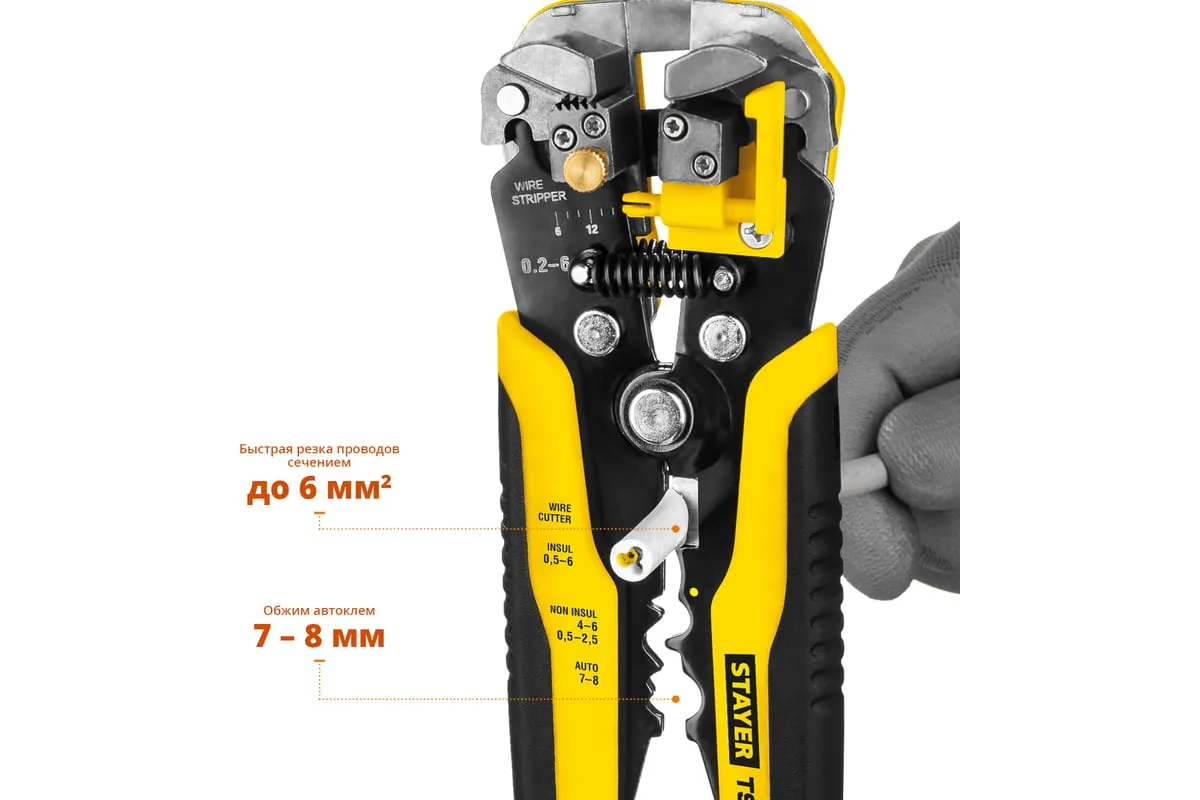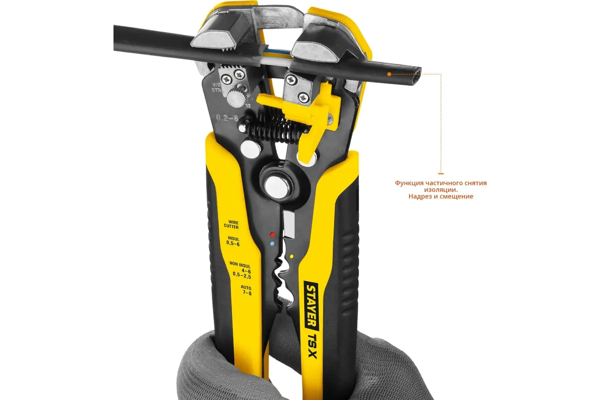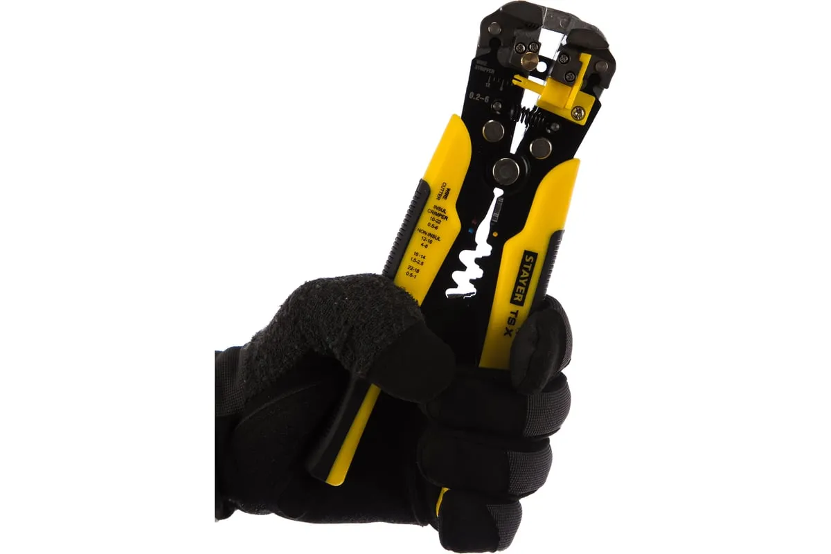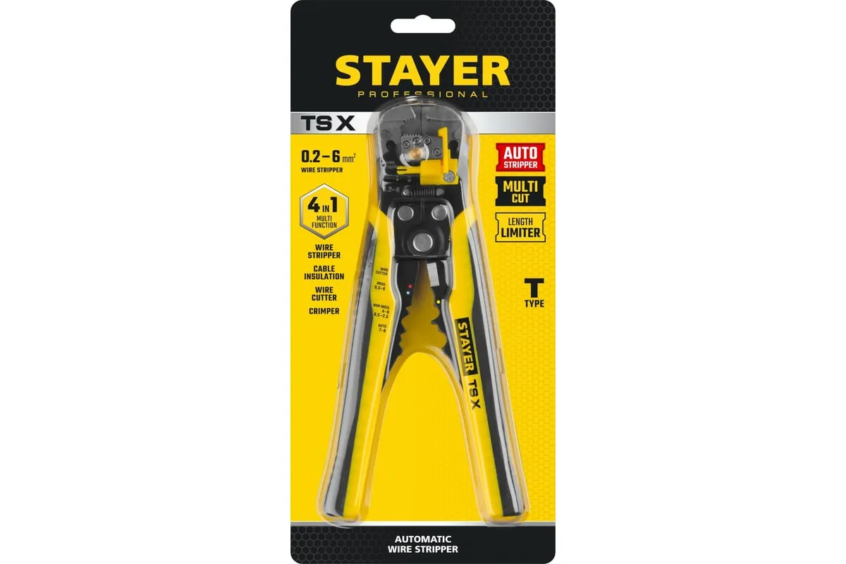 Автоматический многофункциональный стриппер STAYER TS-X 0.2 - 6 мм2 22655 обладает простой и понятной системой настройки. Данный инструмент служит для снятия изоляции при зачистке проводов и кабелей, опрессовки изолированных и неизолированных наконечников, резки кабелей, отрезания латунных болтов. Стриппер позволяет безопасно и без повреждений проводника снимать изоляцию с многожильных и многопроволочных кабелей. Также изделие удобно для снятия изоляции с плоских проводов. Инструмент оснащен усиленными прижимными губками, которые изготовлены из высокопрочной стали. Винт микронастройки позволяет работать с проводами различного сечения.