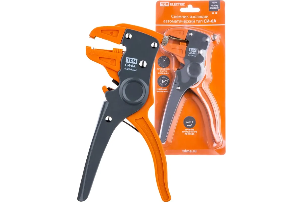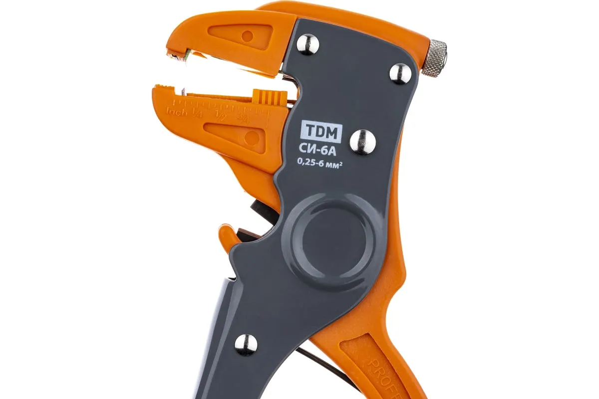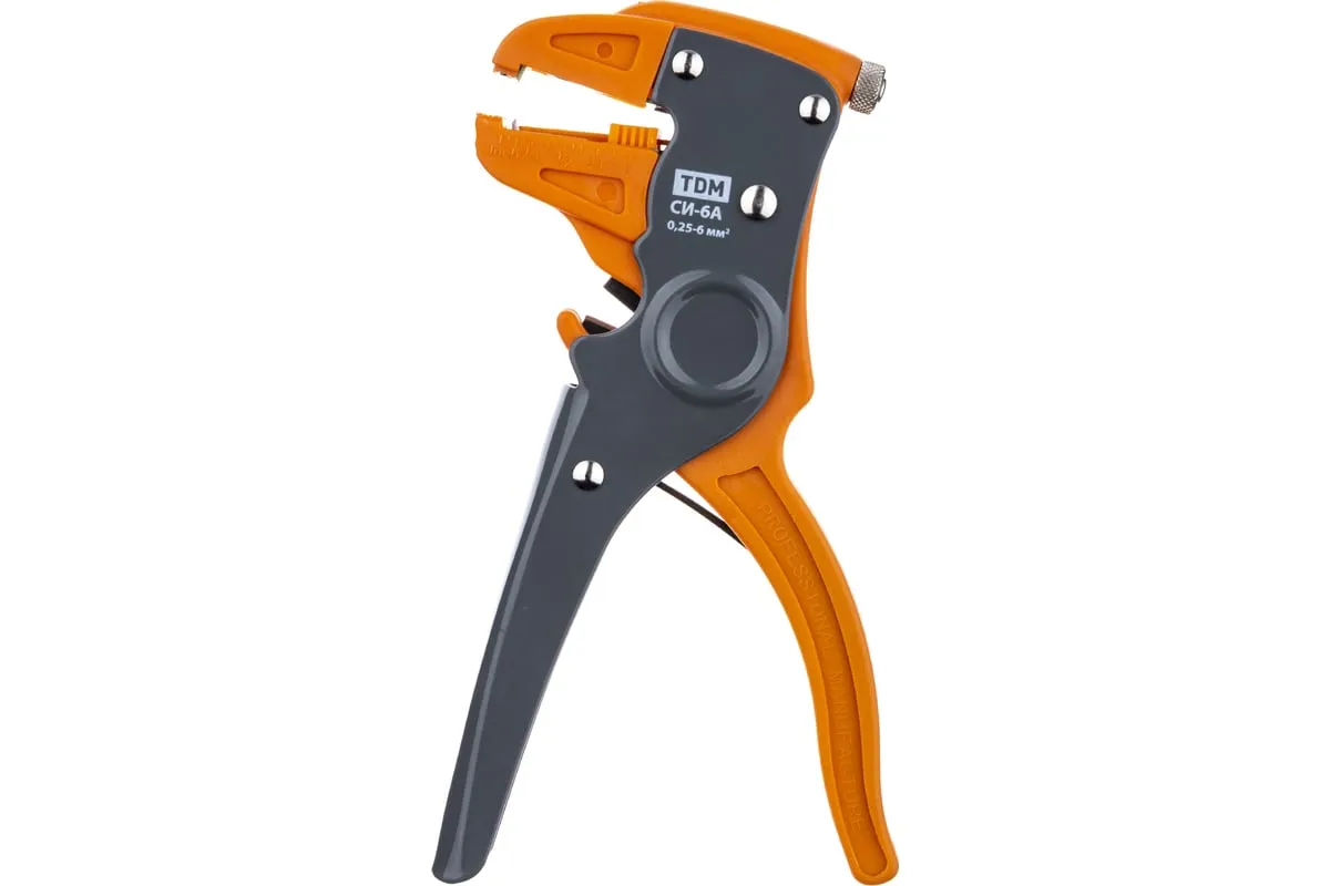 Автоматический съемник изоляции СИ-6А снимает изоляцию с кабеля сечением от 0,25 до 6 мм². Инструмент оснащен регулятором длины снимаемой изоляции и регулятором прижимного усилия.